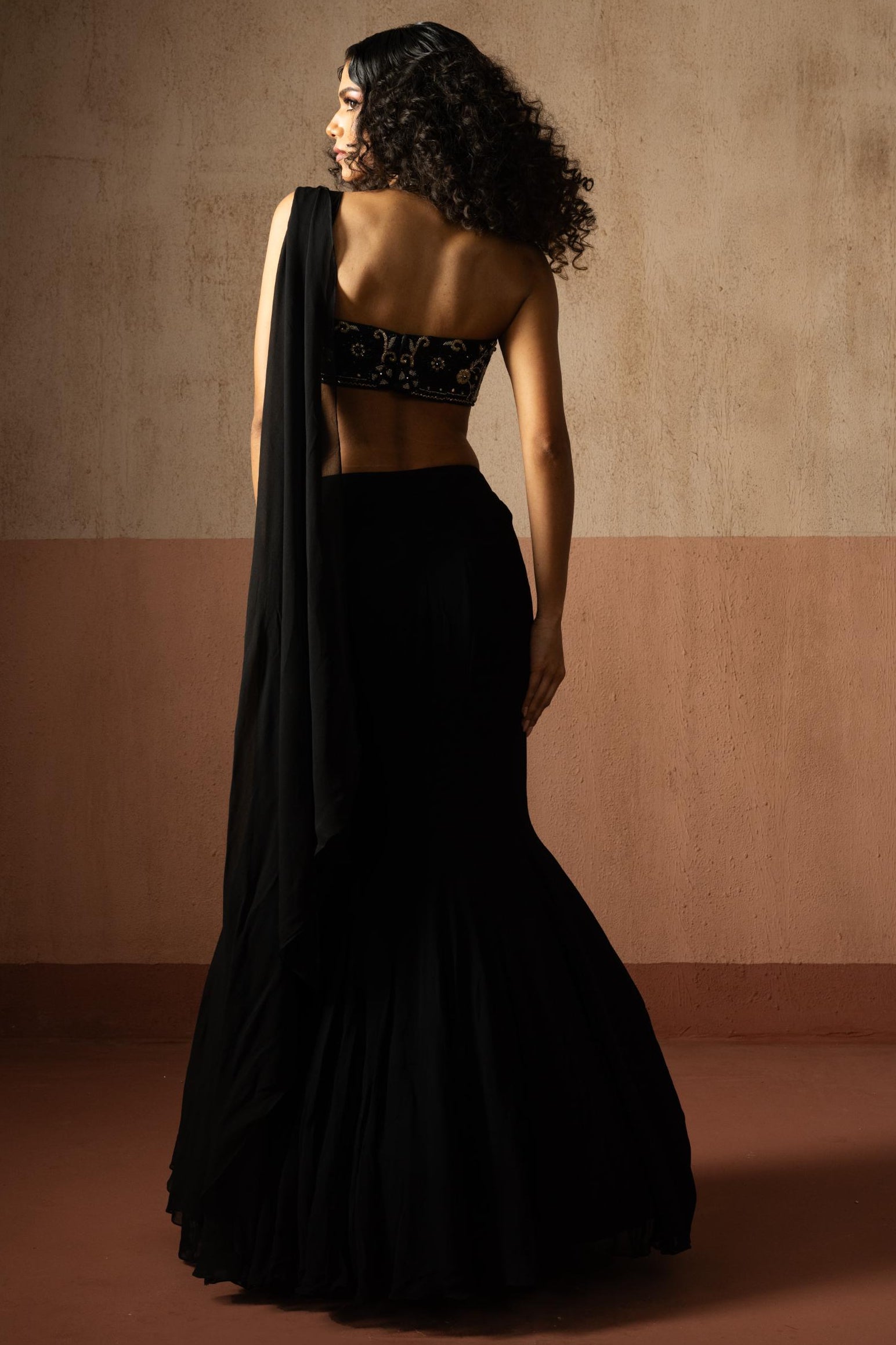 The Black Heer Fishtail Style Drape Saree is bold, sculpted, and fashion-forward—perfect for cocktail nights, sangeets, and statement evening events. The fishtail silhouette adds dramatic structure, creating a look that is modern, sleek, and effortlessly glamorous.