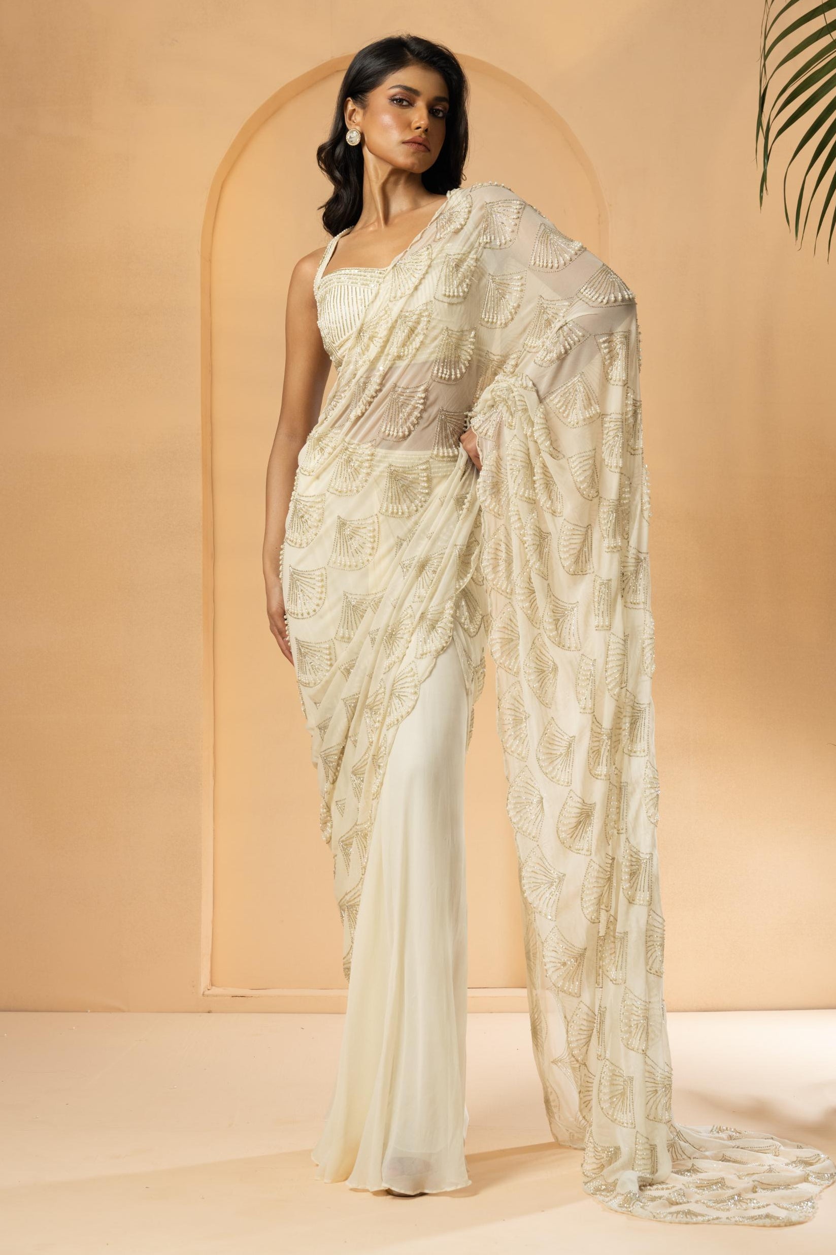The ivory embroidered the first bloom drape saree by Quench a Thirst is curated for refined wedding and festive occasions. Designed with delicate embroidery and a pre-draped silhouette, this saree offers elegance with ease. The soft ivory palette enhances its versatility, making it ideal for daytime weddings, engagement ceremonies, and intimate celebrations. The draped construction ensures comfort while maintaining a graceful fall. This saree is perfect for those seeking contemporary Indian wear that balances craftsmanship with modern styling.
