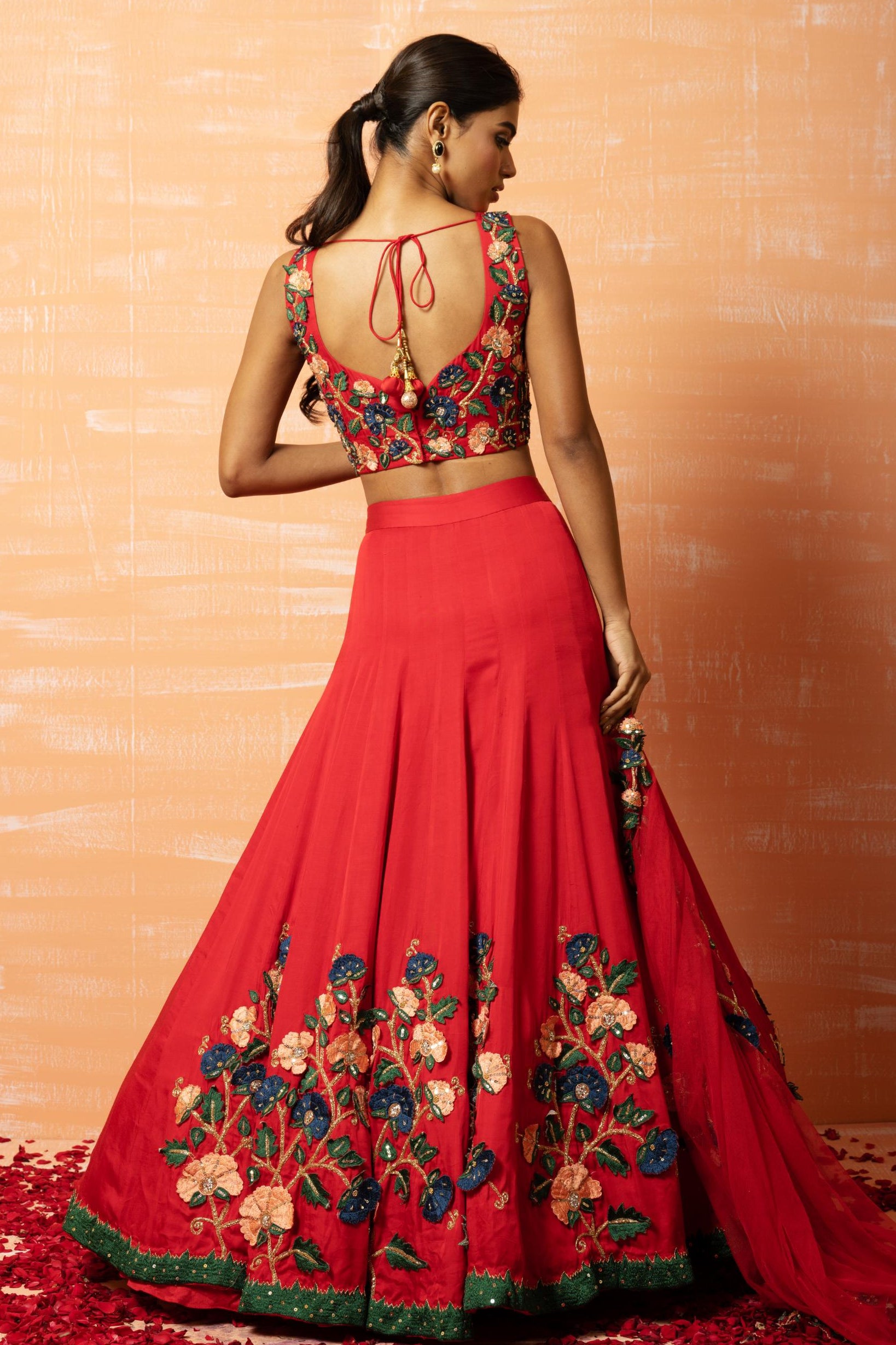 Bold and striking, this lehenga set blends deep red tones with 3D artistry. Lightweight structure keeps the lehenga set comfortable for long festivities. Ideal for sangeets or receptions, this lehenga set offers dramatic movement. Sculpted tailoring enhances the lehenga set elegantly. A statement look, this lehenga set commands festive attention. Refined and vibrant, this lehenga set elevates grand celebrations.