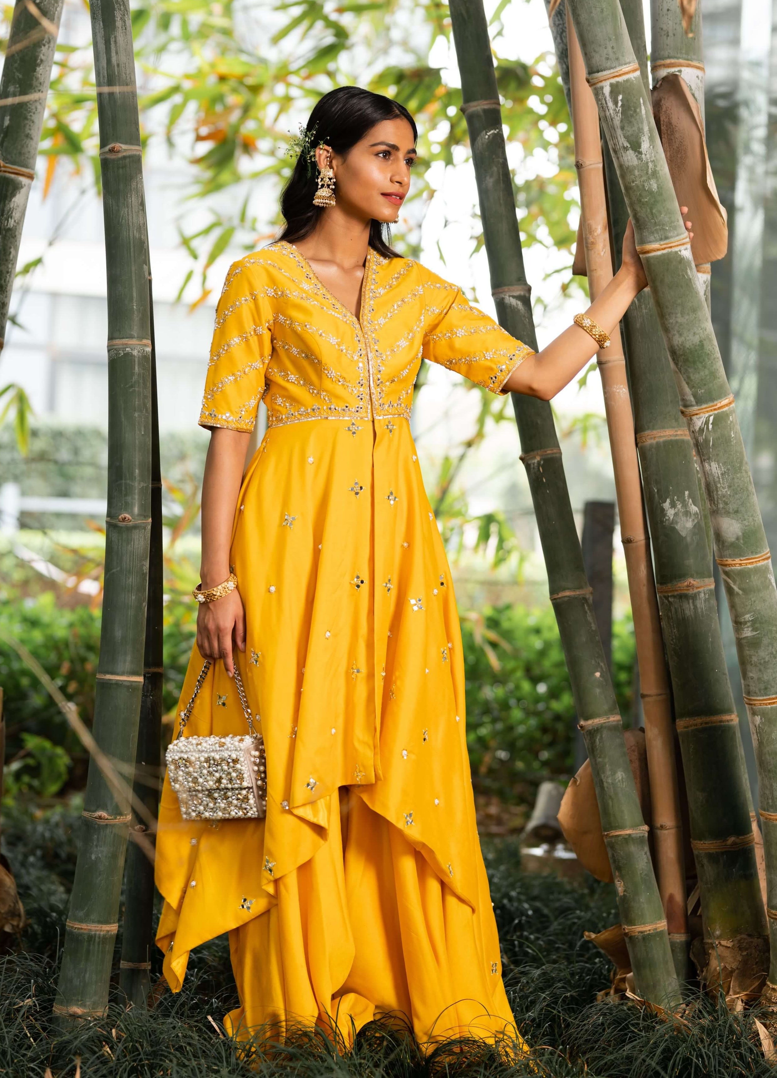 Dress in understated elegance with the yellow silk asymmetrical kurta paired gracefully with silk sharara pants. The asymmetrical kurta, crafted from luxurious silk, offers a modern silhouette with its unique design. Complementing this ensemble are the silk sharara pants, providing comfort and a flowing, graceful appearance. Perfect for festive occasions and celebrations, this outfit combines traditional richness with contemporary style, ensuring you radiate sophistication and charm with every step. Ideal for those seeking a blend of cultural heritage and modern flair, this ensemble exudes refined elegance and timeless appeal.