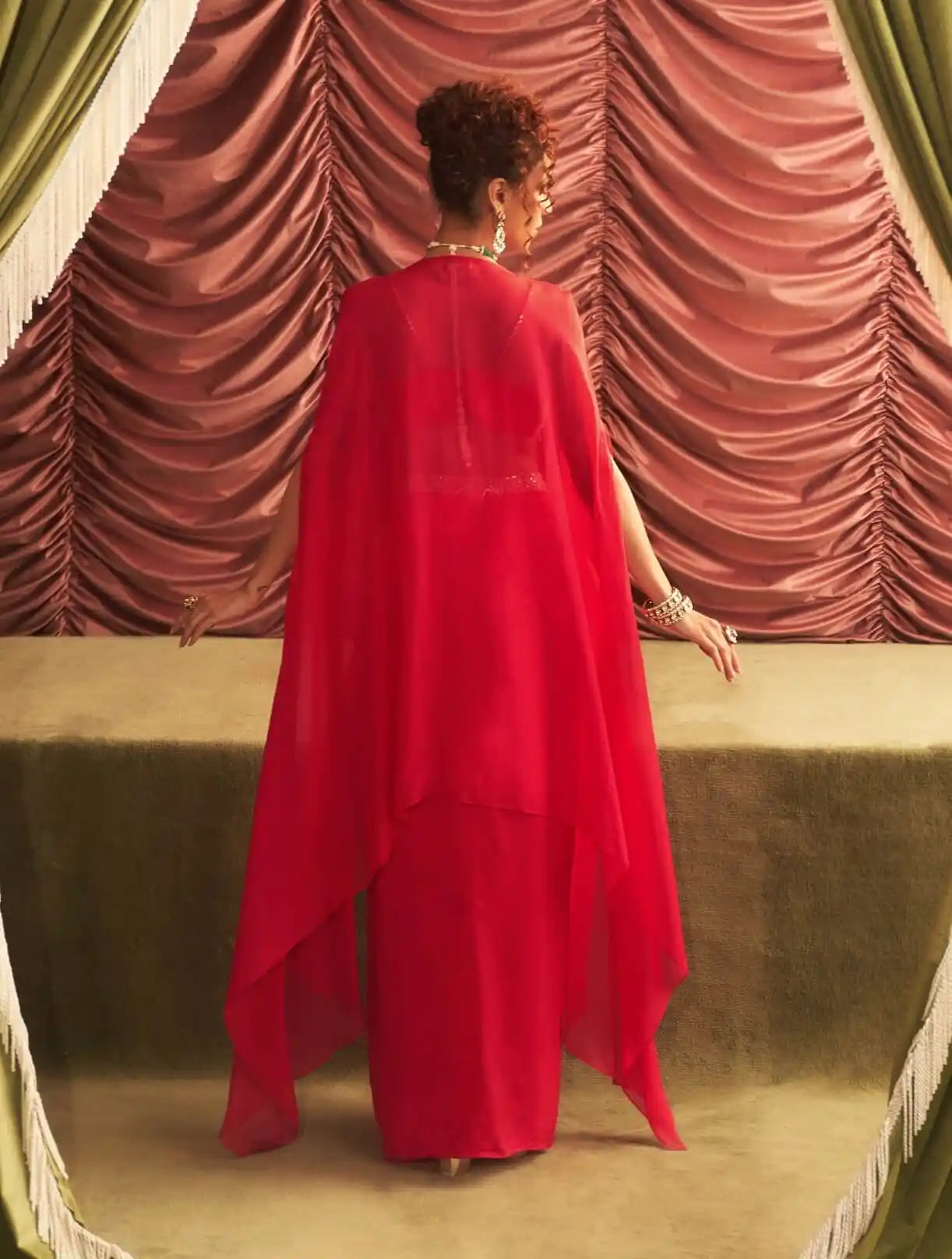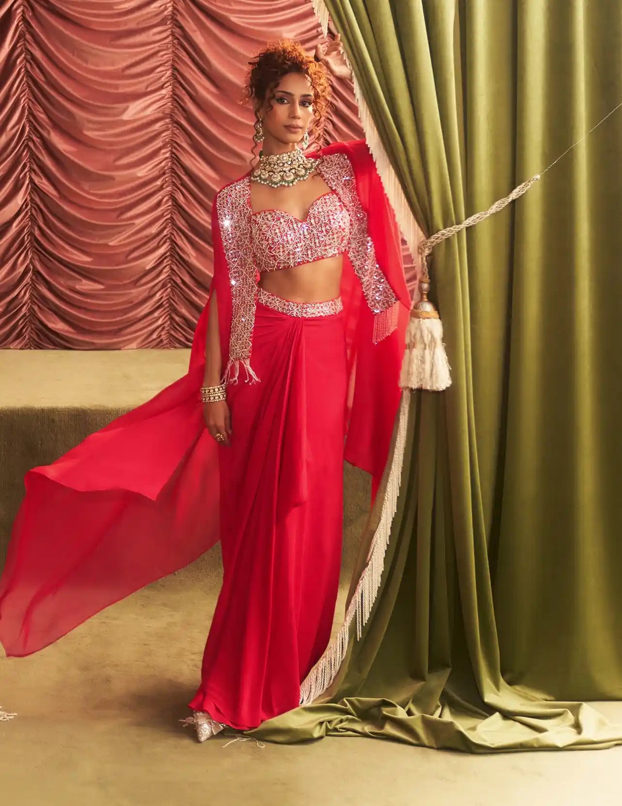 Step into elegance with our rani pink embellished choli, cape, and draped skirt set. The beautifully crafted choli features intricate embellishments that catch the light, adding a touch of glamour to your ensemble. The flowing cape drapes effortlessly, providing a chic layer that elevates the overall look. The draped skirt offers a flattering silhouette, ensuring comfort and style as you move. Perfect for weddings, festive occasions, or upscale gatherings, this set beautifully blends traditional charm with modern flair, making you the center of attention wherever you go.