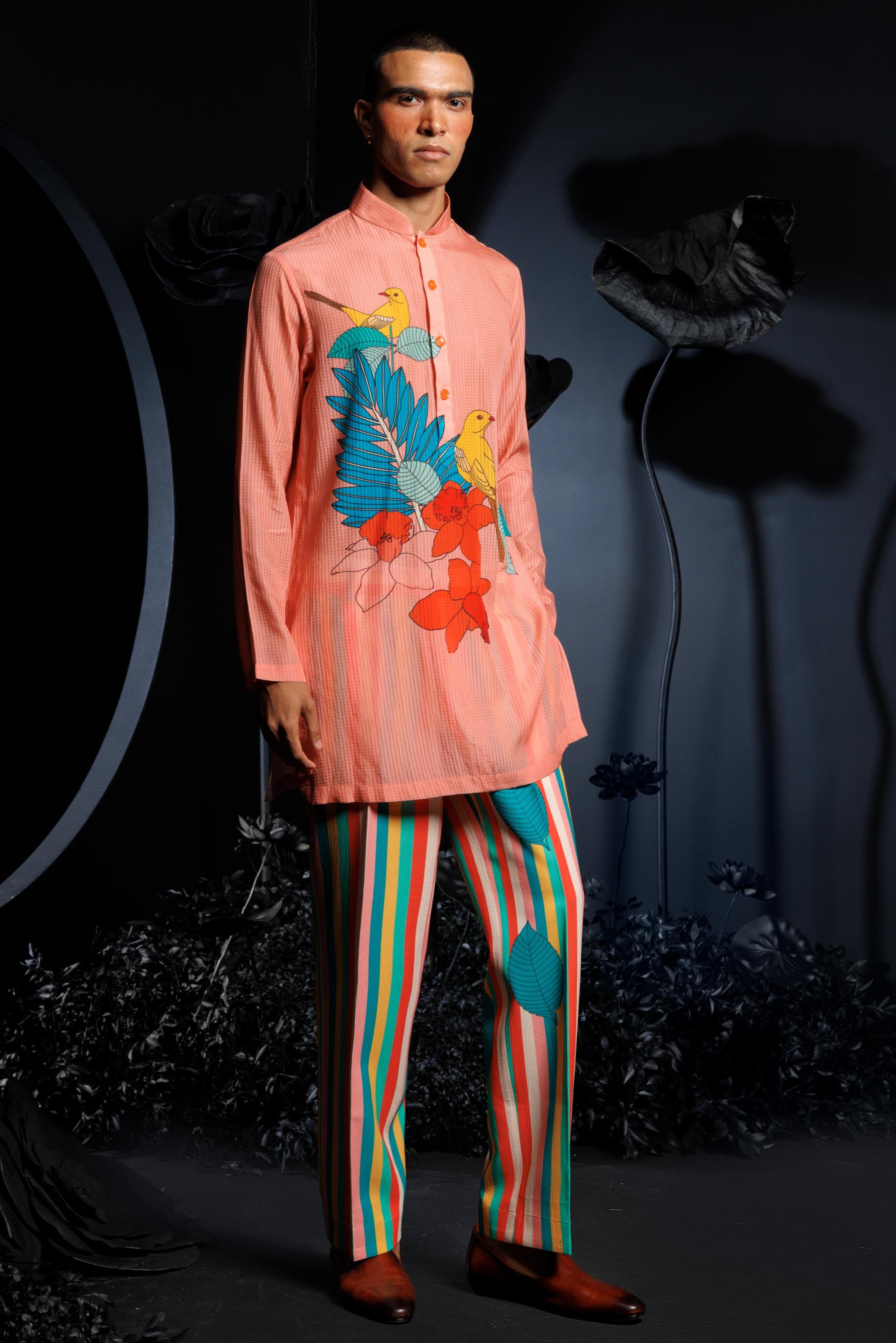 The Rainbow Kurta Set from Nautanky is a vibrant peach-colored kurta paired with multicolored striped pants, perfect for Mehendi or sundowner parties. This playful ensemble features hand-embroidered sequins and beads, adding elegance and charm. Crafted from soft silk for comfort, the sleeveless design enhances its contemporary appeal, making it an ideal choice for lively, festive occasions.