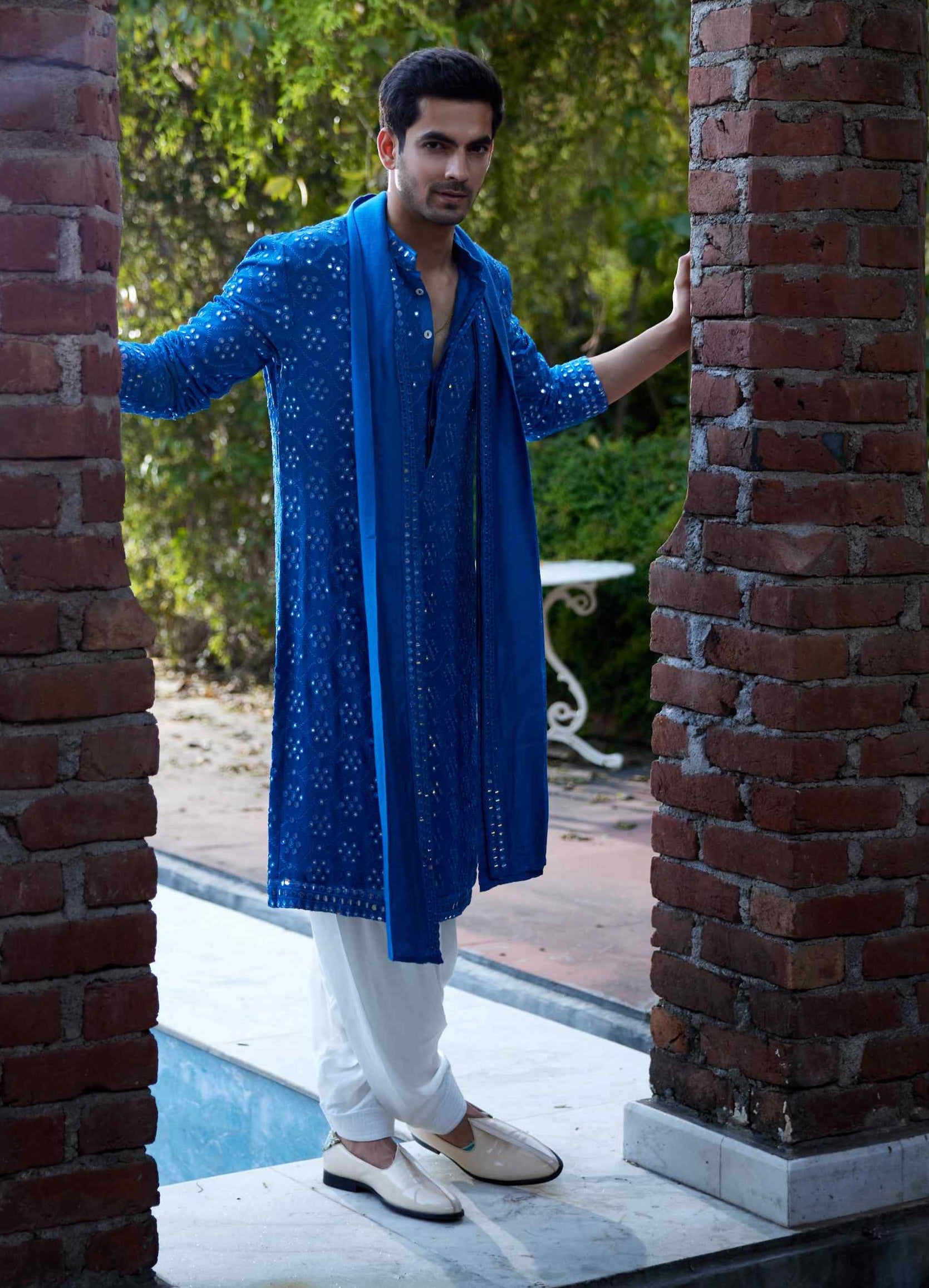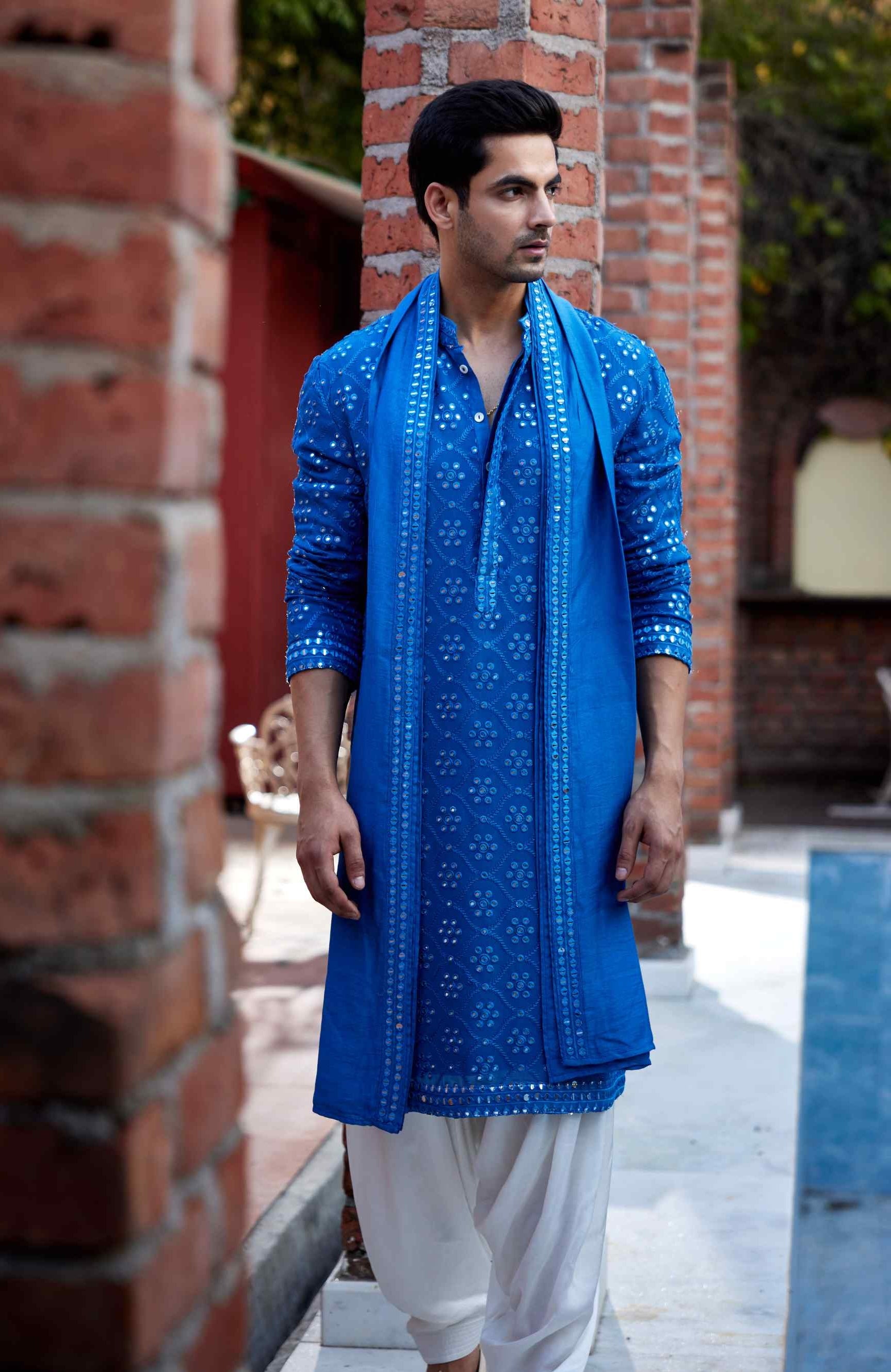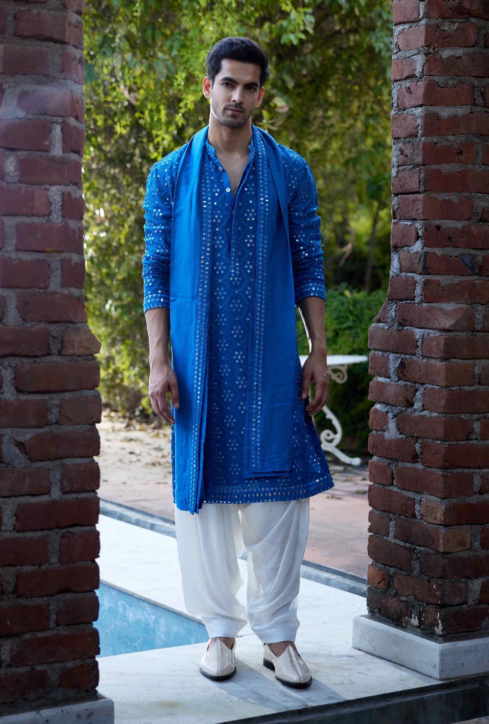 Elevate your style with our azure blue mirror work kurta, perfect for haldi, mehndi, or sangeet occasions. The vibrant azure blue hue and intricate mirror work create a mesmerizing look. Paired with an off-white salwar and azure blue stole, this kurta exudes elegance and charm. Stand out in the crowd and make a stylish statement at your next celebration.