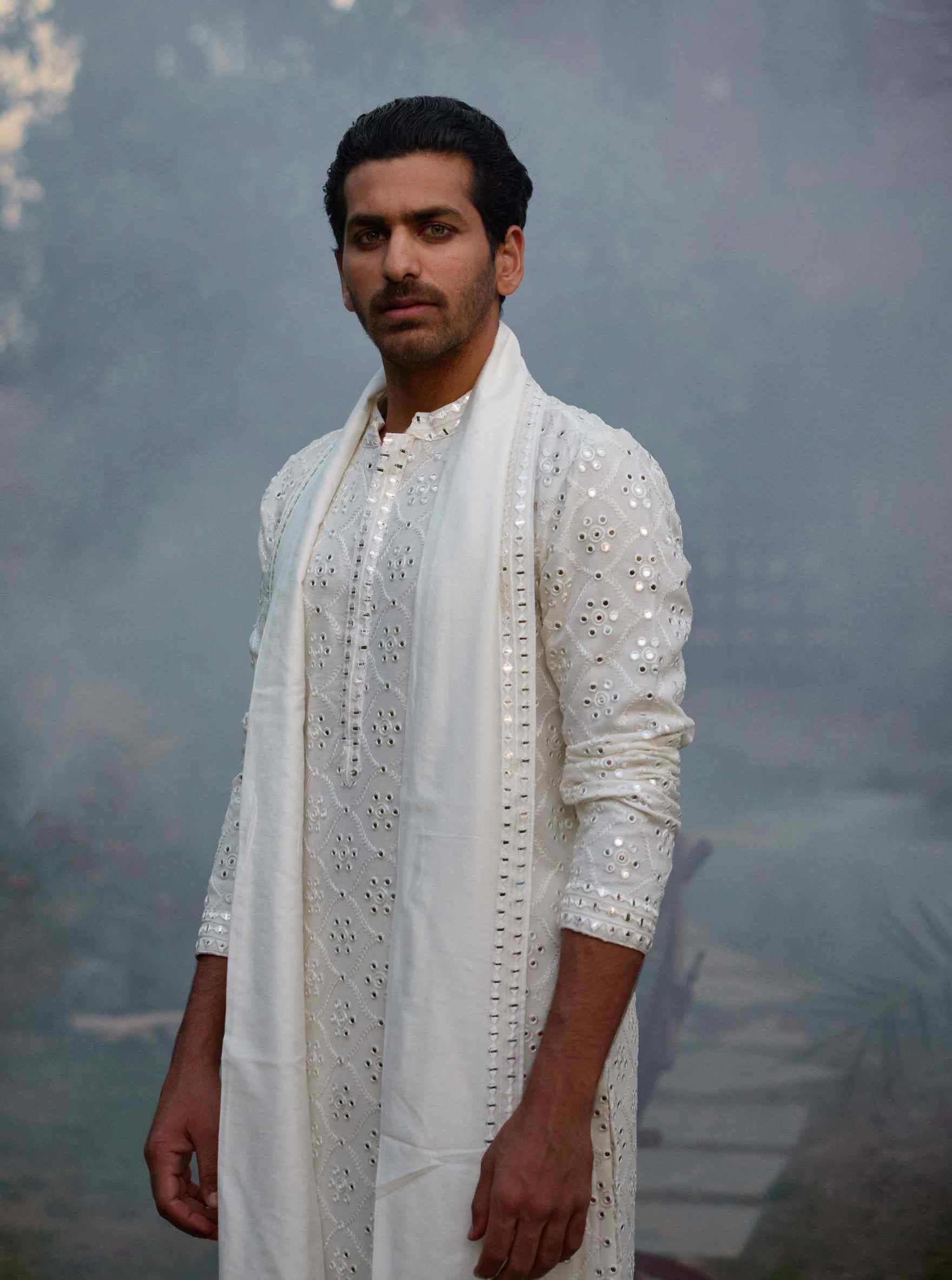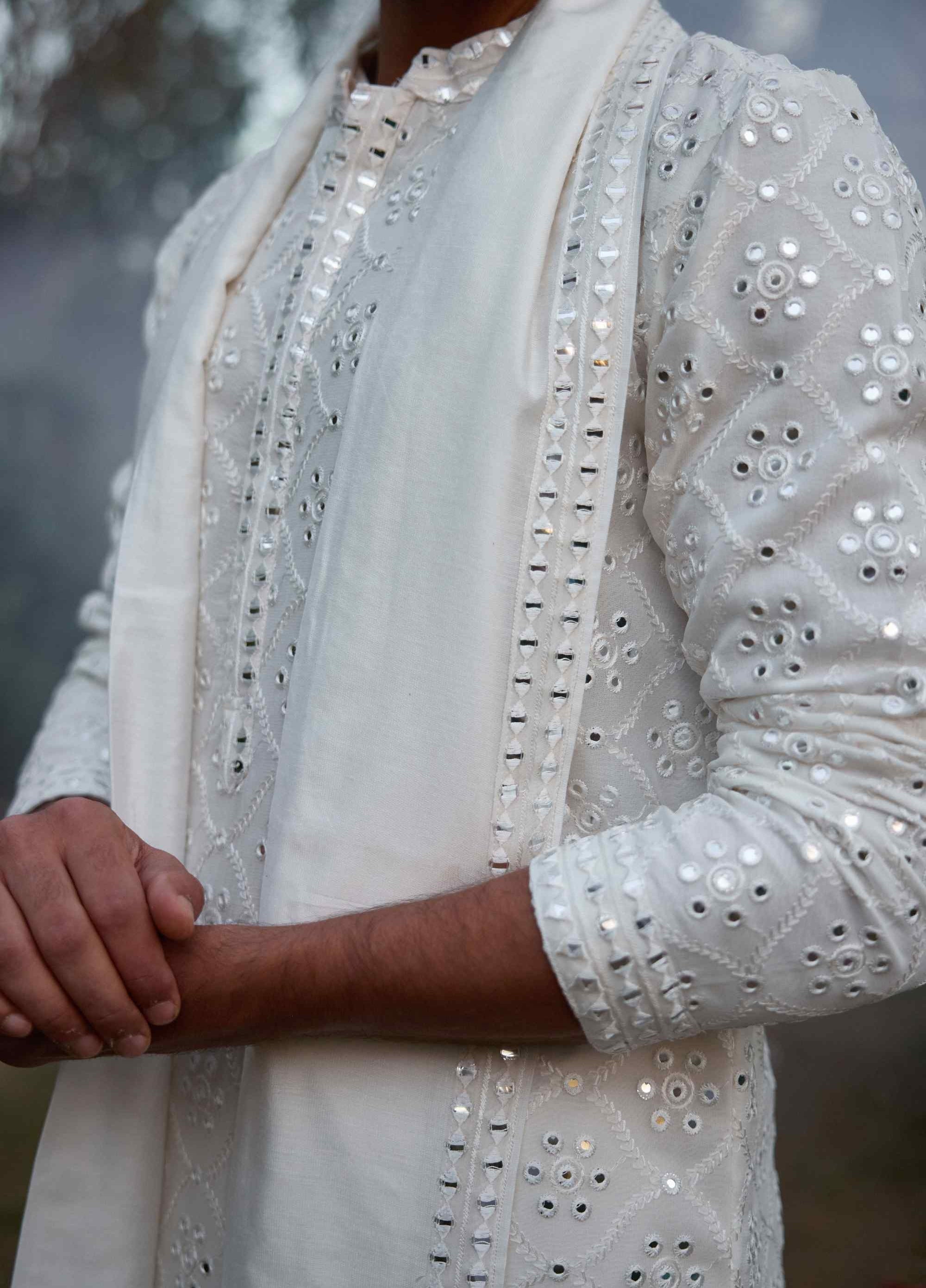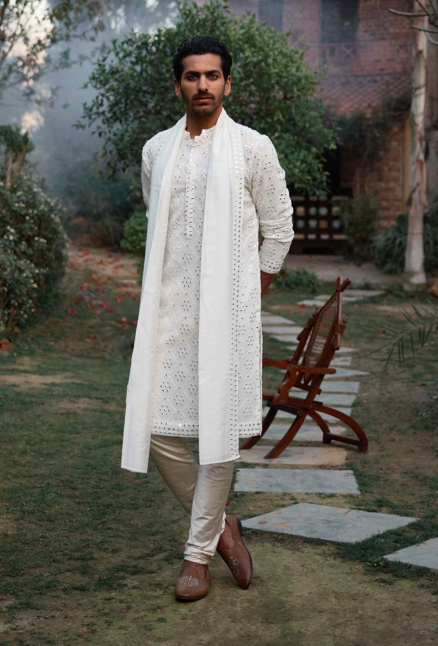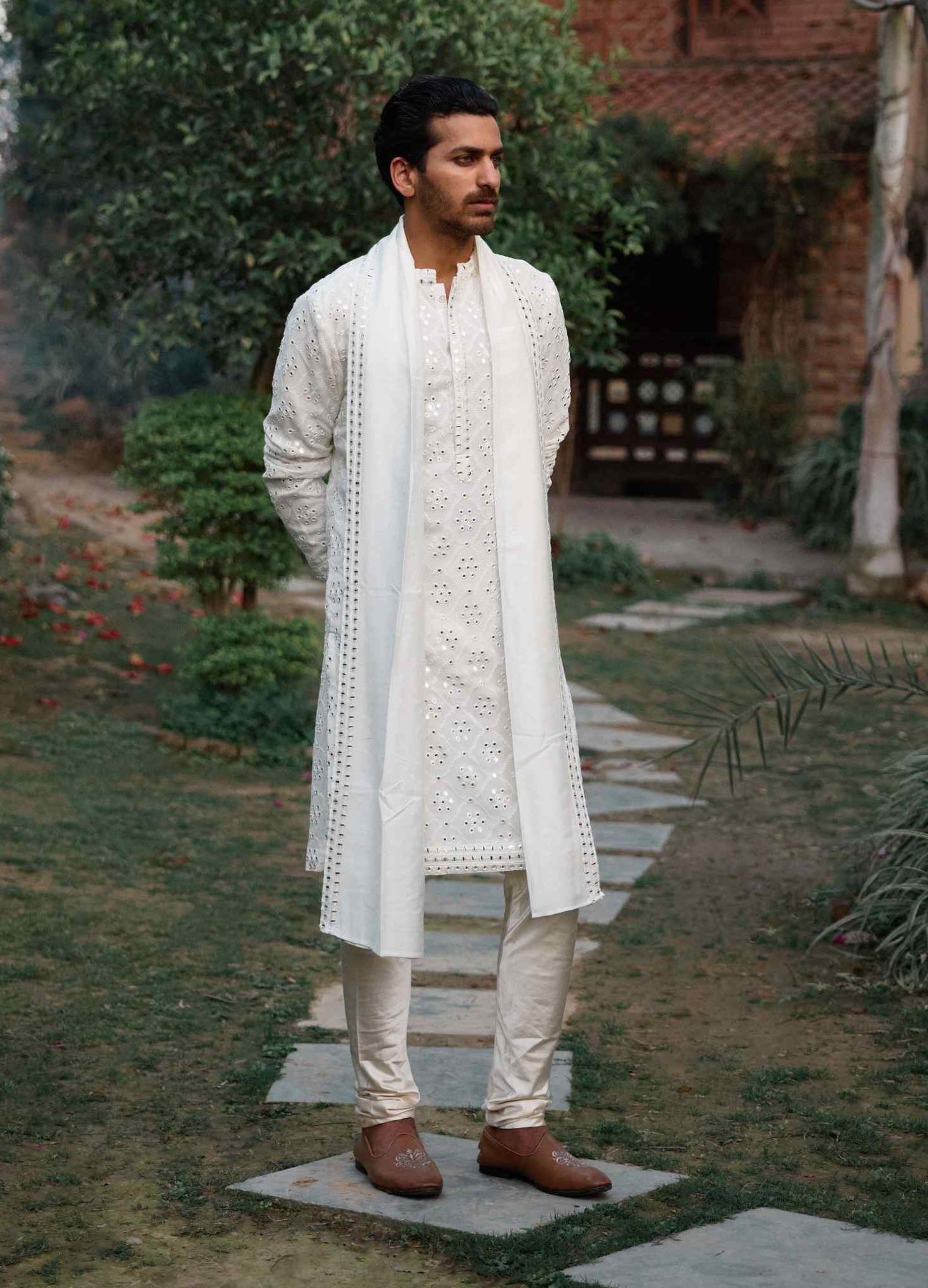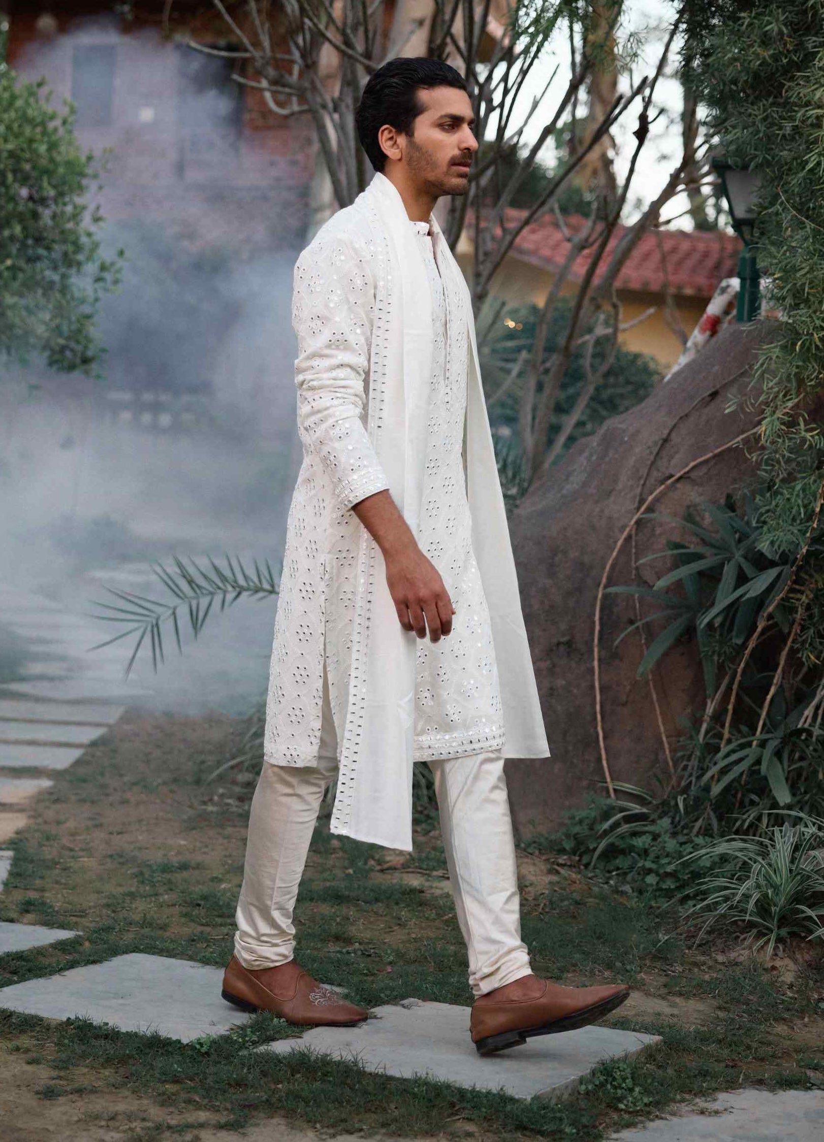 The Ranbir Kurta in ivory is a stylish choice for grooms, perfect for haldi, mehndi, or sangeet. Made from a blend of viscose cotton silk and georgette, it offers smooth comfort with intricate machine embroidery adding sophistication. Paired with an ivory salwar, this ensemble ensures a seamless, elegant look for any pre-wedding celebration.