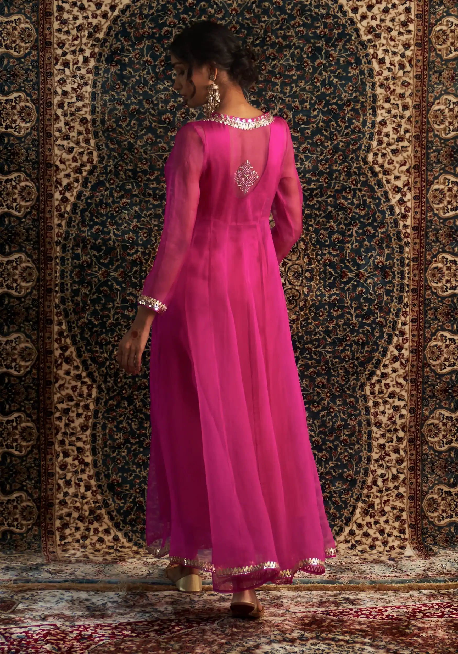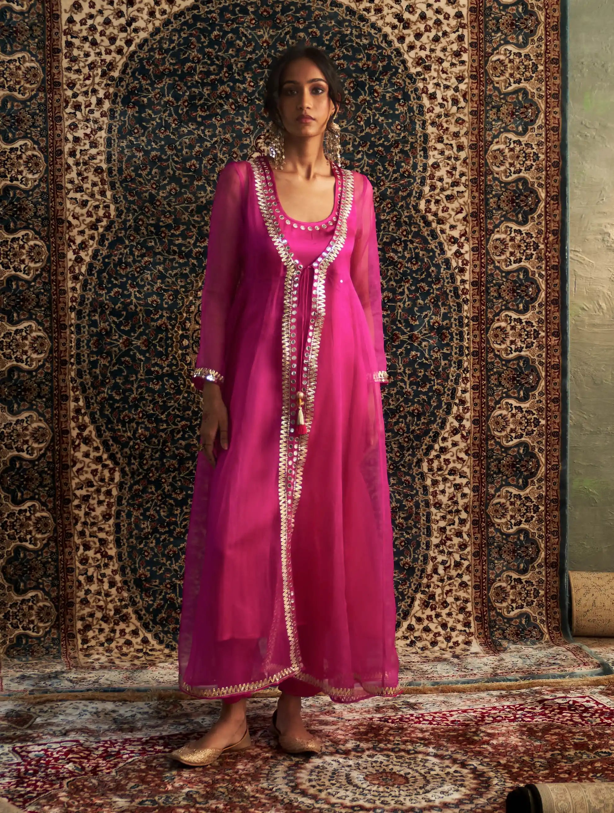 Our long-sleeved, flowy sheer choga is crafted from lustrous organza, offering an effortlessly luxurious aesthetic. Adorned with intricate gota, mirror, and sequin hand embroidery along the neckline and sleeves, this piece sparkles with artisanal charm. The front features dori tie-ups and elegant tassels, adding a touch of quaint sophistication.