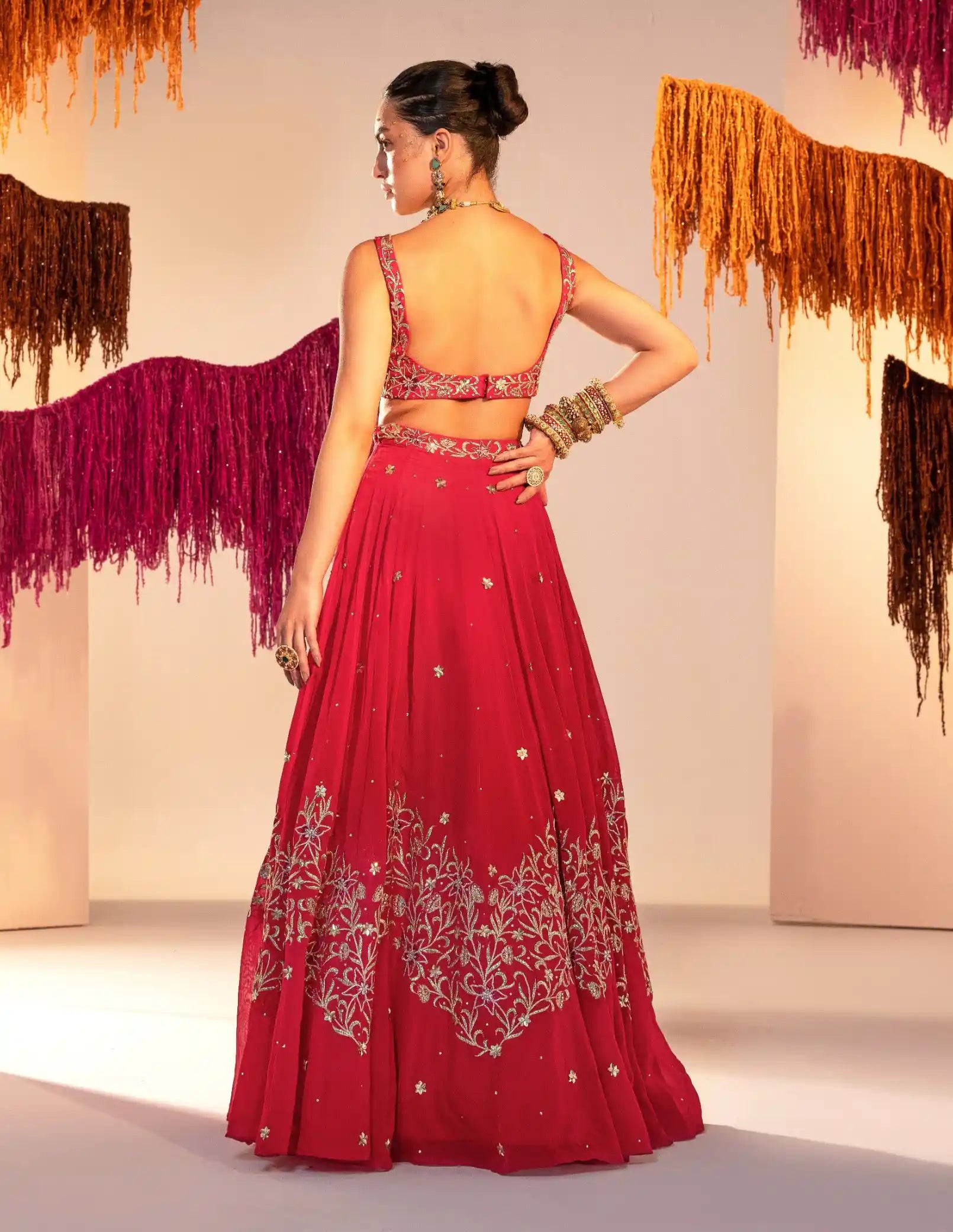 Make a dazzling statement in our rani pink embroidered backless blouse, paired with a flowing lehenga and an exquisite embroidered dupatta. This eye-catching set features intricate embroidery and a stylish backless design, blending modern allure with traditional elegance. Perfect for weddings or special occasions, it’s a standout choice that ensures all eyes are on you!