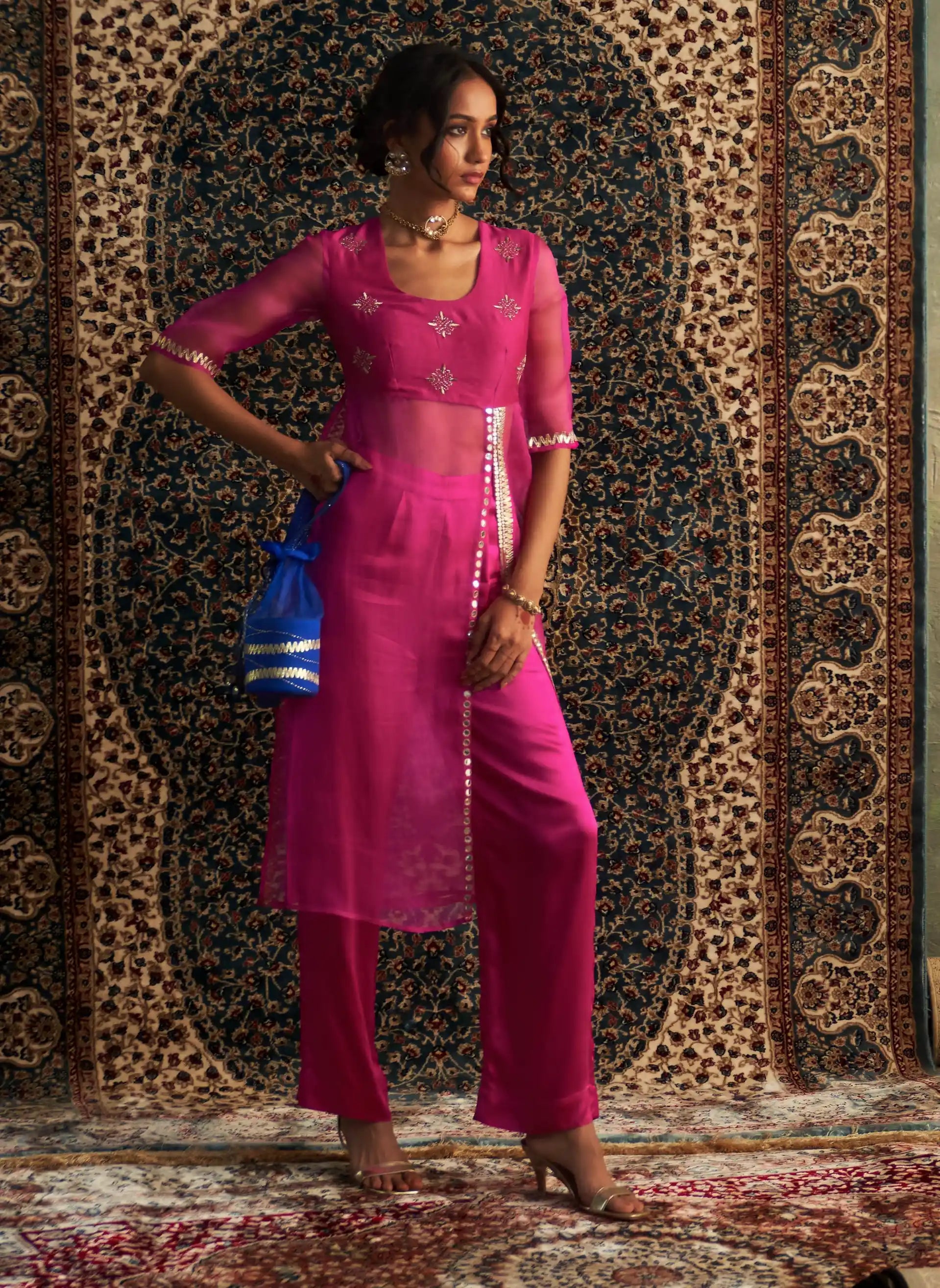 This rani pink kurta beautifully blends timeless charm with modern sophistication. The bustier, crafted from luxurious chanderi fabric, features delicate dabka and zari embroidery, adding a regal touch to the ensemble. The ethereal organza flare of the kurta is enhanced by intricate mirror and gota work, complemented by a stylish front slit that creates a graceful silhouette.