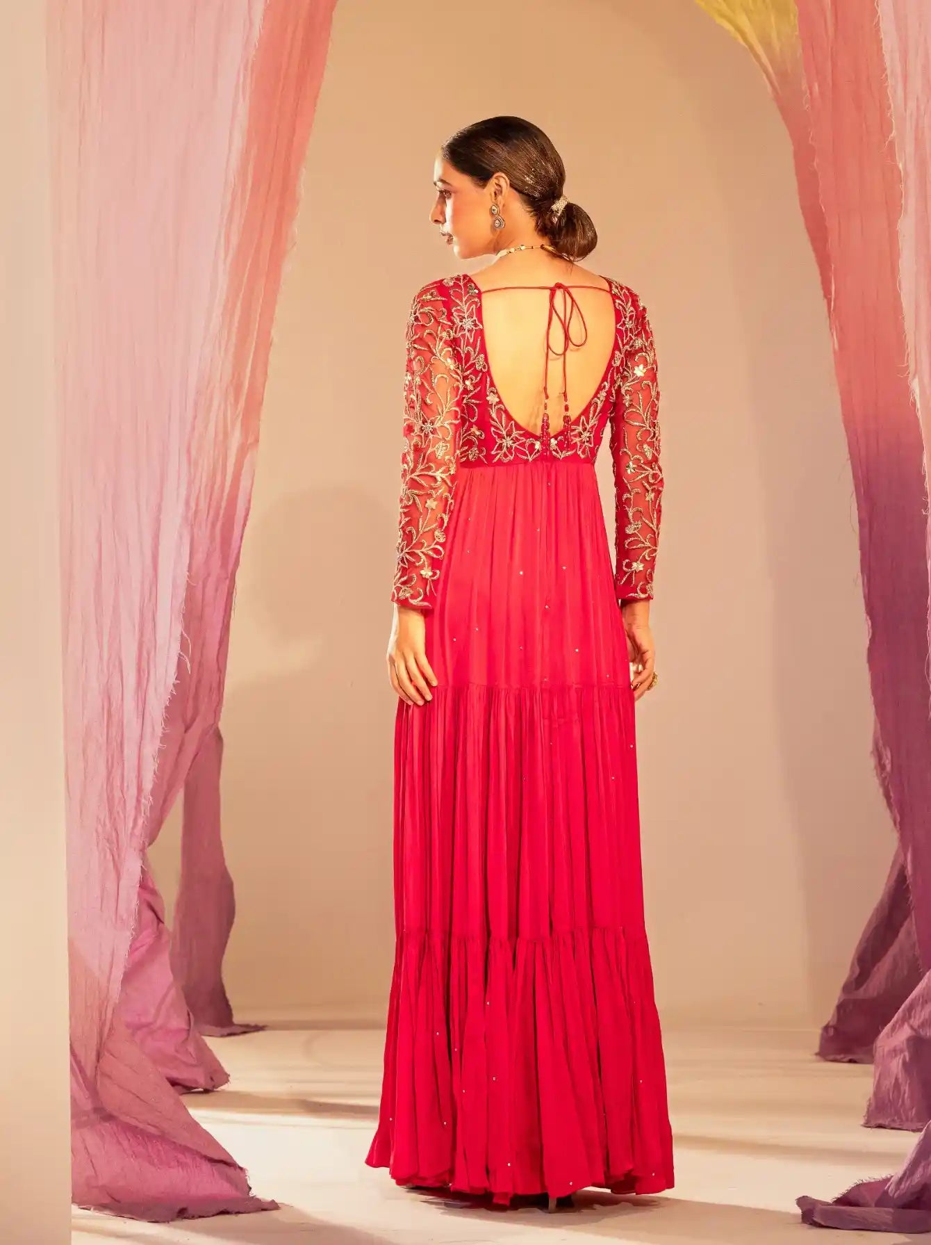 Radiate elegance with our rani pink embroidered v hem full sleeve 3-tiered anarkali set. This stunning ensemble features intricate embroidery and a flattering v hem, complemented by flowing tiers that add movement and grace. Perfect for festive occasions or special celebrations, it effortlessly combines traditional charm with contemporary style, ensuring you make a lasting impression!