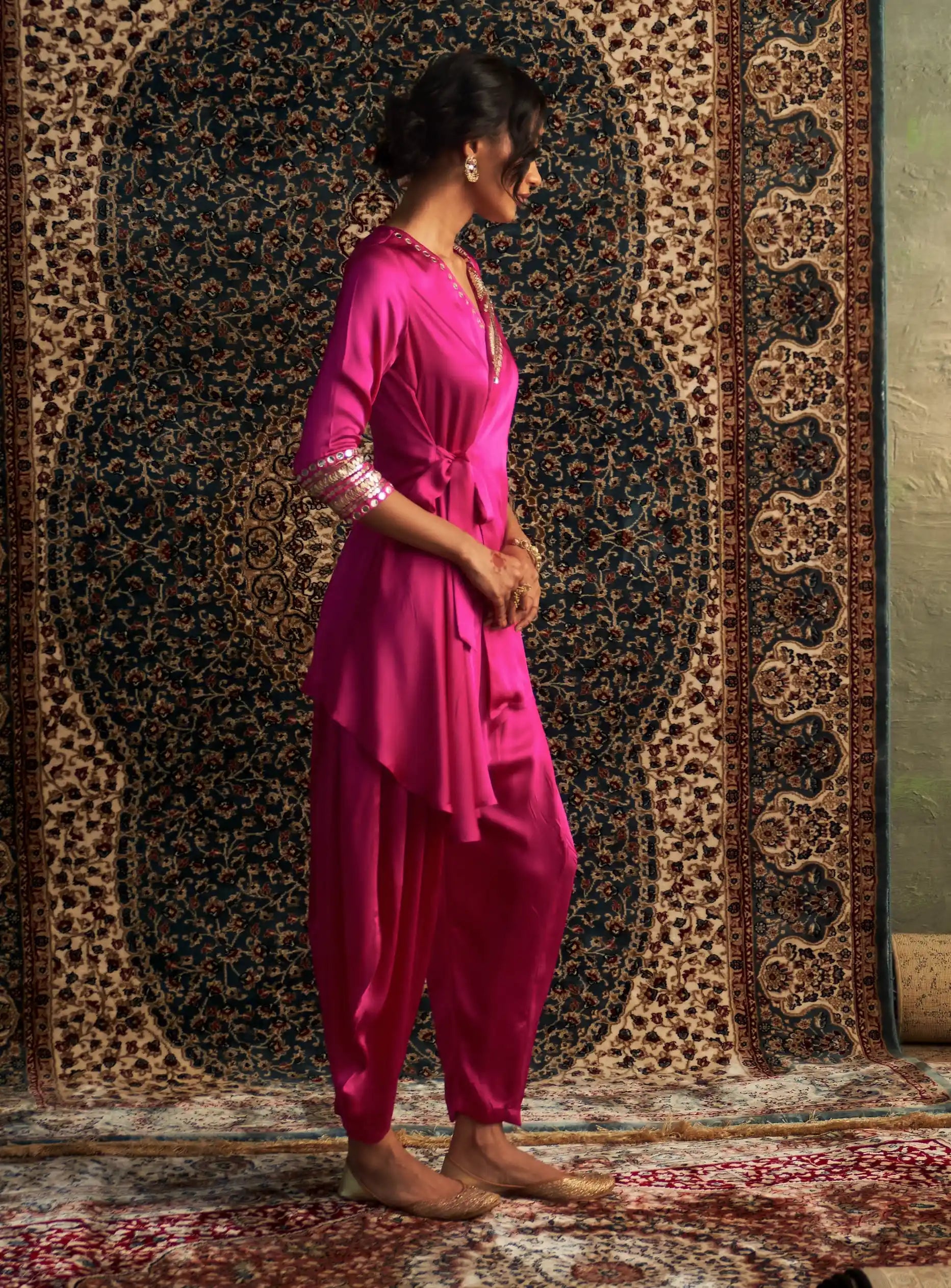 The rani pink wrap kurta is a sophisticated and versatile statement piece, showcasing intricate embroidery on the lapel for an elegant touch. Its adjustable design ensures a flattering fit for all body types, combining style with comfort.