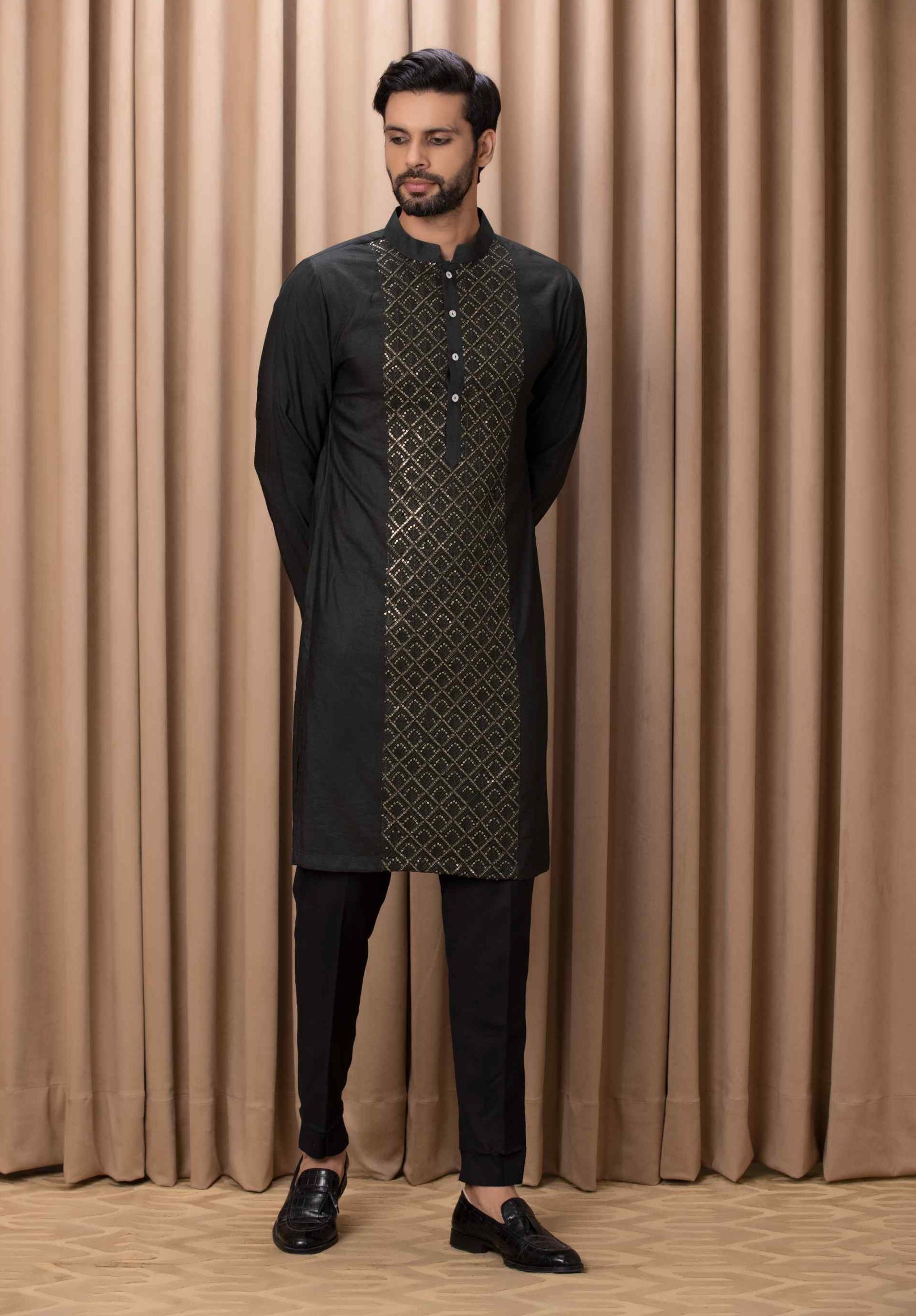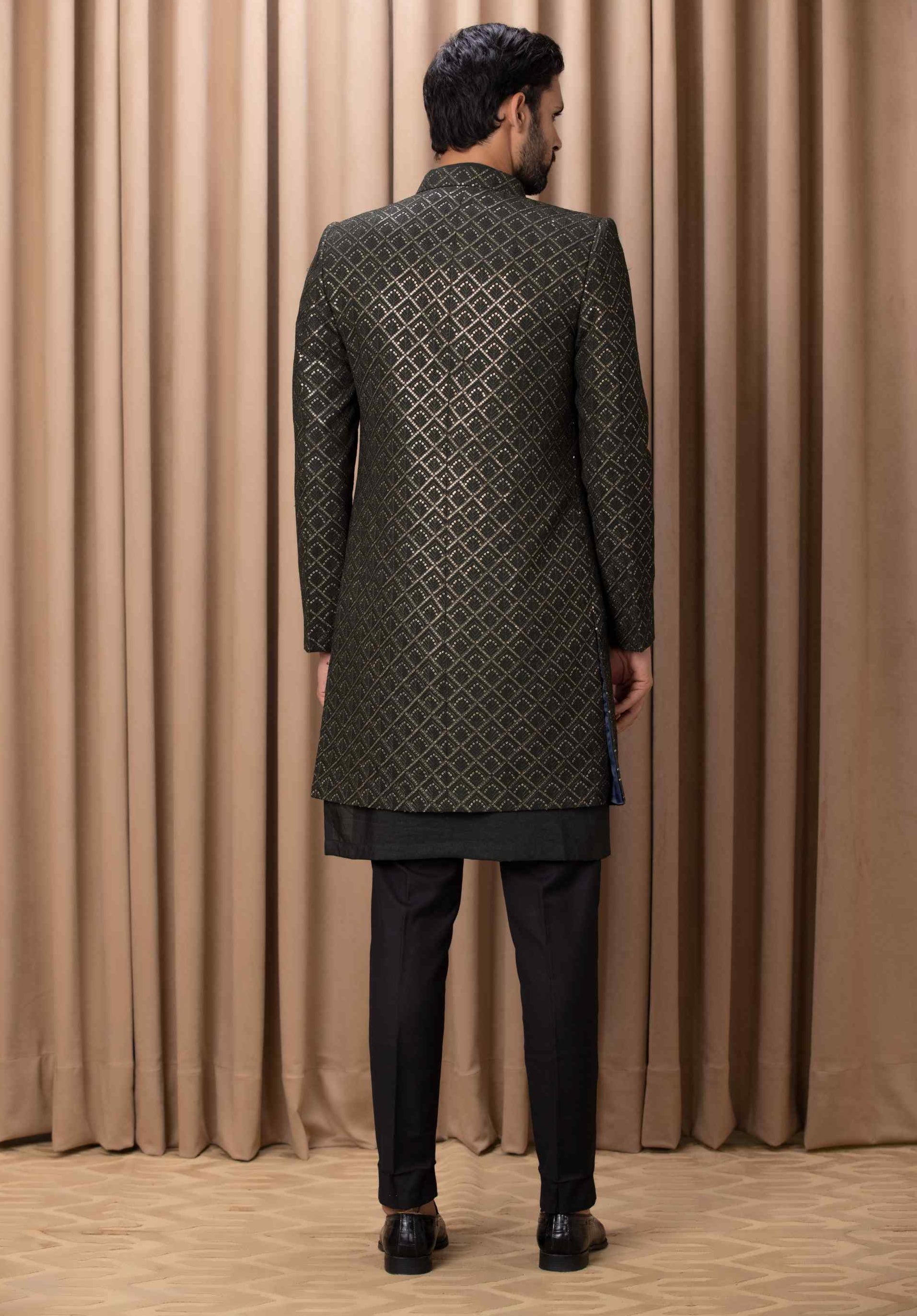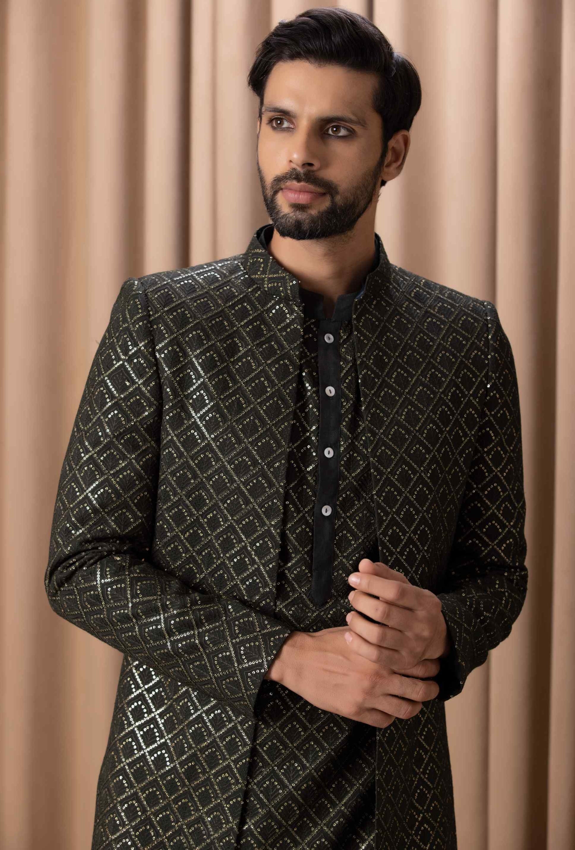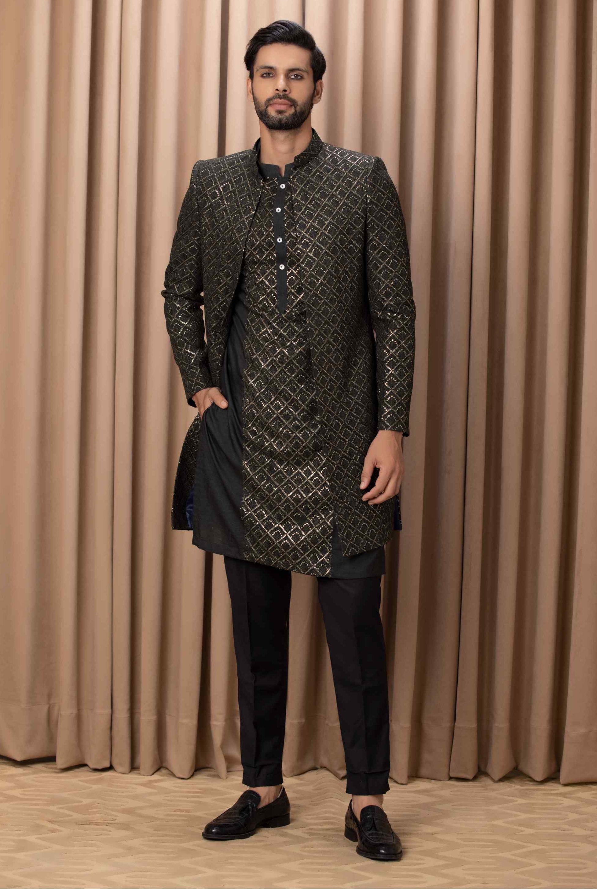 Elevate your style with our contemporary olive green Indo-Western set, meticulously crafted with intricate thread embroidery. Ideal for a sagan or cocktail event, this ensemble combines a richly detailed embroidered jacket with a coordinating kurta. Paired with sleek black suiting trousers, it offers a sophisticated balance of modern elegance and traditional craftsmanship. Perfect for those who wish to make a refined statement with a touch of distinctive flair.