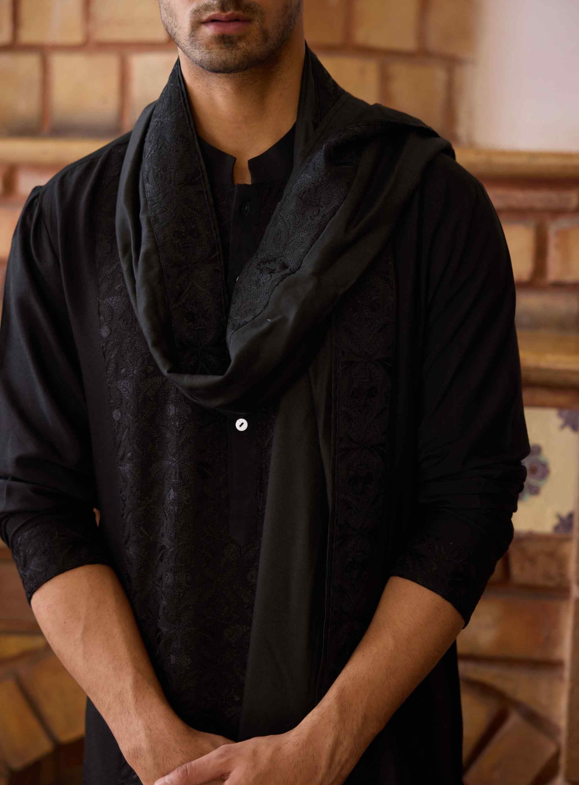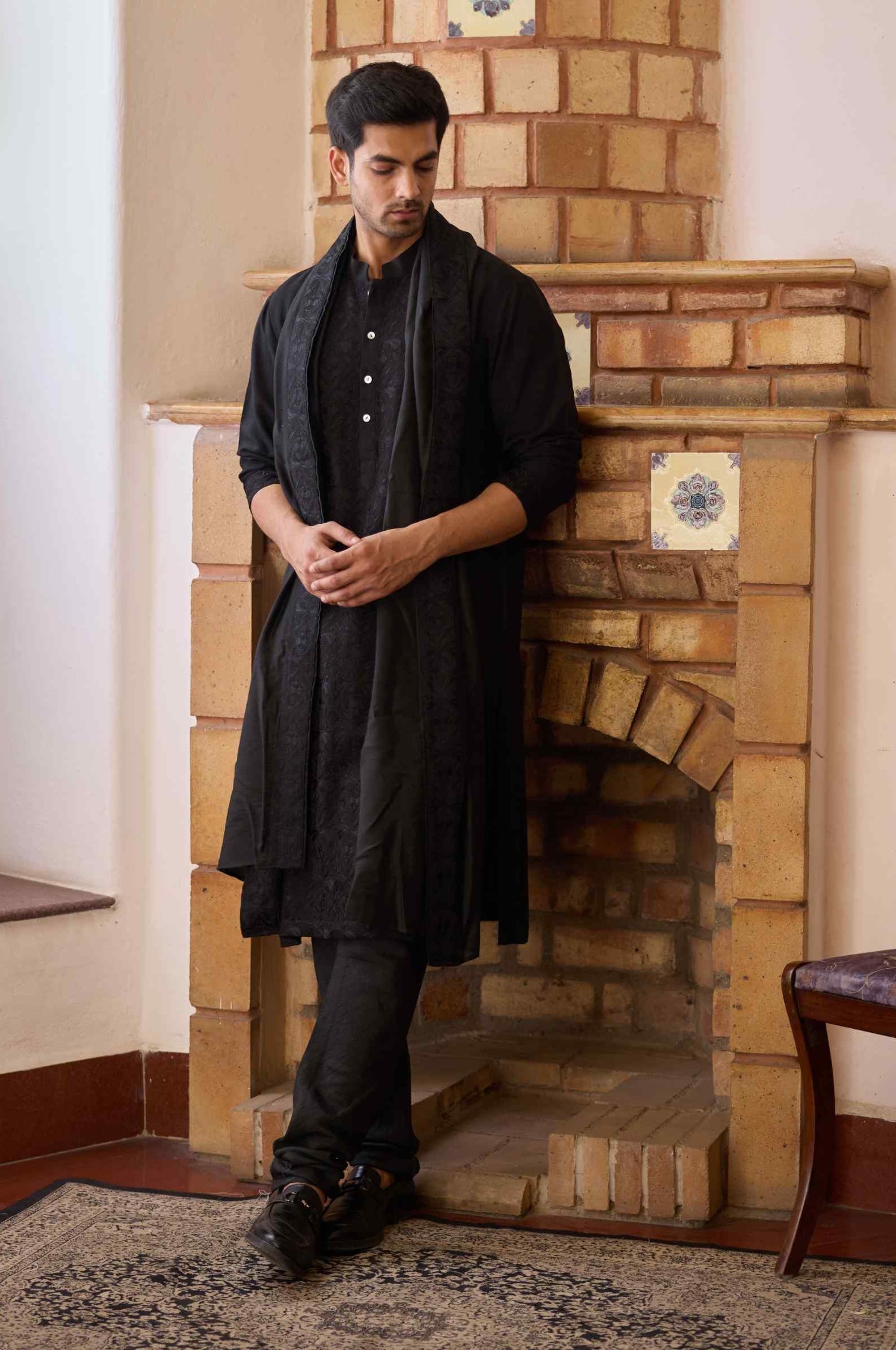 This black kurta features a stunning mughal-era-inspired rose print, created on a luxurious viscose cotton silk fabric. The intricate pattern, inspired by the floral artistry of the mughal era, adds a touch of elegance and timeless charm to this classic silhouette. The set includes a matching churidaar with the same beautiful rose print, creating a coordinated and harmonious ensemble. Ideal for weddings, festive occasions, or traditional gatherings, this kurta-churidaar combo is stylish, comfortable, and perfect for those who appreciate historical design. Pair it with classic footwear for a complete look.