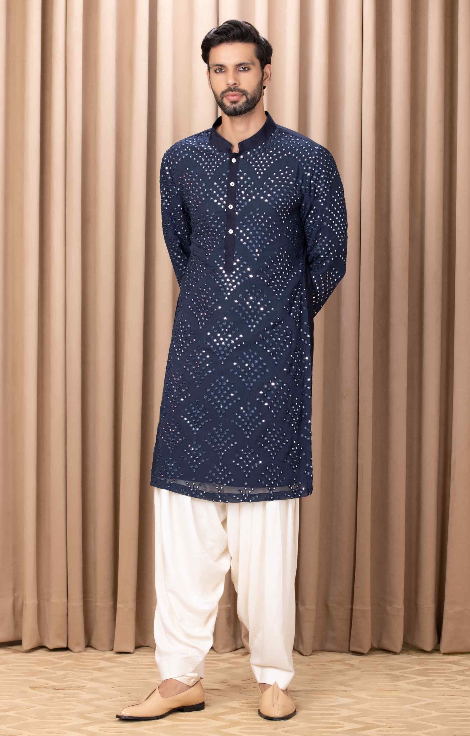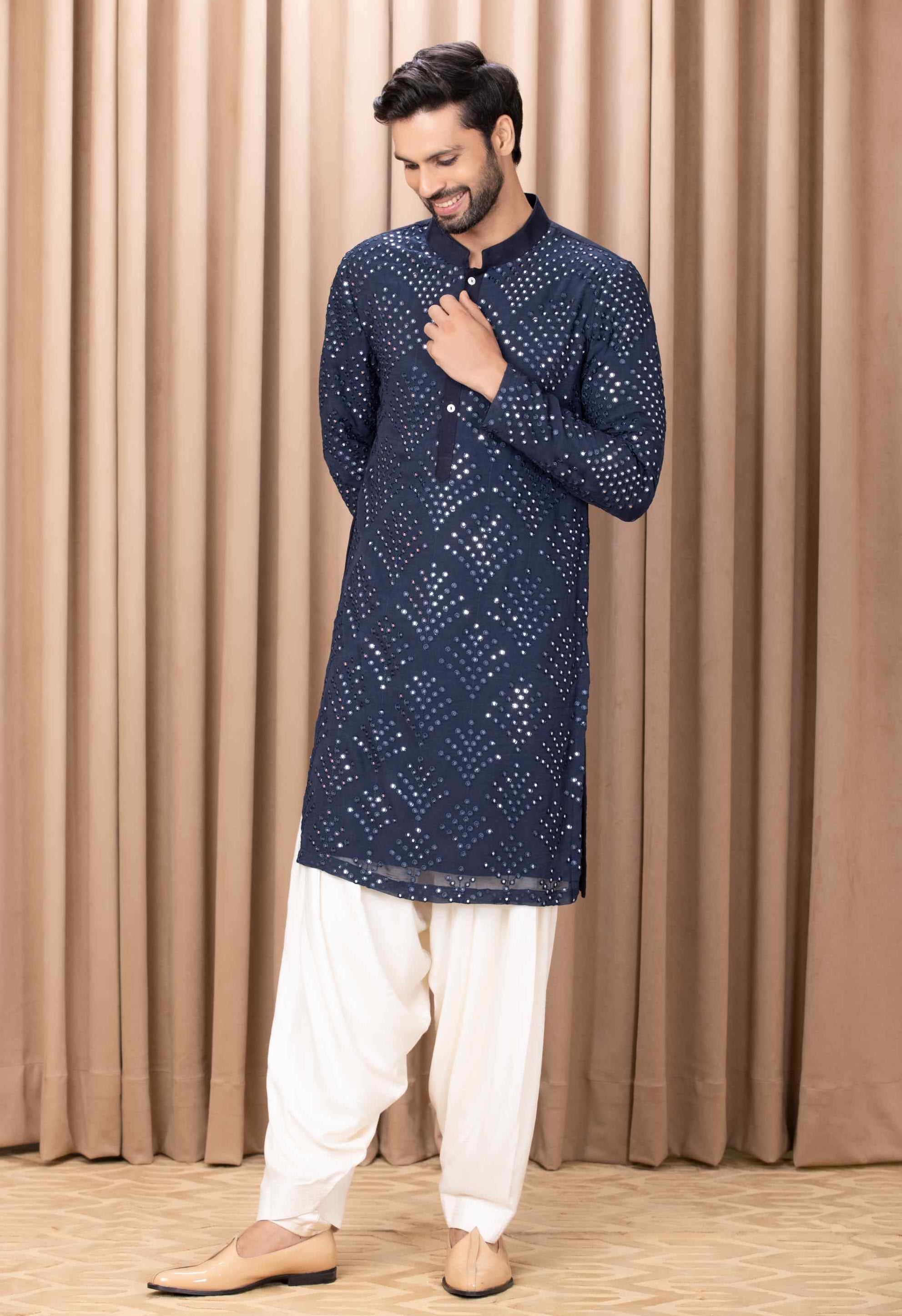 Elevate your celebration with our bespoke cotton silk and georgette kurta set in a striking navy blue. This sophisticated ensemble features intricate mirror work and machine embroidery on the front and sleeves, adding a dazzling touch of elegance and artistry. Perfect for outdoor occasions, this kurta set is designed for the modern groom or groomsmen who appreciate a blend of traditional charm and contemporary style. Complemented by an ivory classic churidaar, the outfit achieves a harmonious and polished look. Make a memorable impression on your special day with this beautifully crafted kurta set, combining timeless sophistication with modern flair.