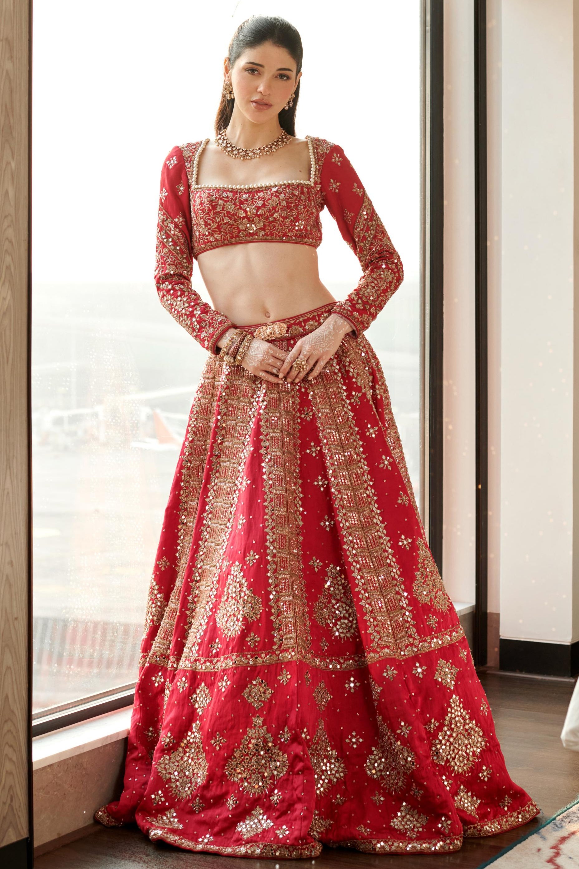 Blending heritage craftsmanship with modern luxury, this raspberry pink hitch lehenga set is a true showstopper. Intricate gold zari, mirror work, sequins, and cutdana embroidery adorn the sumptuous habutai silk fabric. The full-sleeve blouse with a square neckline and pearl embellishments adds refinement, while the sheer net dupatta drapes effortlessly, making this piece ideal for festive and wedding occasions.