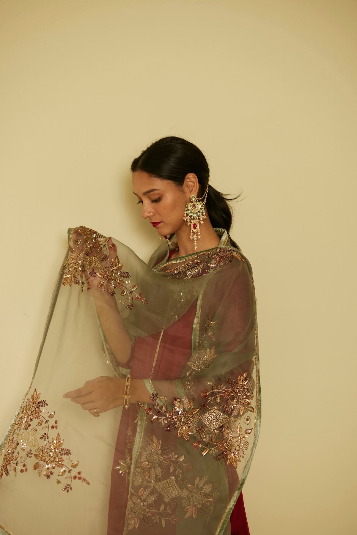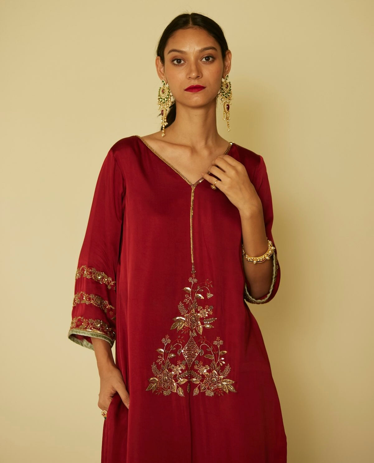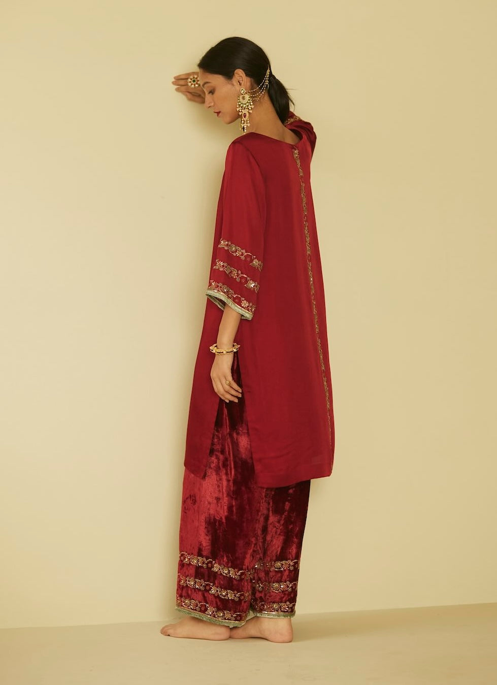 The blue arya stole and red arya kurta set offer a striking combination of colors and luxurious materials. The blue arya stole, crafted from delicate organza silk, provides a light, ethereal touch with its graceful drape and vibrant hue. Complementing it is the red arya kurta set, featuring a kurta in smooth satin silk that exudes opulence and shine, paired with velvet pants that add a rich texture and comfort. Together, these pieces create a bold and elegant look, ideal for formal events and special occasions.
