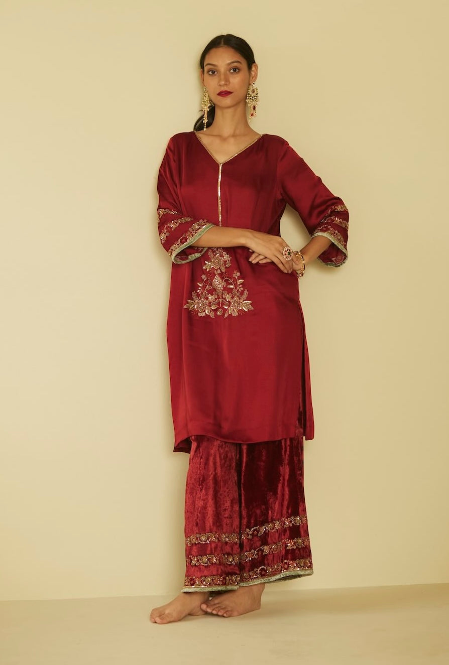 Fabric: Kurta- satin silk, pants- velvet, stole- organza silk