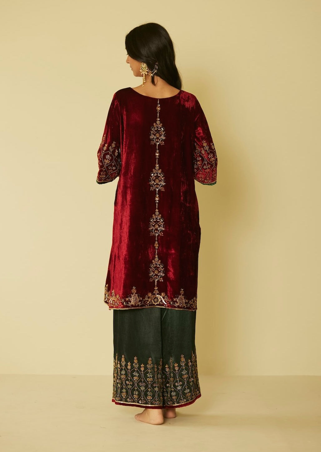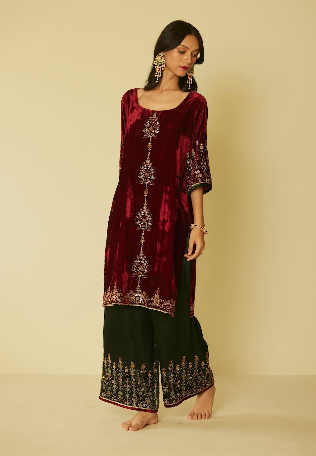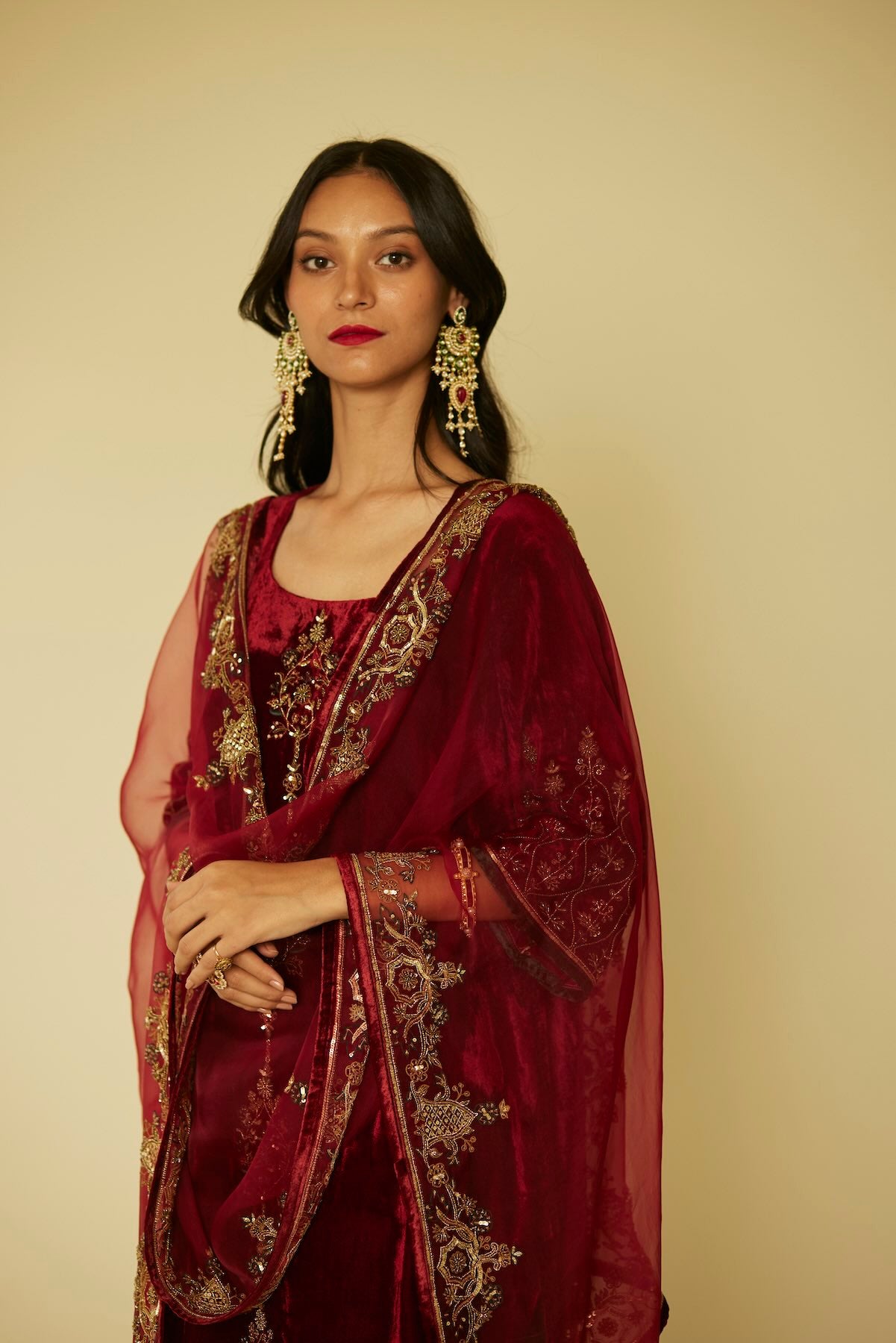 The red bageecha stole and red bageecha kurta set combine to create a vibrant and luxurious ensemble. The red bageecha stole, crafted from delicate organza silk, adds an airy and elegant touch with its subtle sheen and flowing drape. Complementing this is the red bageecha kurta set, featuring a kurta made from rich velvet, offering a deep, opulent color and texture, paired with pants in smooth mushroom silk for a refined finish. Together, these pieces offer a striking and sophisticated look, perfect for making a statement at formal events and special occasions.