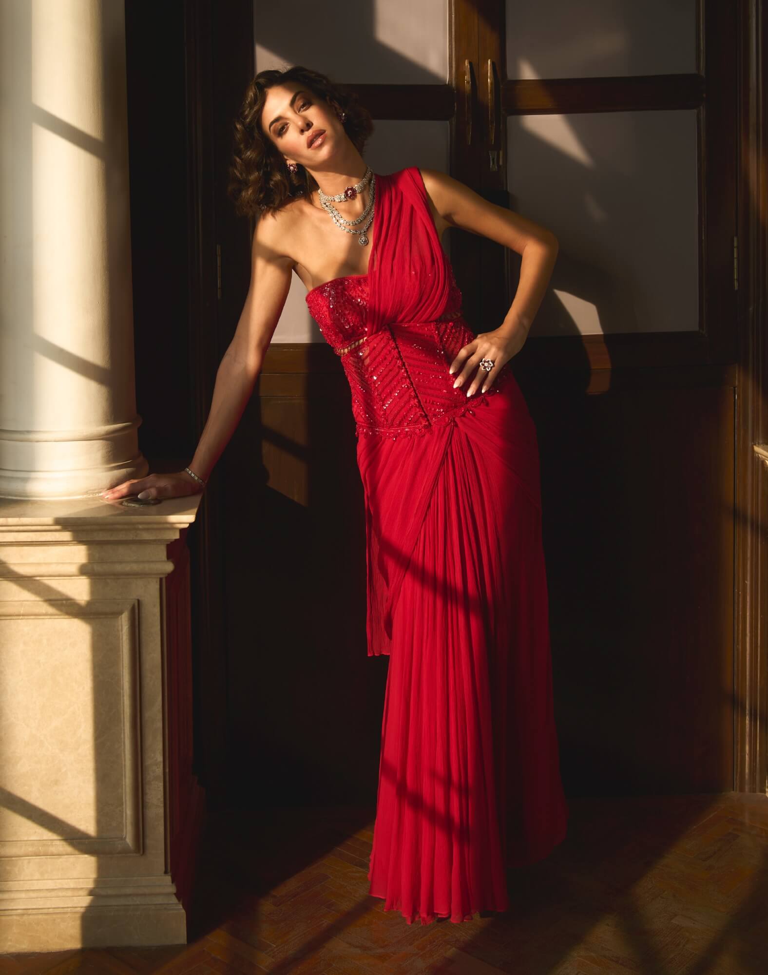 Sanya Gulati’s designs stand out with their playful elegance and a focus on versatile luxury. Her collections feature a vibrant mix of rich fabrics, intricate detailing, and contemporary silhouettes, from flowy lehengas to structured blouses. The designs are infused with a modern edge while staying deeply rooted in traditional Indian aesthetics, offering pieces that are both bold and delicate, suitable for a range of occasions. The label captures a youthful spirit while embracing a sophisticated, timeless appeal.