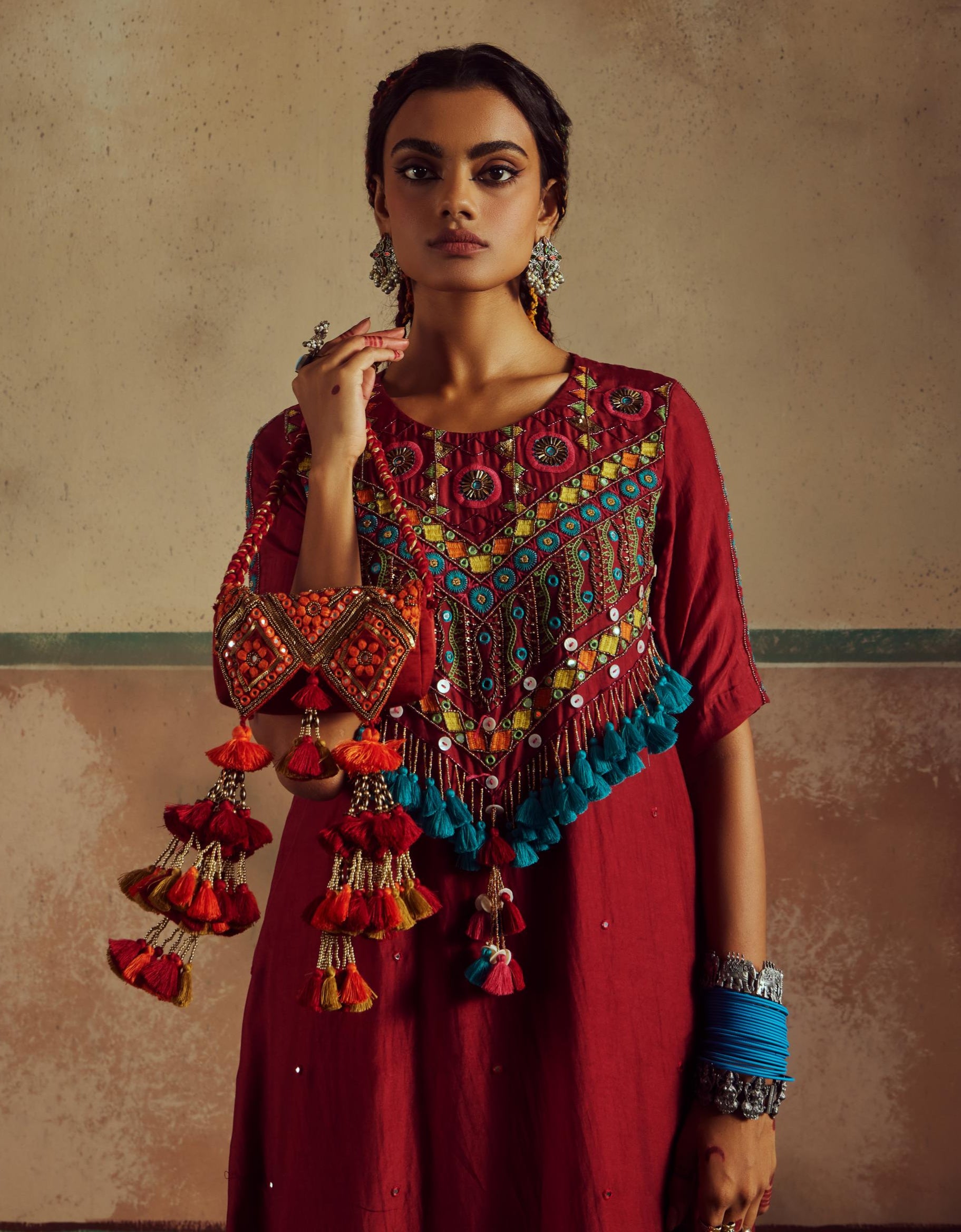 This striking red round neck kurta is beautifully detailed with heavy thread, beads, and mirror embroidery on the front, creating a rich, textured design. Adorned with playful tassels, it adds a festive touch to the look. Paired with matching pants, this ensemble blends traditional artistry with modern flair, making it a perfect choice for any occasion.
