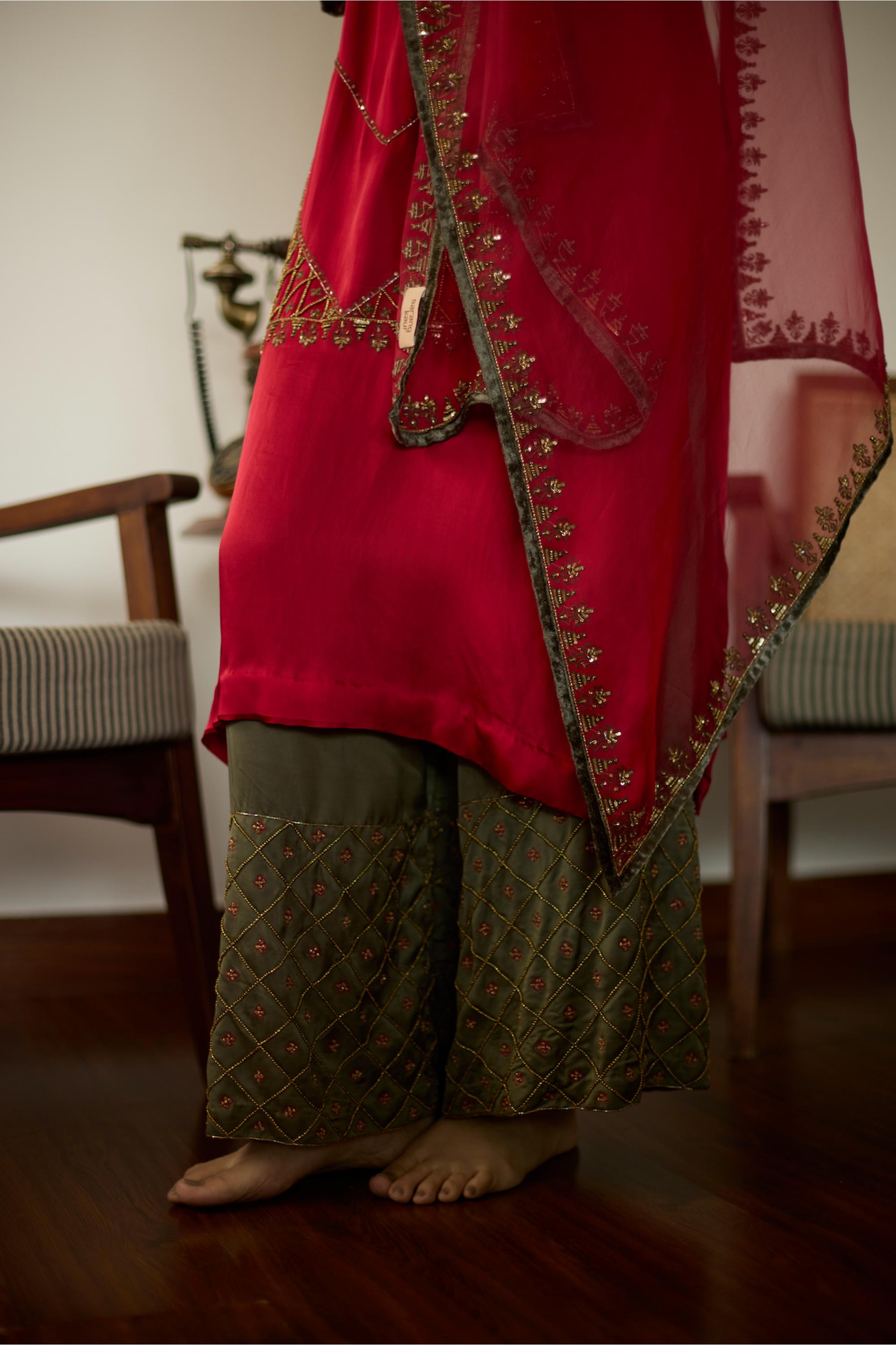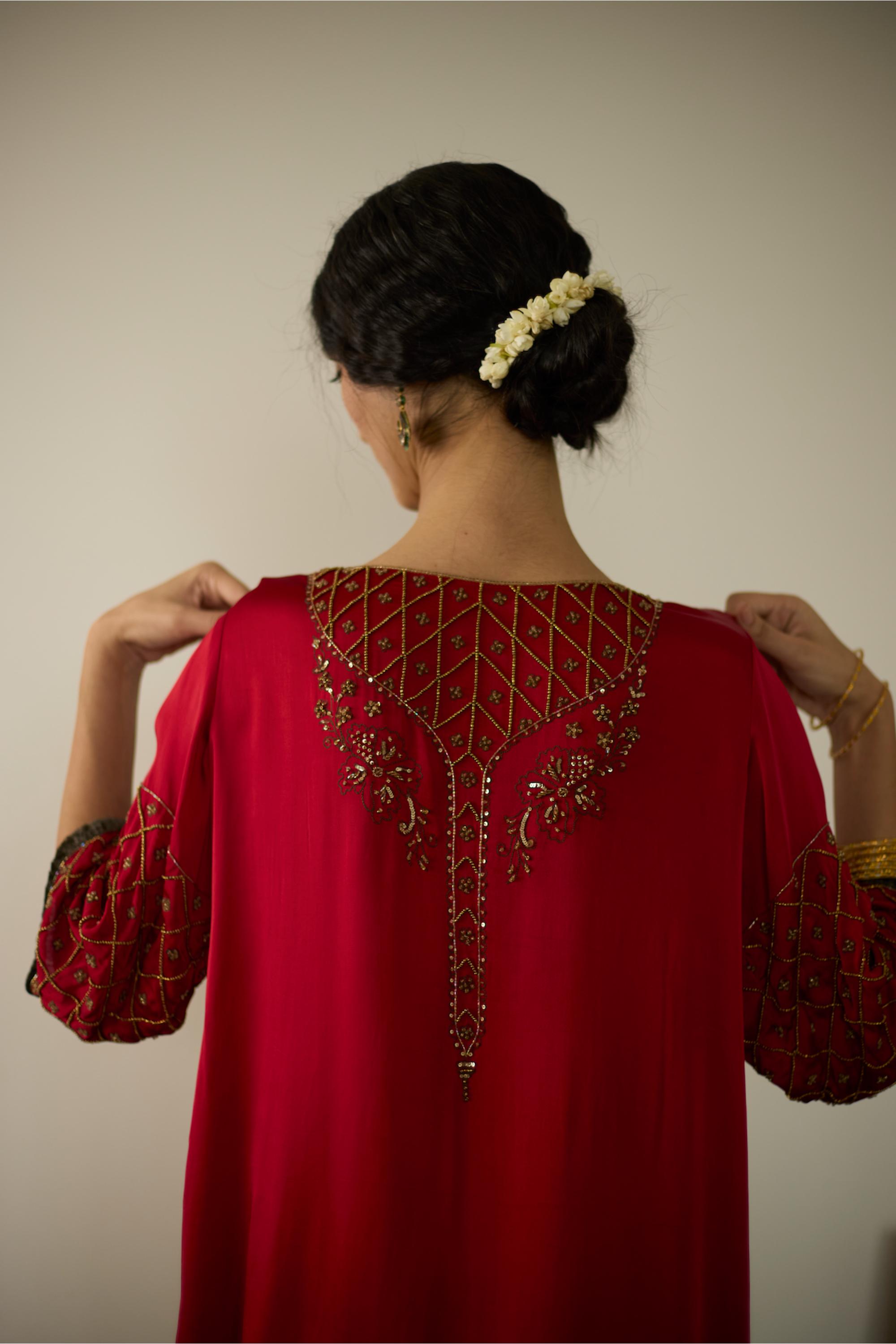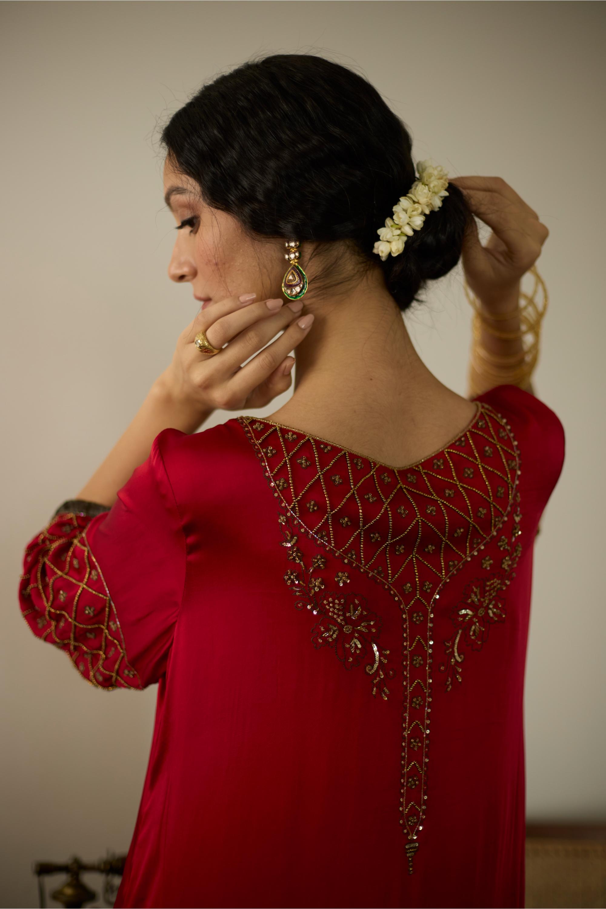Make a bold statement in the Red Diya Hand-Embroidered Kurta Set. Featuring intricate embroidery and a timeless silhouette, this ensemble is perfect for weddings, festive celebrations, and special occasions.