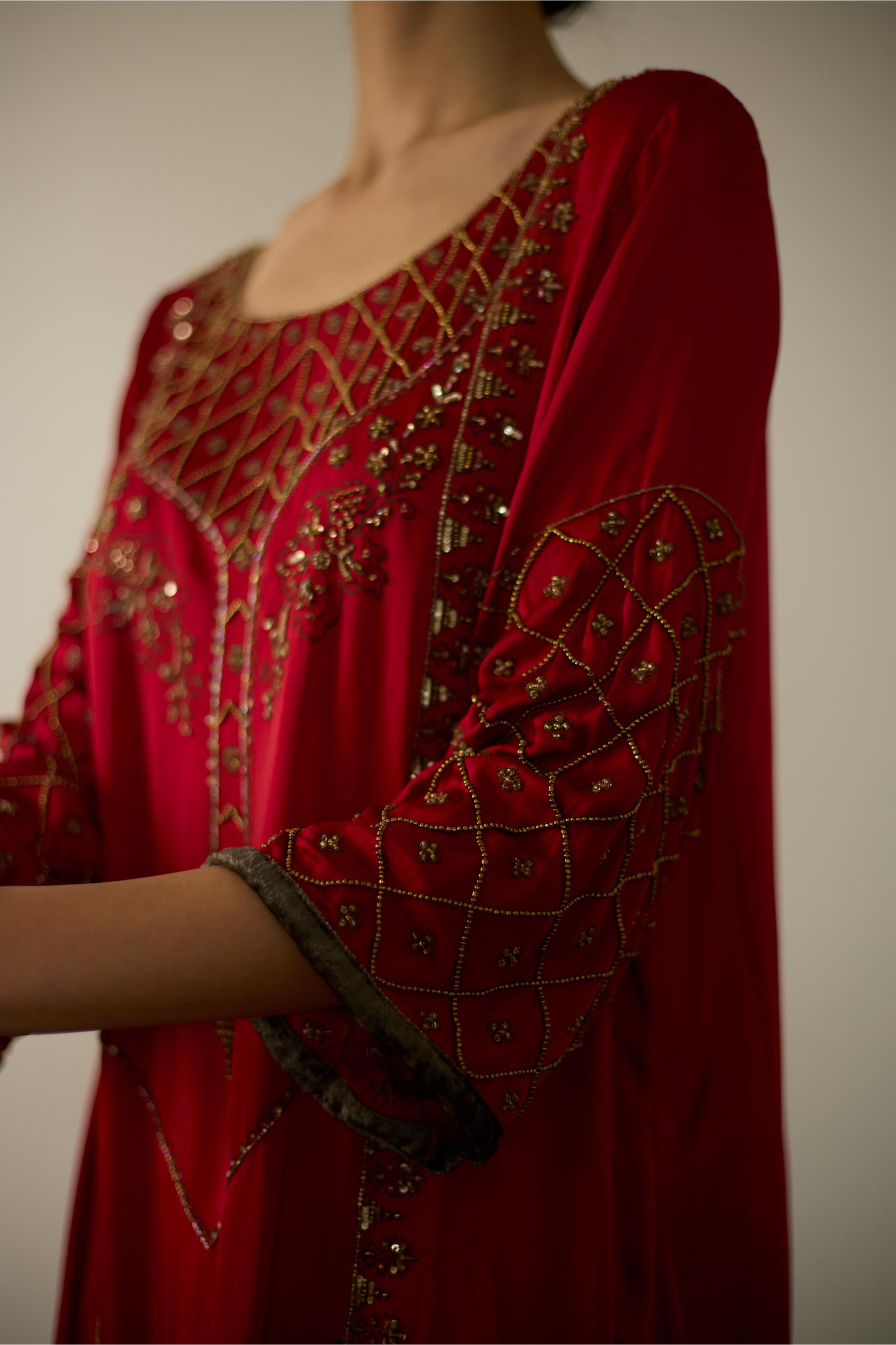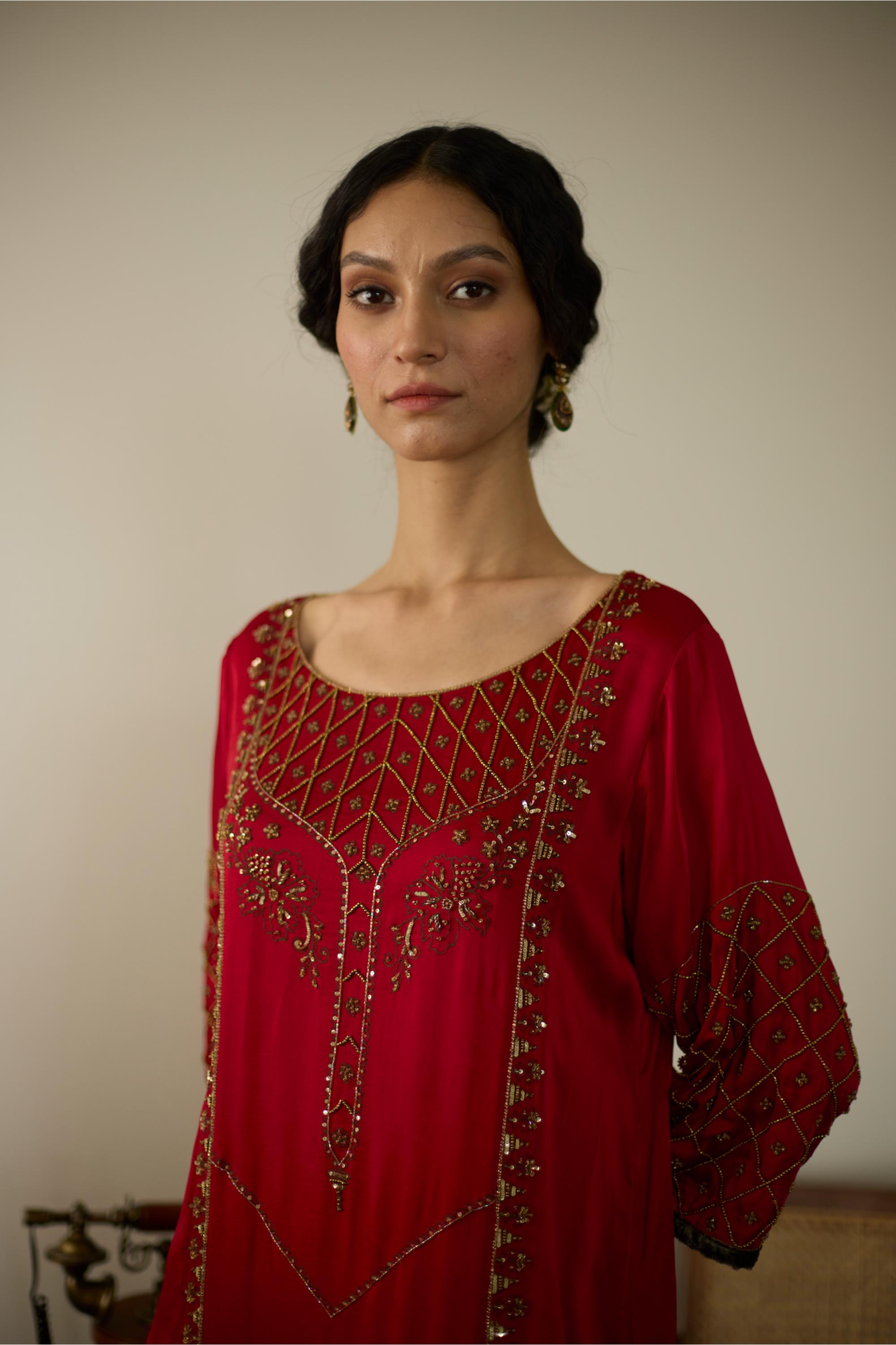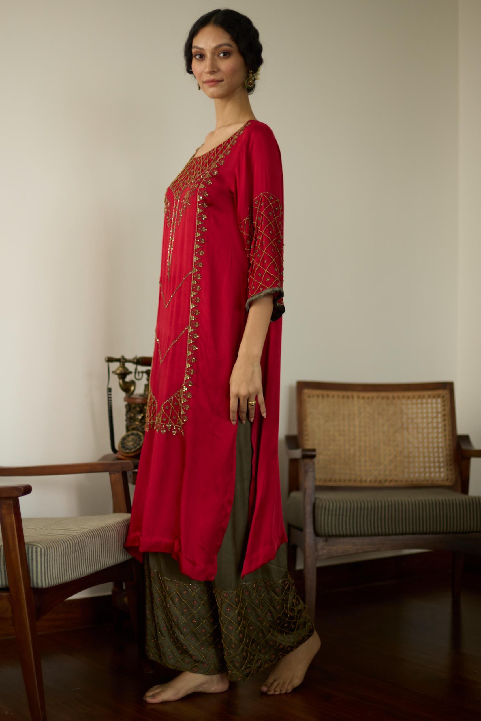 Make a bold statement in the Red Diya Hand-Embroidered Kurta Set. Featuring intricate embroidery and a timeless silhouette, this ensemble is perfect for weddings, festive celebrations, and special occasions.