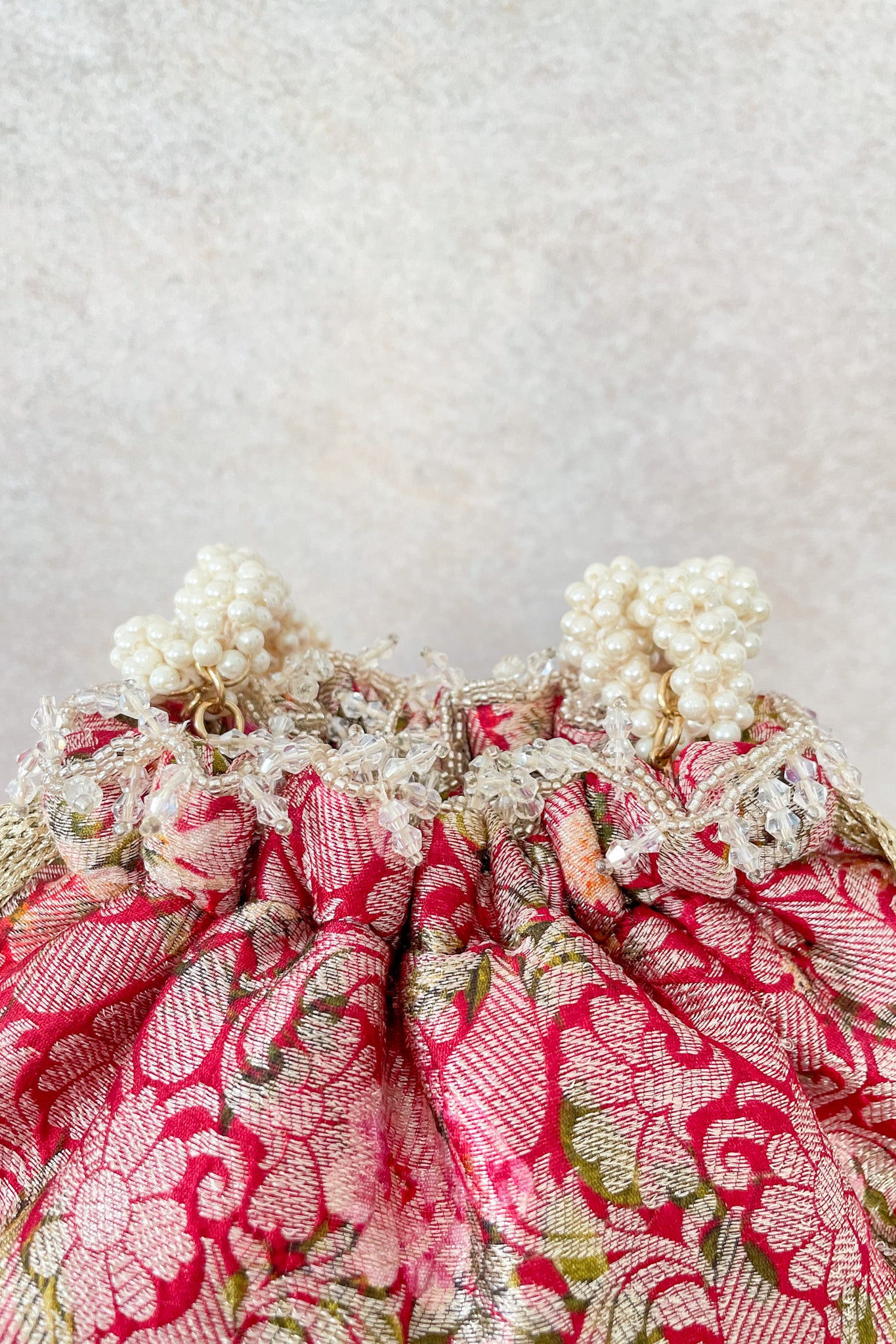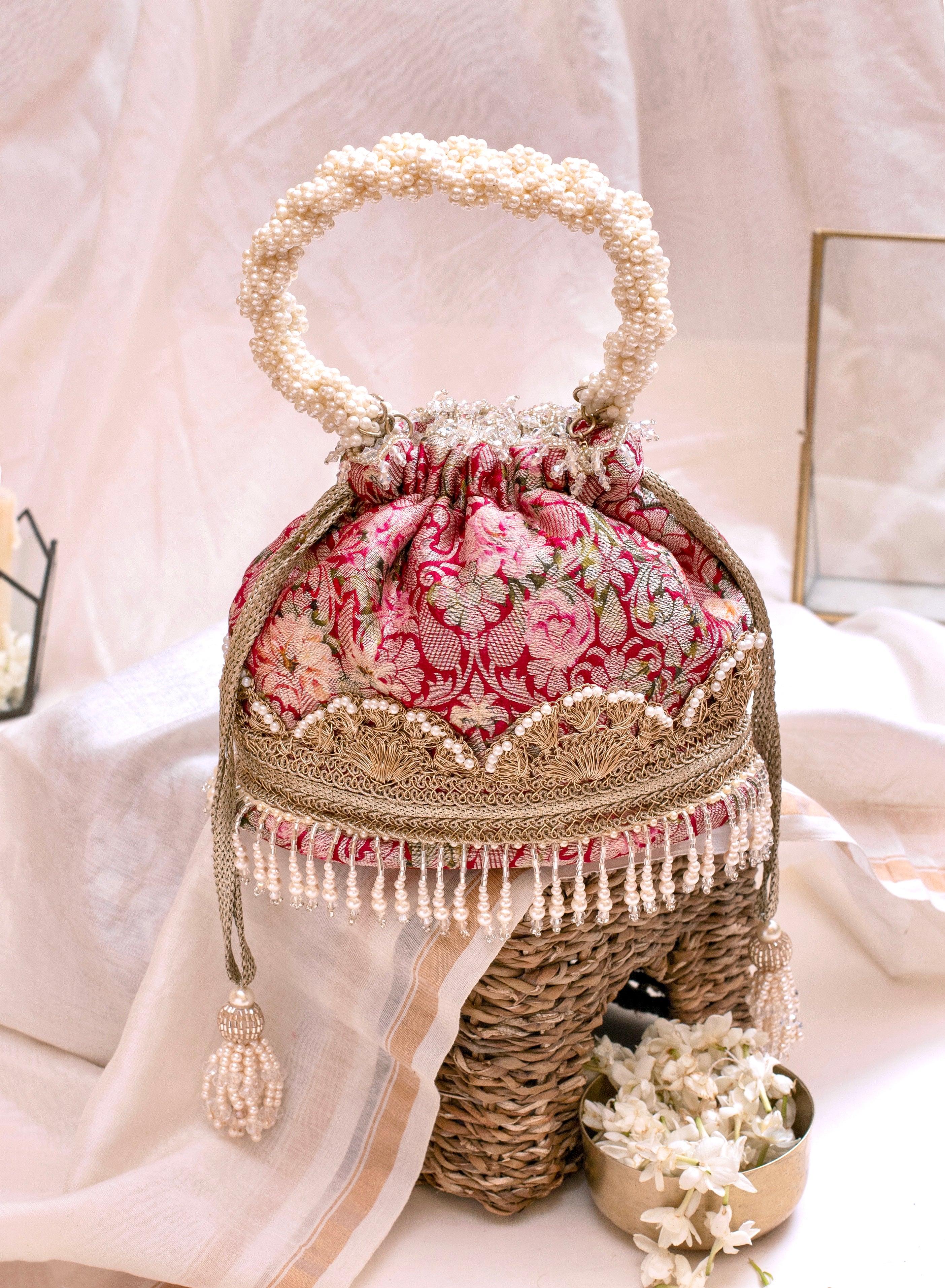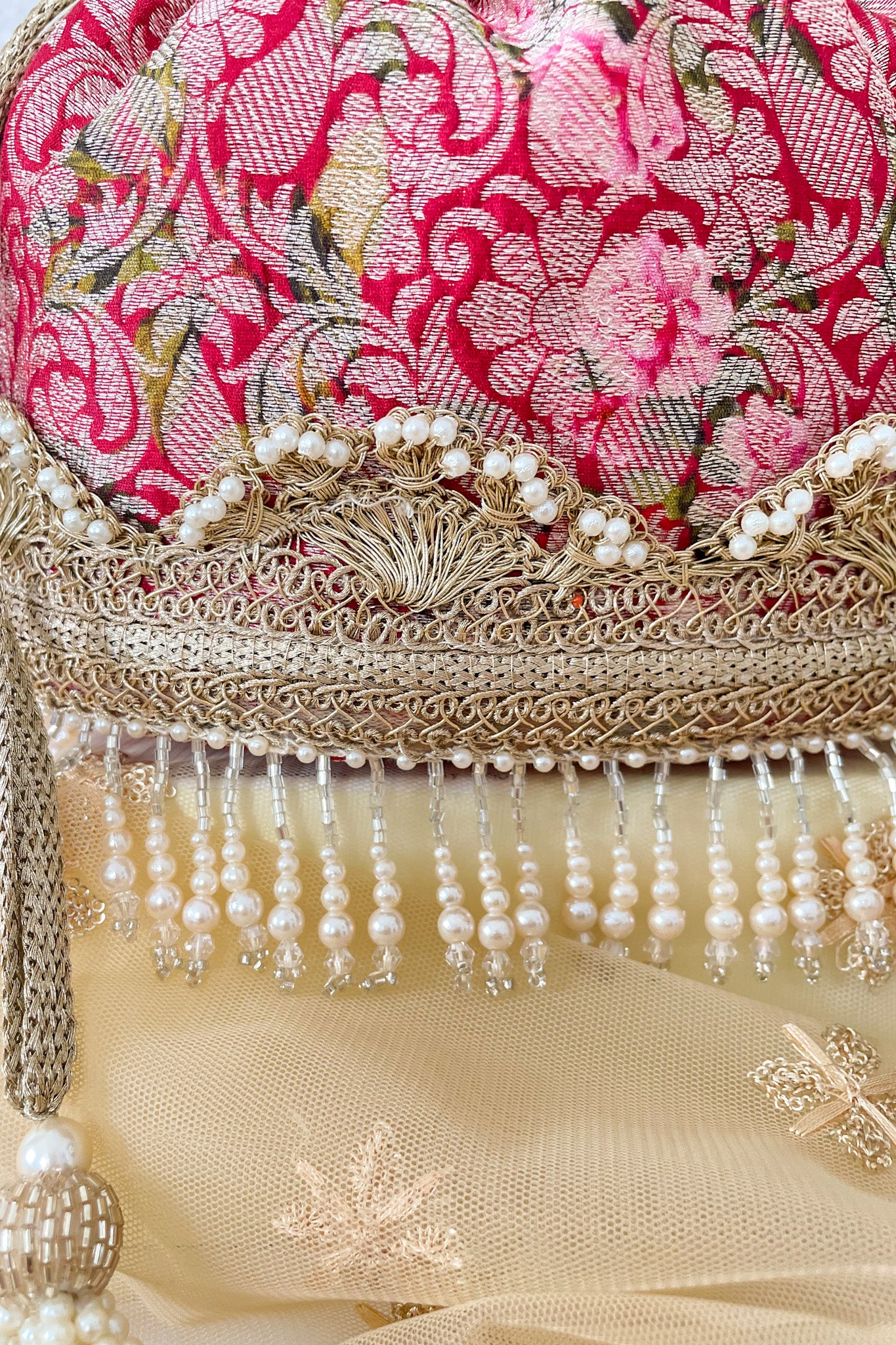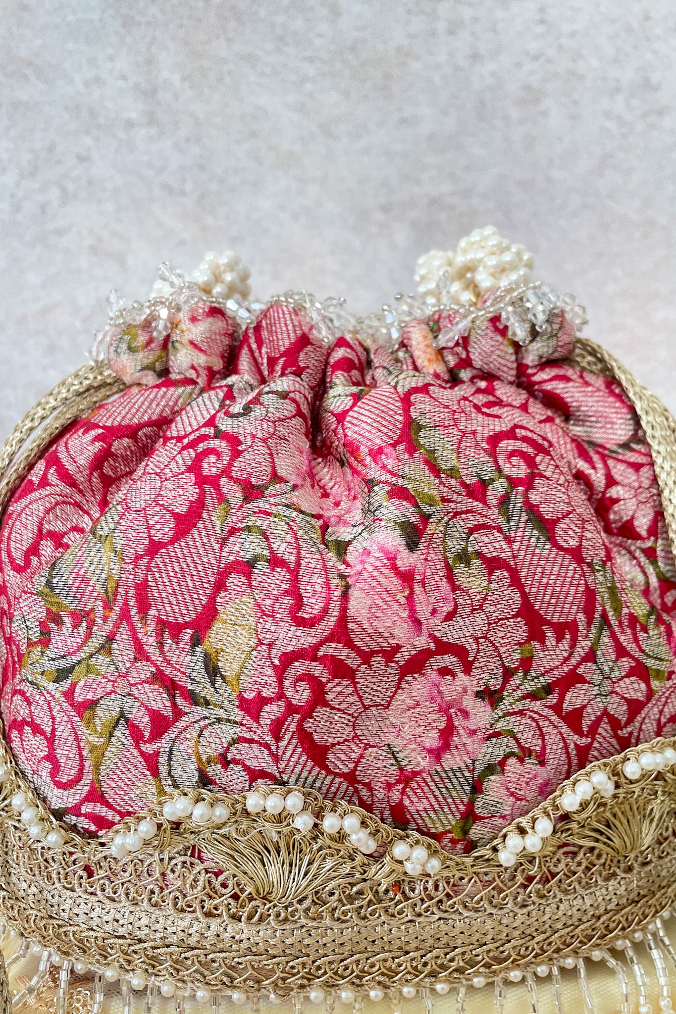 Fabric: Floral printed organza brocade,ÿ poly satin lining, Pearl and crystal fringe lace woven gold thread drawstrings, Braided pearl handle,ÿpearl tassels.