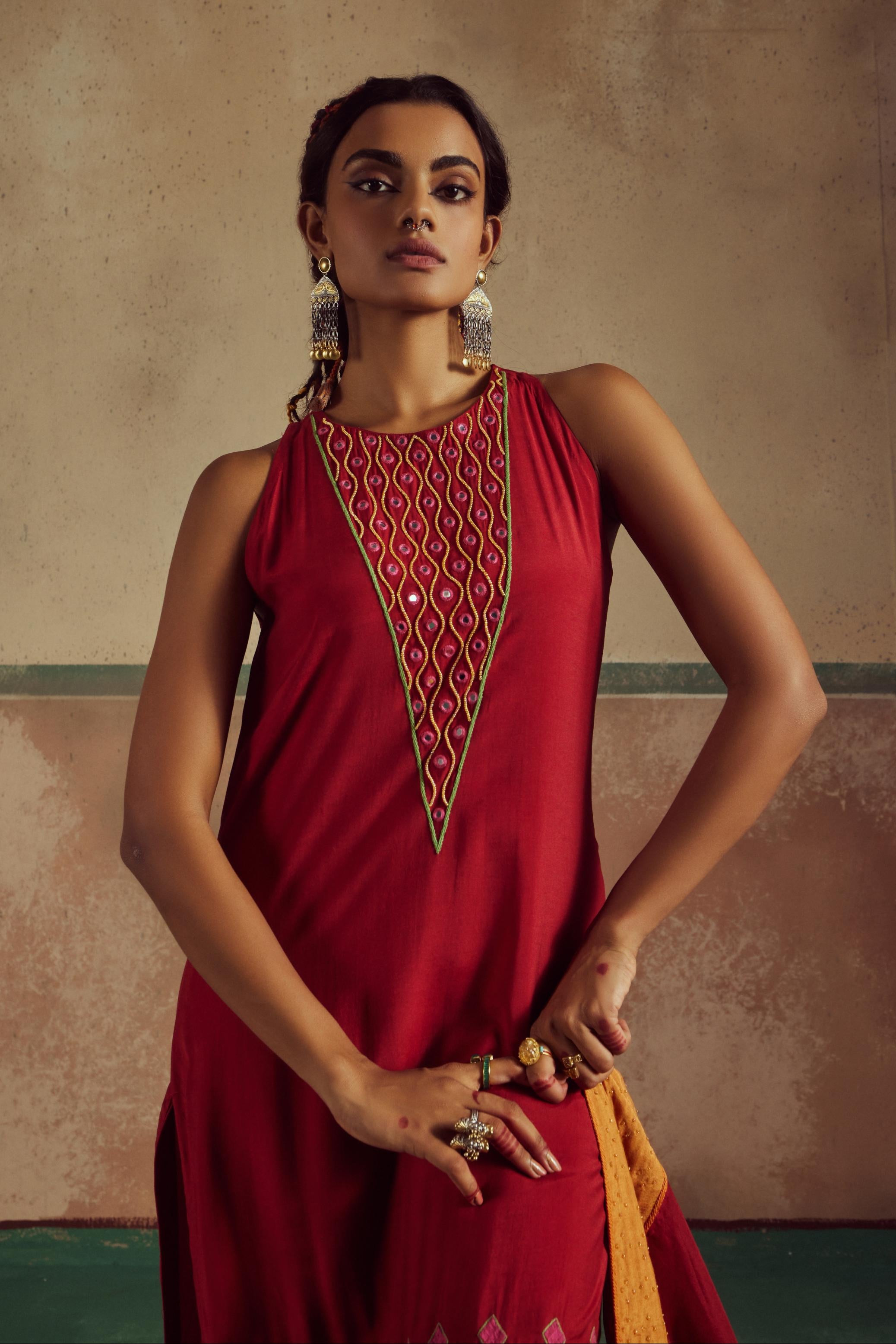 This vibrant red kurta features intricate heavy embroidery on the hem and a stunning mirror and bead pattern on the neckline. The matching dupatta is beautifully embroidered with the same mirror and bead work as the kurta, enhanced with a contrast patch along the borders. Paired with an orange contrast churidaar, this ensemble offers a perfect blend of rich colors and exquisite detailing for a bold and elegant look.