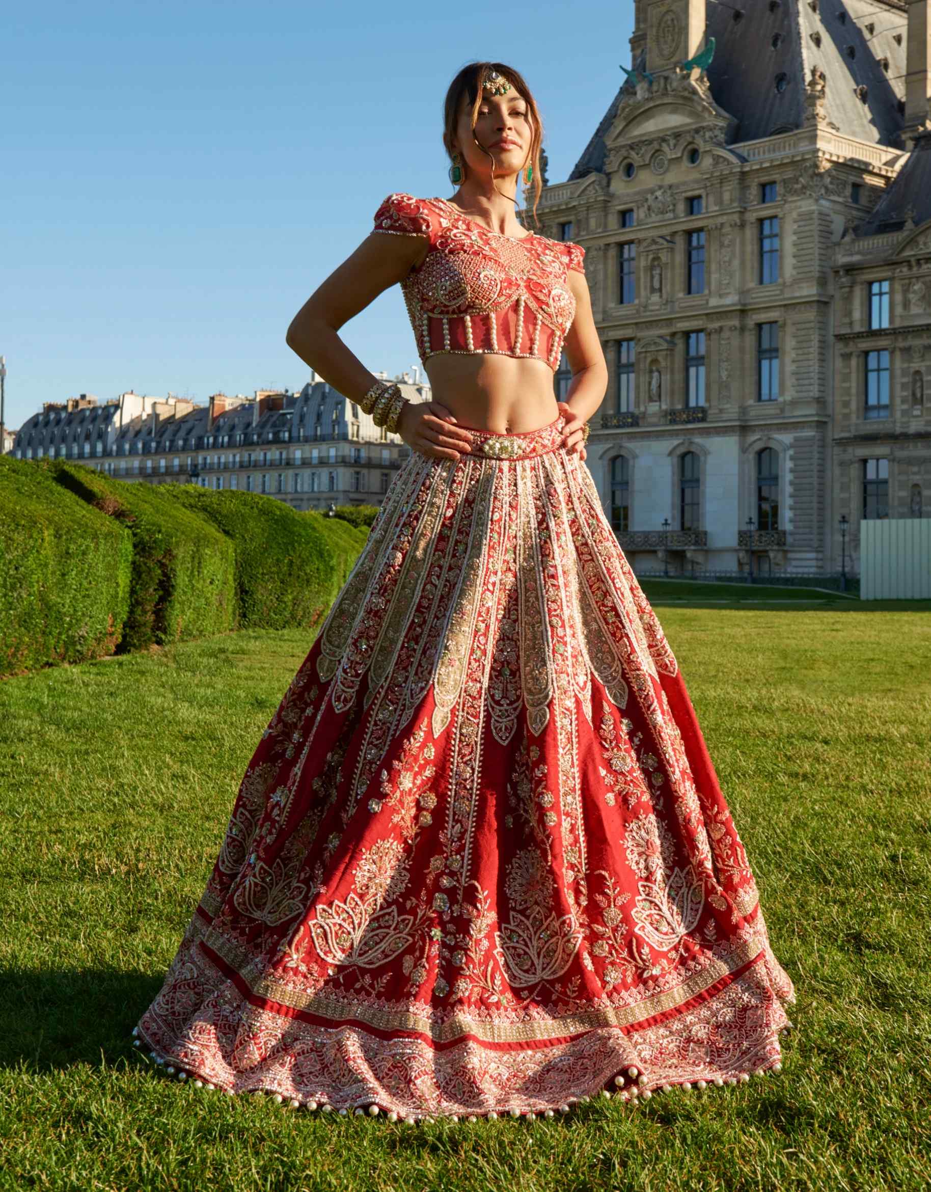 Embrace grandeur with our red lehenga set adorned with exquisite handwork embroidery and delicate pearl accents. Crafted from luxurious raw silk the lehenga and blouse create a stunning regal silhouette. The ensemble is completed with a graceful net dupatta that adds an elegant finishing touch. Perfect for special occasions and celebrations this lehenga set radiates opulence and timeless beauty.