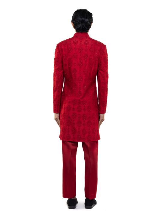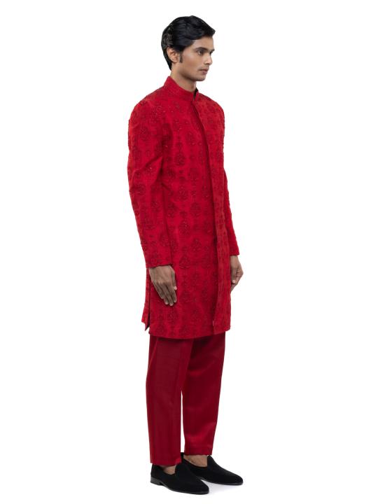 Vibrant and striking, this Red Silk Floral Embroidery Sherwani Set makes a bold statement for festive occasions. Crafted from luxurious silk, it features exquisite floral embroidery that adds rich texture and elegance. With a stand collar, concealed placket, and sophisticated Mother of Pearl buttons, the regular fit and straight hem ensure a comfortable yet refined silhouette-ideal for weddings, celebrations, and formal events.