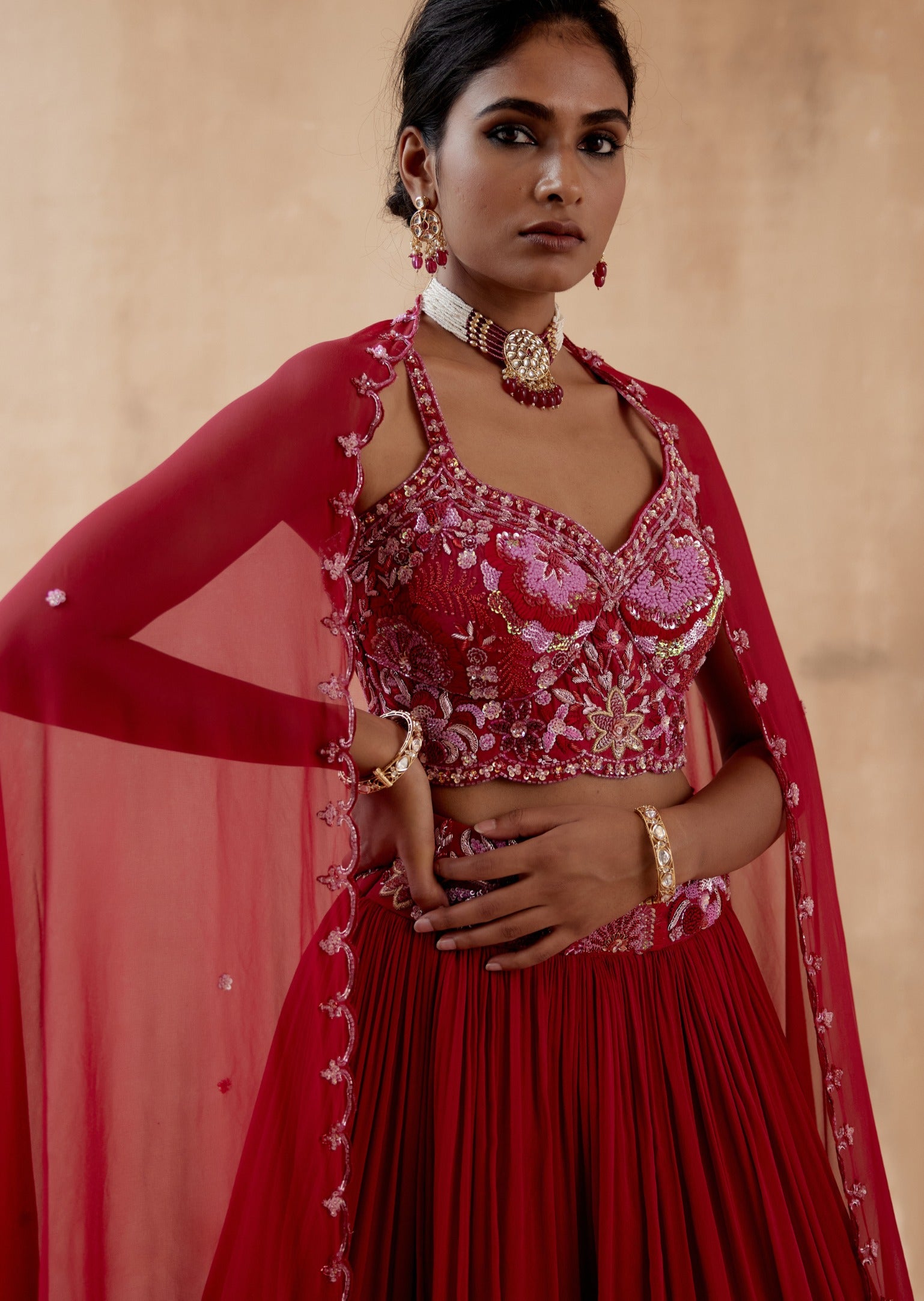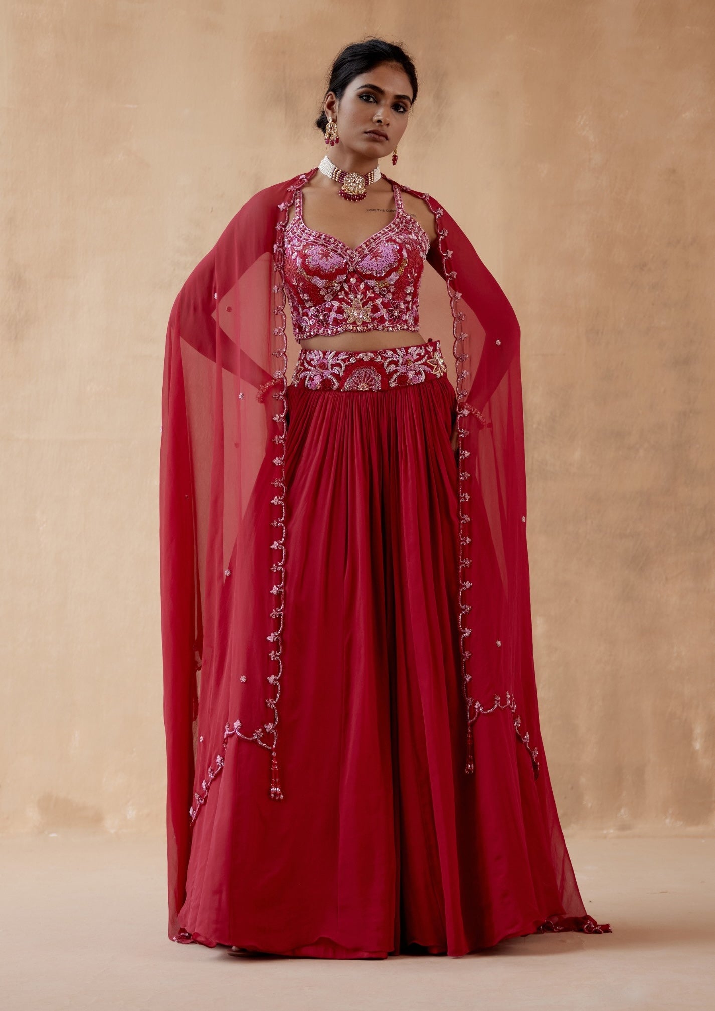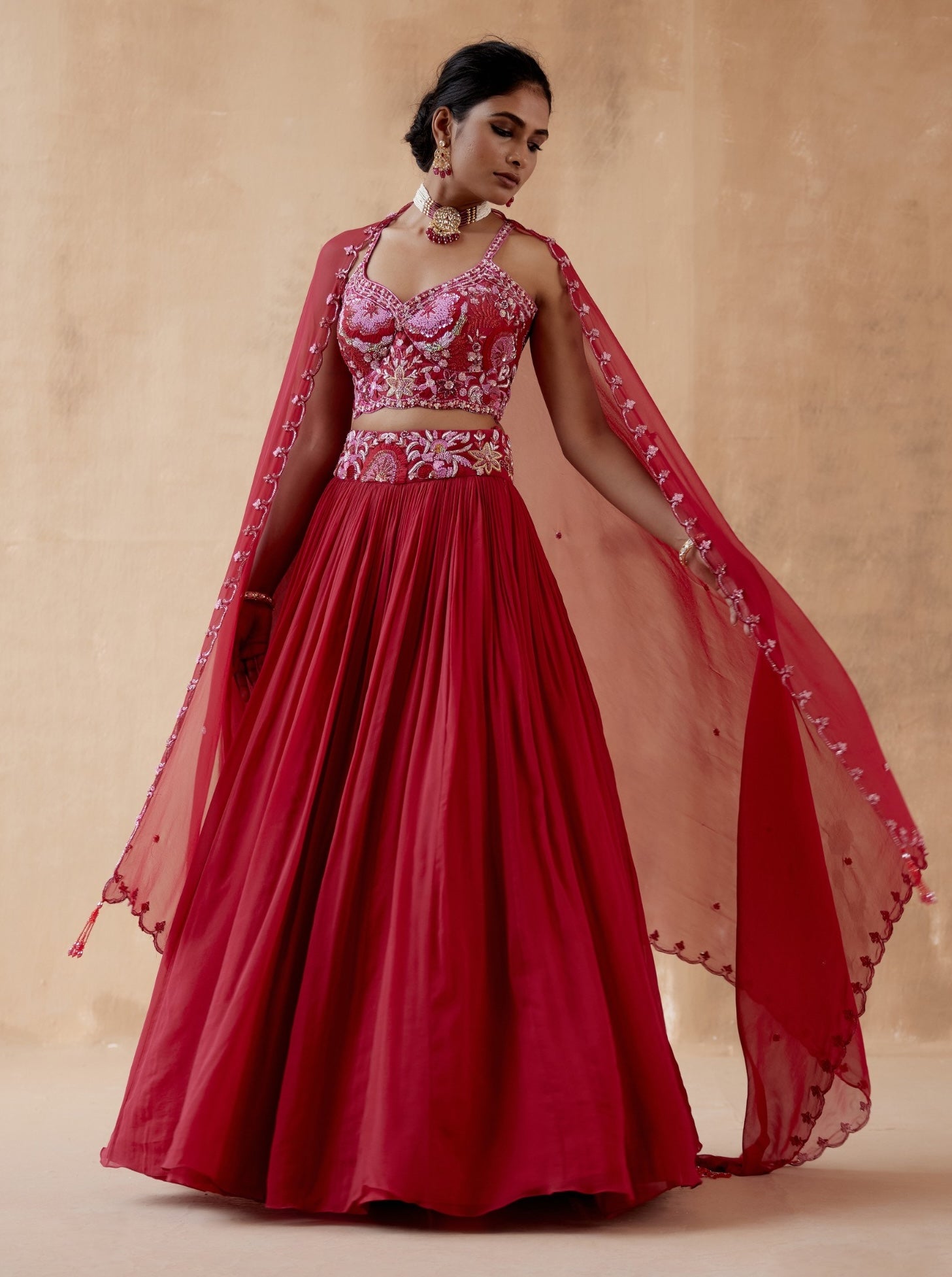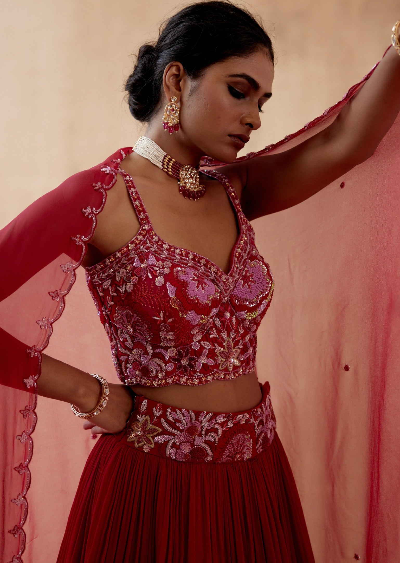 Elevate your style with our stunning red georgette lehenga set, featuring intricate floral thread embroidery highlighted by an array of elegant embellishments. This vibrant ensemble is paired with a beautifully embroidered blouse and a coordinating dupatta, creating a cohesive and glamorous look. Perfect for weddings, festive occasions, and special celebrations, this lehenga set combines bold color with luxurious fabric and detailed craftsmanship to ensure a captivating and memorable appearance.