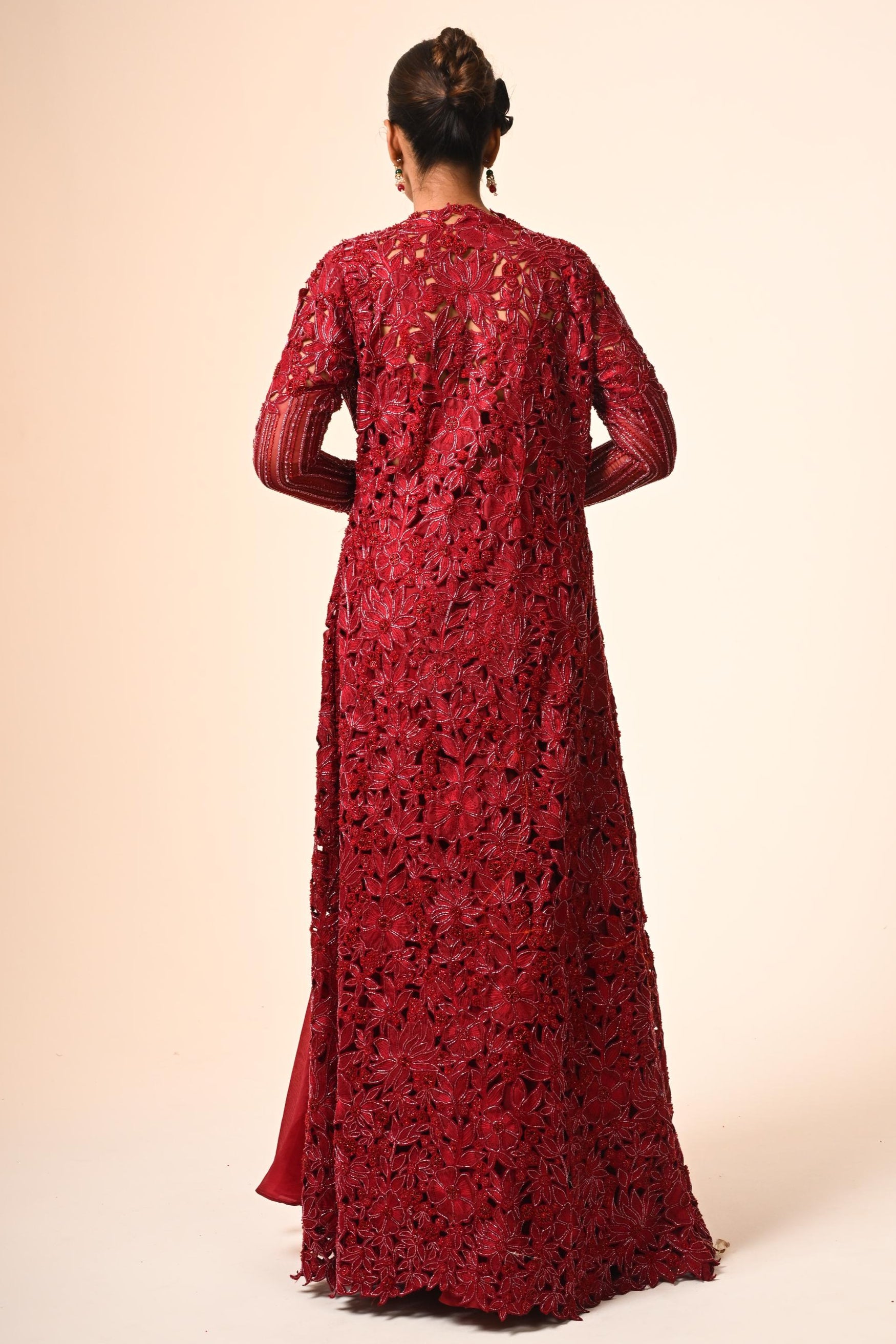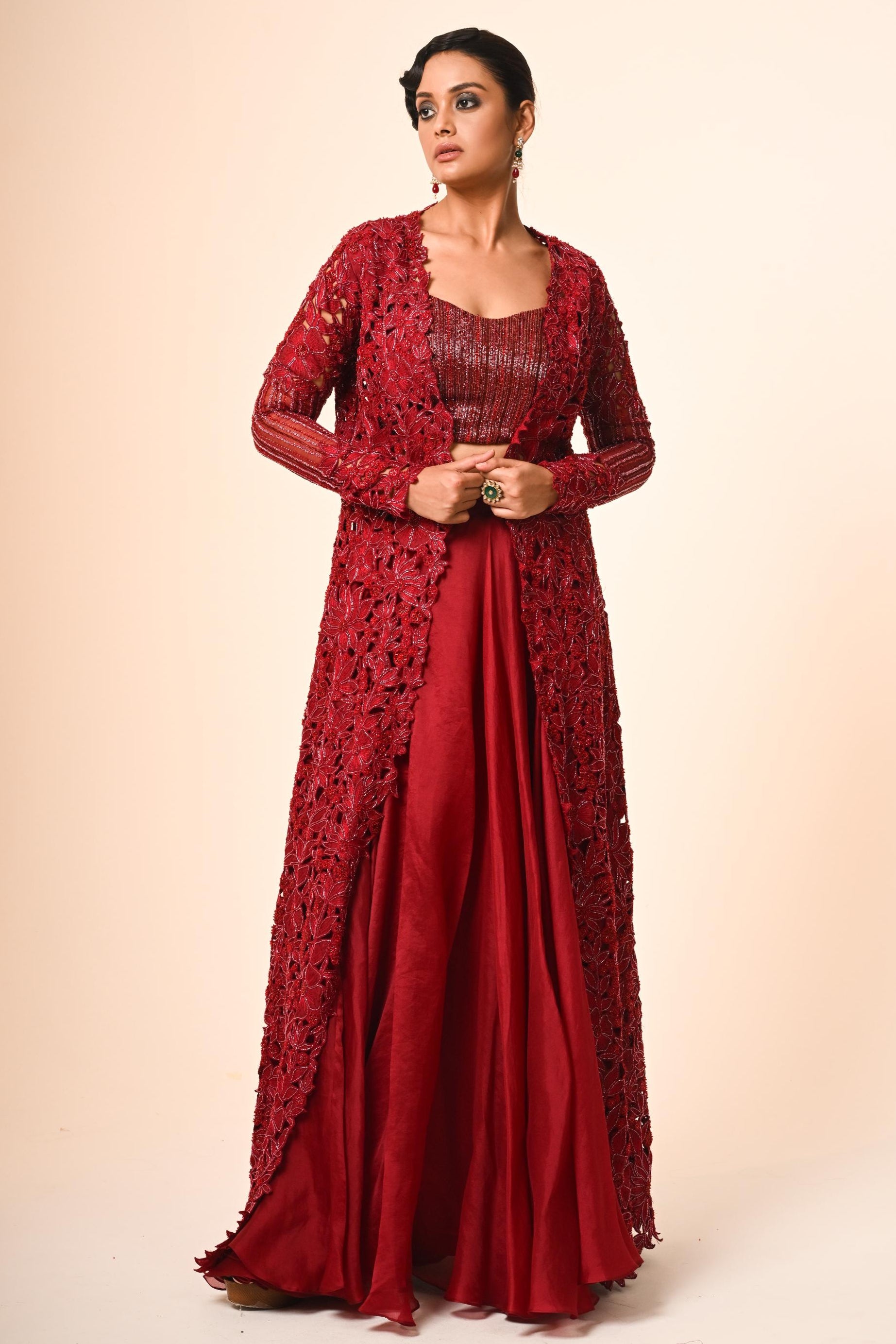 Statement-making and richly detailed, the Red Floral Jacket with Flared Skirt is designed for modern celebration with a touch of regal charm. The longline jacket features intricate floral embroidery, adding depth and texture, while the voluminous flared skirt brings graceful drama to the silhouette. Perfect for sangeet nights, engagement parties, or festive receptions, this set effortlessly merges traditional craftsmanship with a contemporary edge. The Red Floral Jacket with Flared Skirt is ideal for those who seek bold elegance and refined versatility.