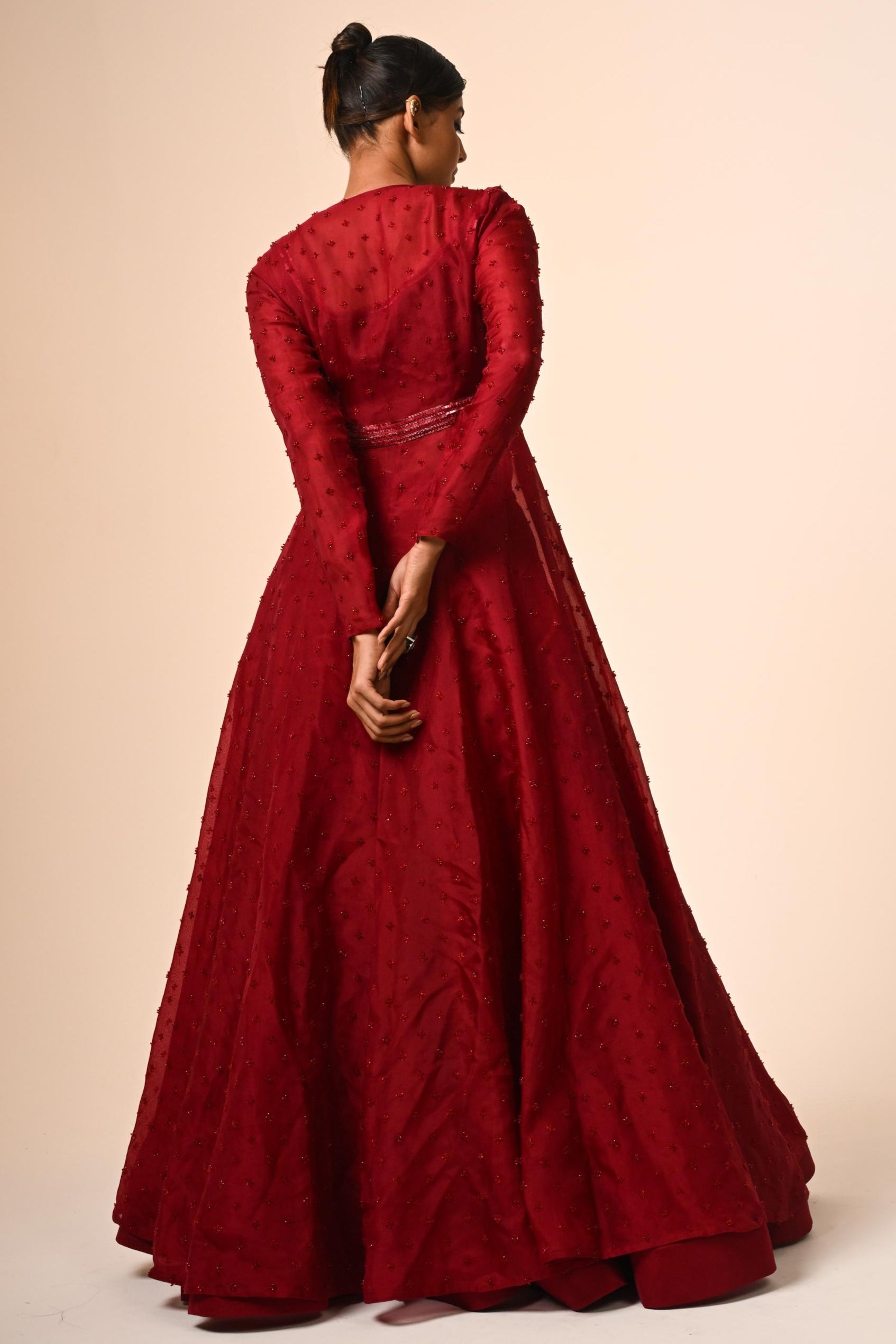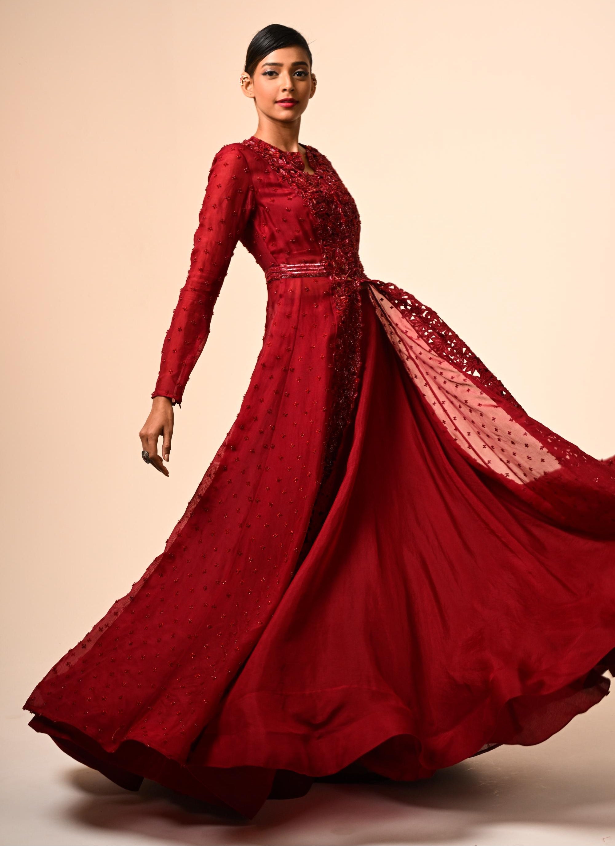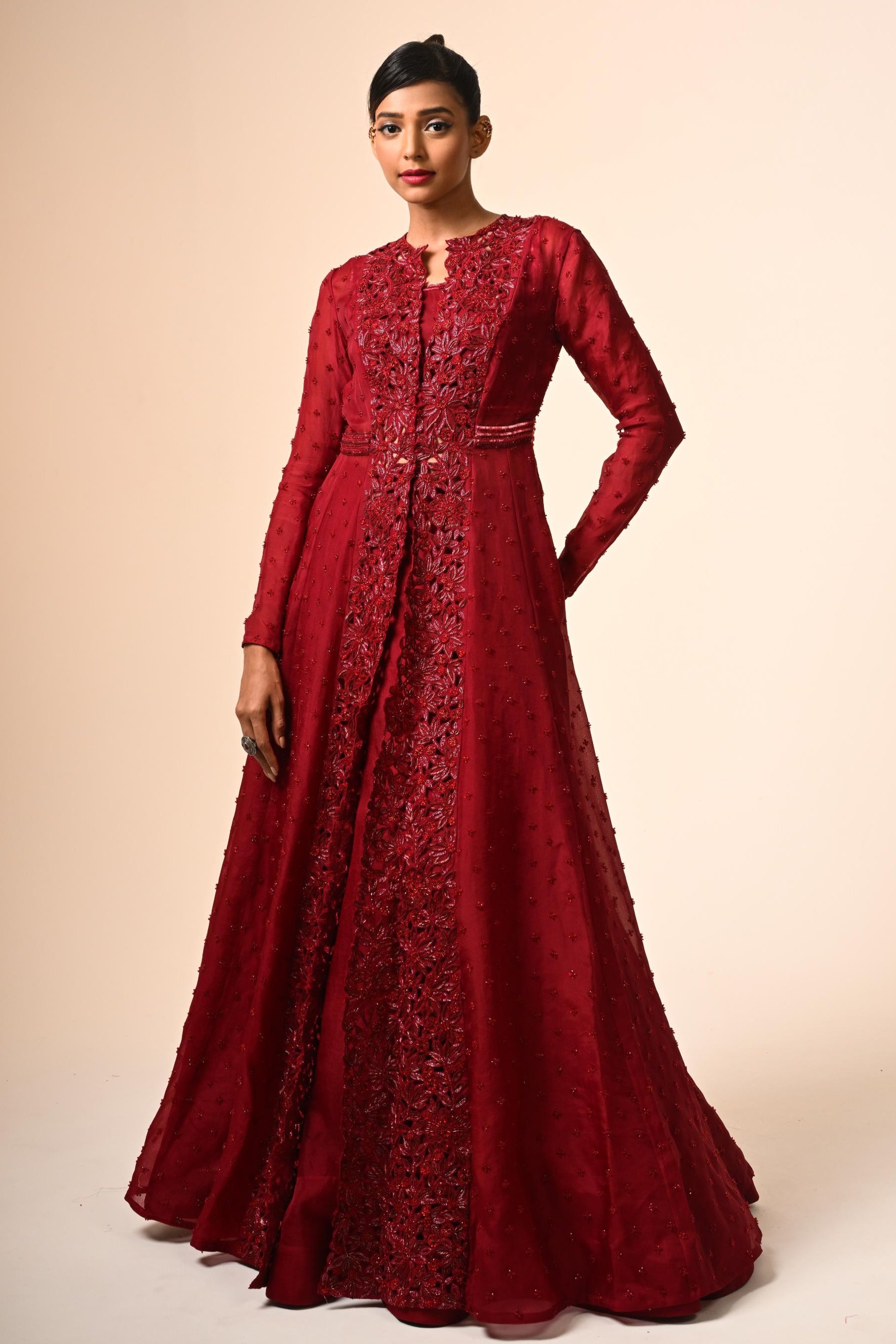 Bold, feminine, and effortlessly festive—the Red Floral Jacket with Skirt is a modern take on traditional celebration wear. The statement jacket features intricate floral embroidery, adding texture and charm, while the flowing skirt offers graceful movement and comfort. Whether styled open over a crop top or worn as a coordinated set, this ensemble is perfect for mehendi functions, festive gatherings, or wedding welcome events. The Red Floral Jacket with Skirt is a standout look for those who love vibrant detailing with a contemporary silhouette.