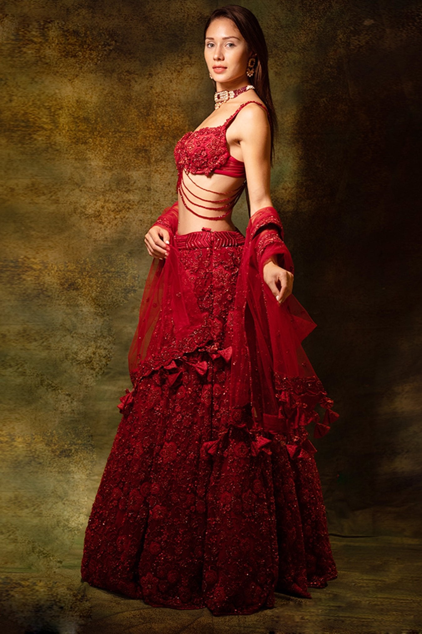 Immerse yourself in the timeless allure of tradition with this stunning lehenga. Draped in rich red hues, it showcases exquisite hand embroidery that includes resham thread, Swarovski stones, beads, and sequins, all meticulously crafted by our skilled artisans. The lehenga and blouse feature intricate self-on-self embroidery, adding depth and texture to the ensemble. Complemented by a net dupatta with elegant borders, this outfit embodies classic beauty with a touch of sophistication. Perfect for any grand occasion, it promises to make a memorable statement with its intricate detailing and luxurious craftsmanship.