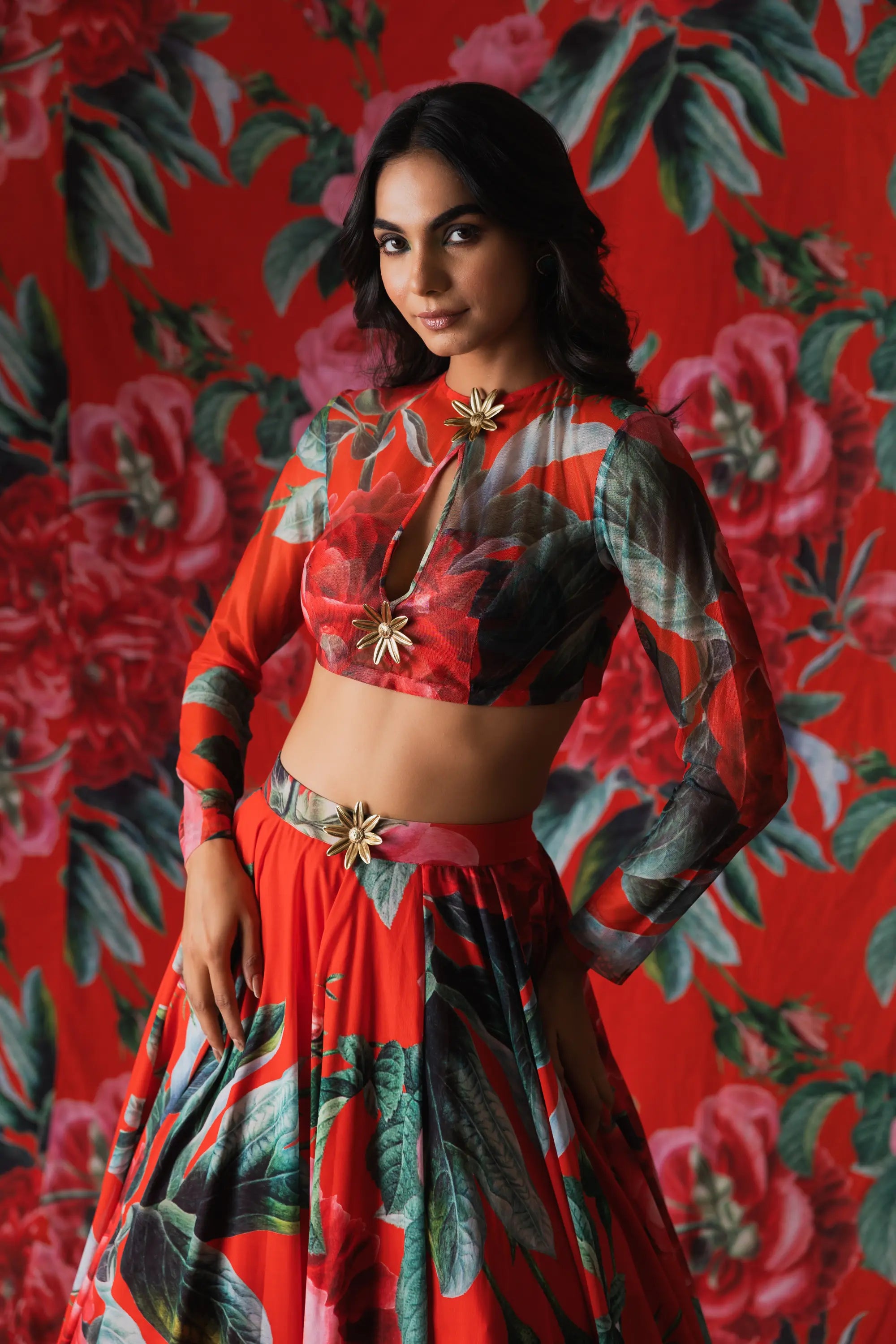 This red floral print lehenga set is a stunning fusion of traditional charm and modern vibrancy. The rich red lehenga, adorned with delicate floral prints, offers a bold yet elegant look, making it the perfect choice for weddings, festive occasions, and celebrations. The intricate floral patterns on the lehenga evoke a sense of timeless beauty, while the flowing silhouette creates a graceful and flattering shape.