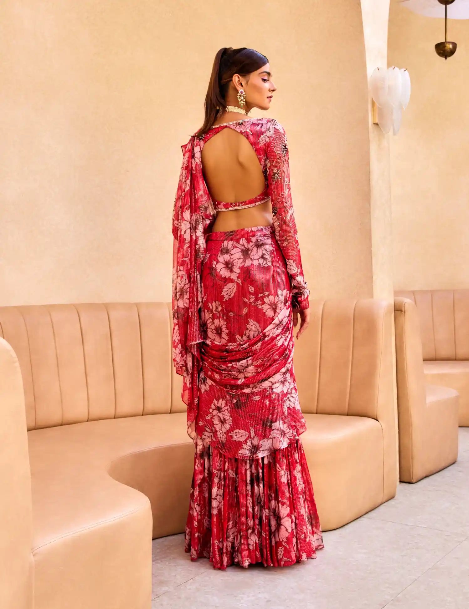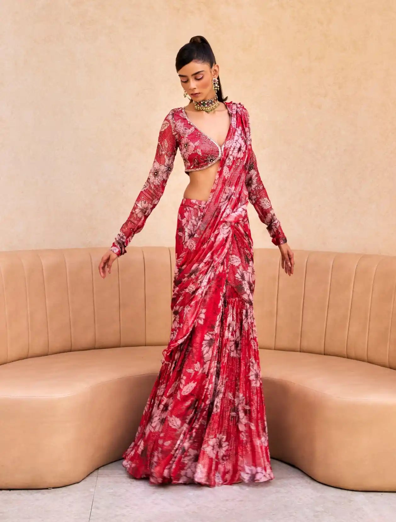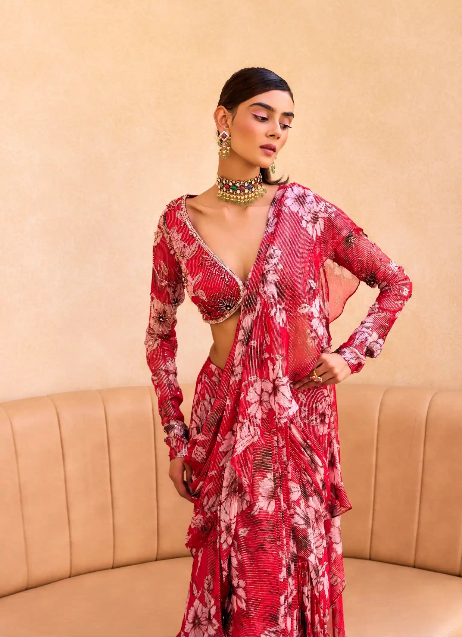 Elevate your elegance with this stunning red and pink floral printed ruffle saree, crafted from lightweight chiffon with shimmering lurex stripes. The graceful ruffles add a dynamic touch, while the hand-embroidered blouse features a chic V neckline and a scalloped design at the waist, enhancing your silhouette beautifully. Perfect for festive occasions or special celebrations, this saree combines traditional charm with modern flair, ensuring you make a memorable impression wherever you go!