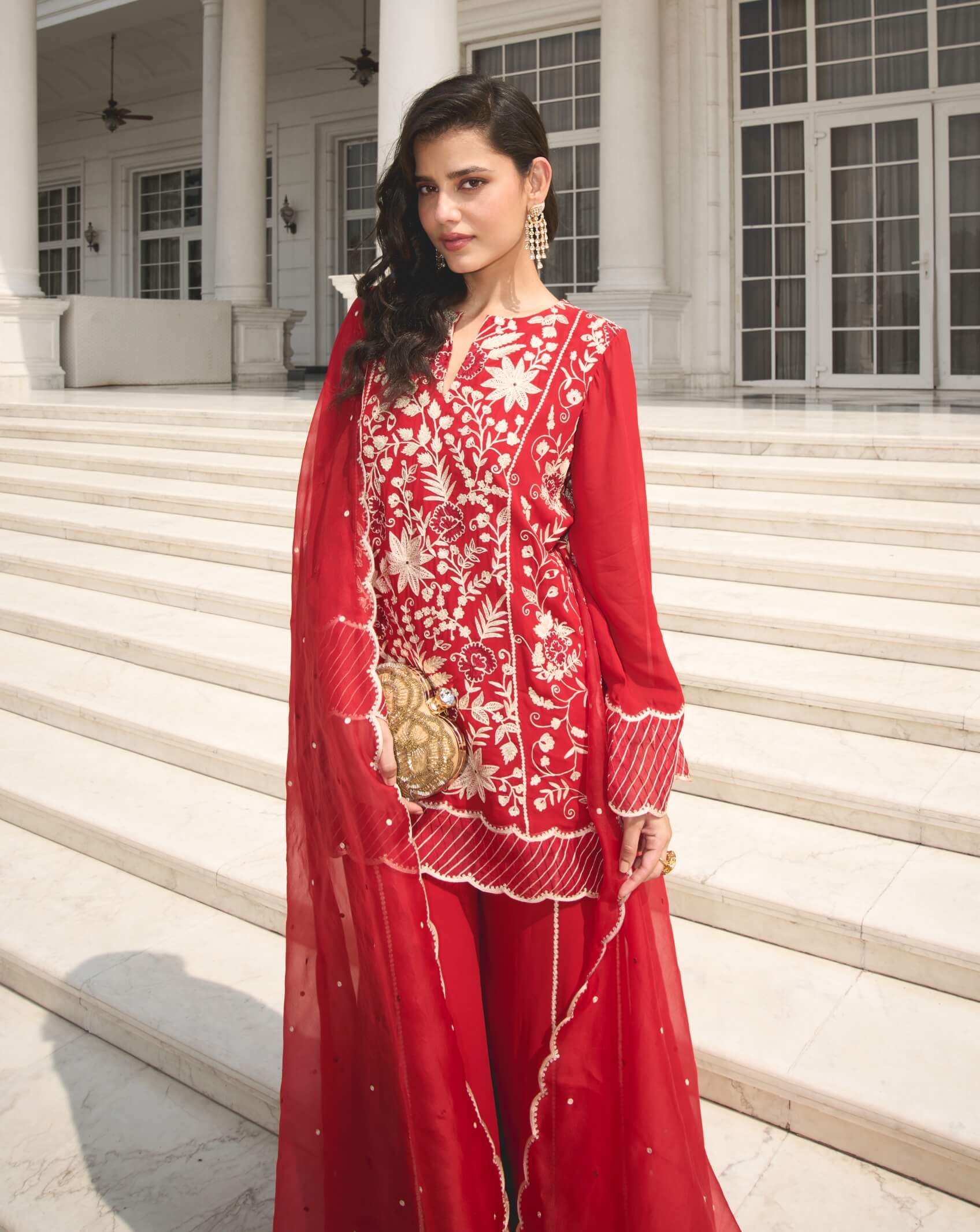 Step into elegance with our red georgette kalidar kurta and pants set, a stunning blend of traditional craftsmanship and contemporary style. The kurta features intricate floral resham and zari aari work that adorns the entire piece, creating a rich texture and a vibrant visual appeal. The check detail embroidery at the sleeve hem adds a modern twist, enhancing the overall sophistication of the outfit.