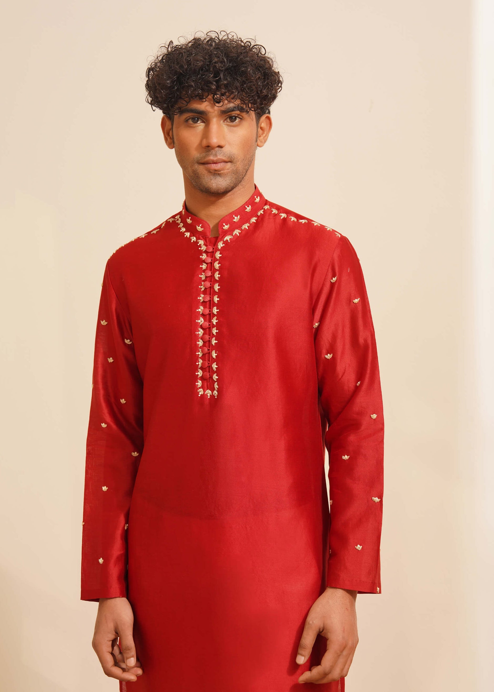 Introducing our vibrant red open Indo-jacket, showcasing an extended placket with sophisticated loop details and intricate hand embroidery throughout. This eye-catching piece blends traditional craftsmanship with modern design, offering a unique touch of elegance and charm. Ideal for adding a bold statement to any special occasion, this Indo-jacket combines refined artistry with contemporary style, making it a standout addition to your wardrobe.