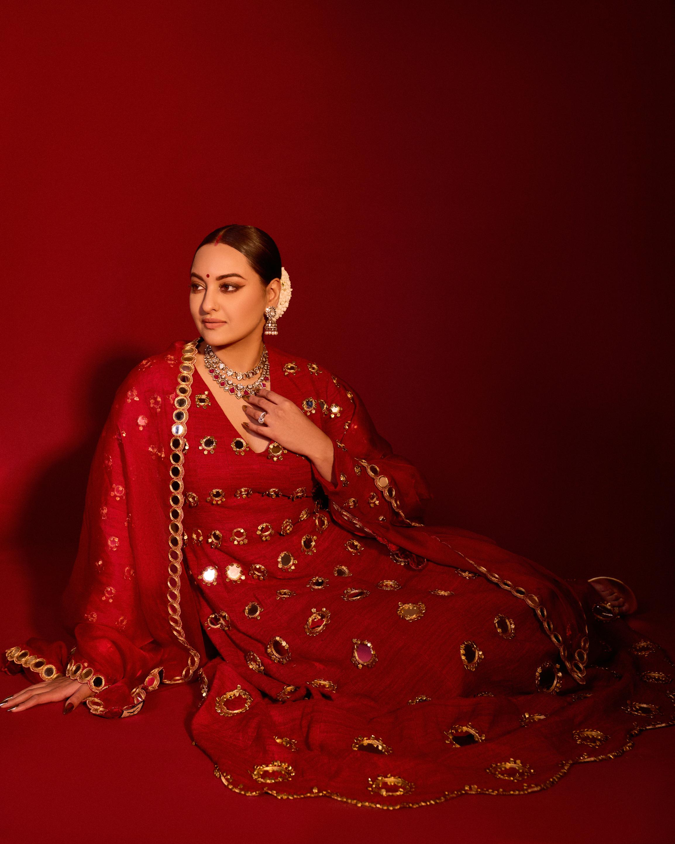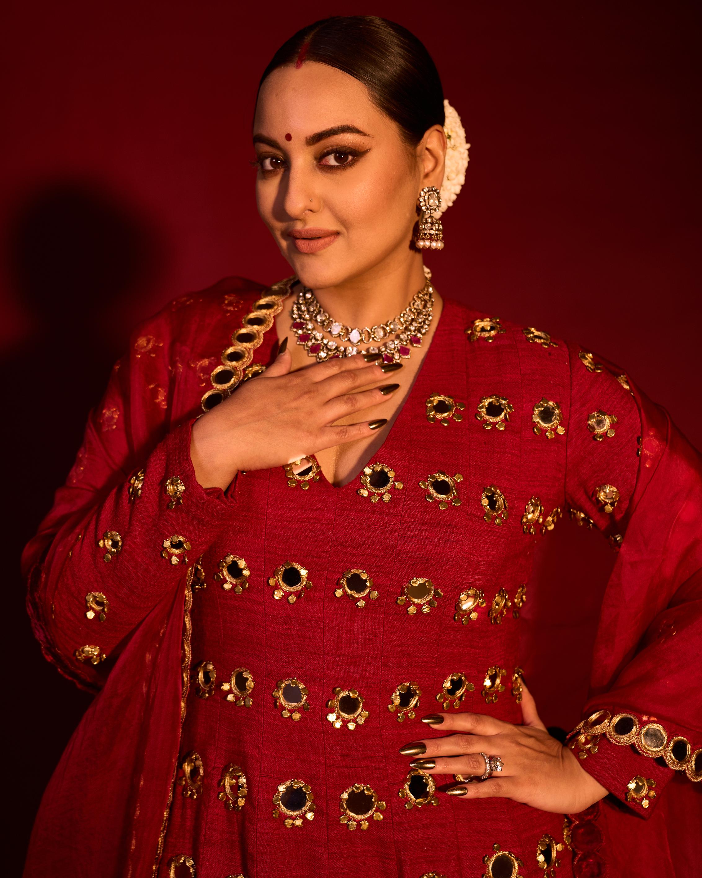 This red Anarkali, crafted from luxurious khaddar silk, features intricate real mirror and ghungroo work on the kurta and pants, exuding timeless elegance. Paired with a lightweight organza dupatta adorned with a delicate mirror border, this ensemble is the perfect choice for weddings and festive celebrations, blending tradition with sophistication.