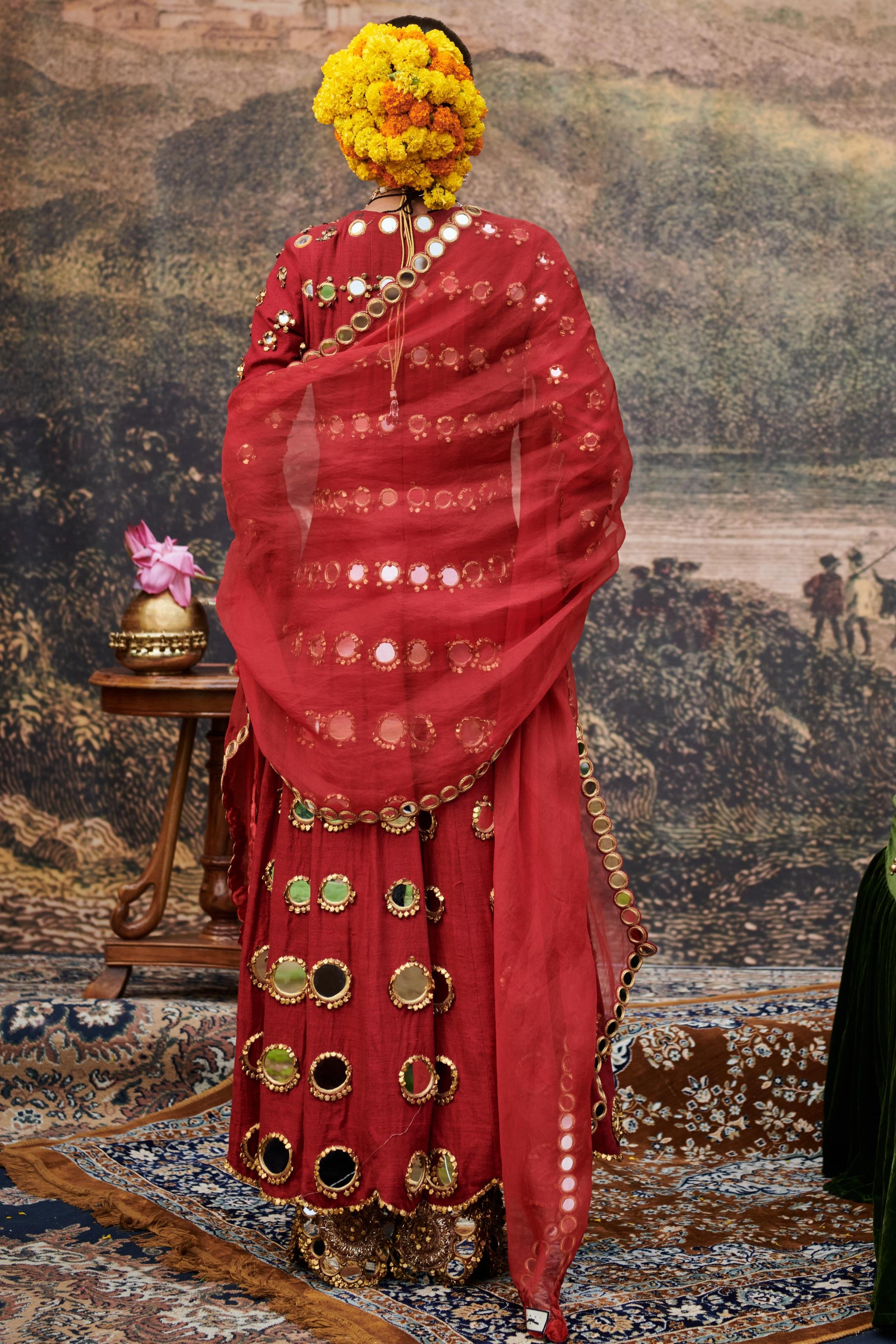 This red Anarkali crafted from luxurious khaddar silk features intricate real mirror and ghungroo work on the kurta and pants exuding timeless elegance. Paired with a lightweight organza dupatta adorned with a delicate mirror border this ensemble is the perfect choice for weddings and festive celebrations blending tradition with sophistication.