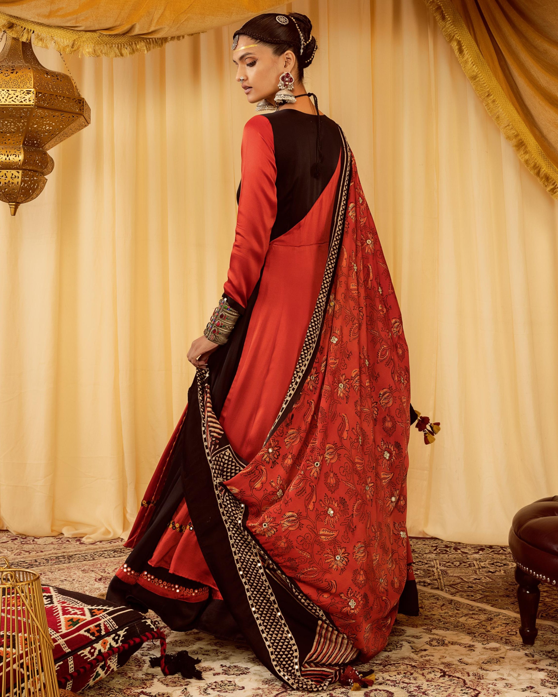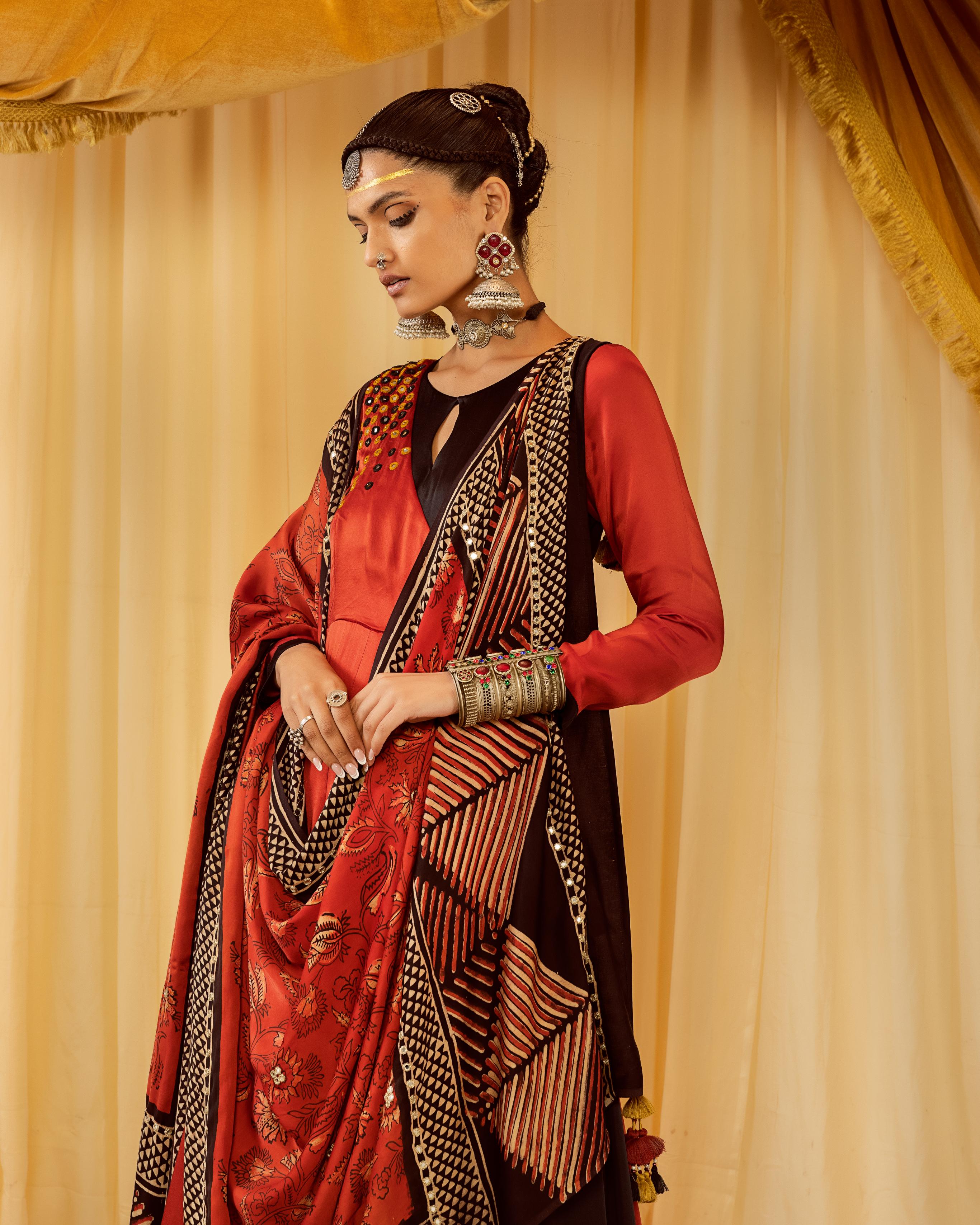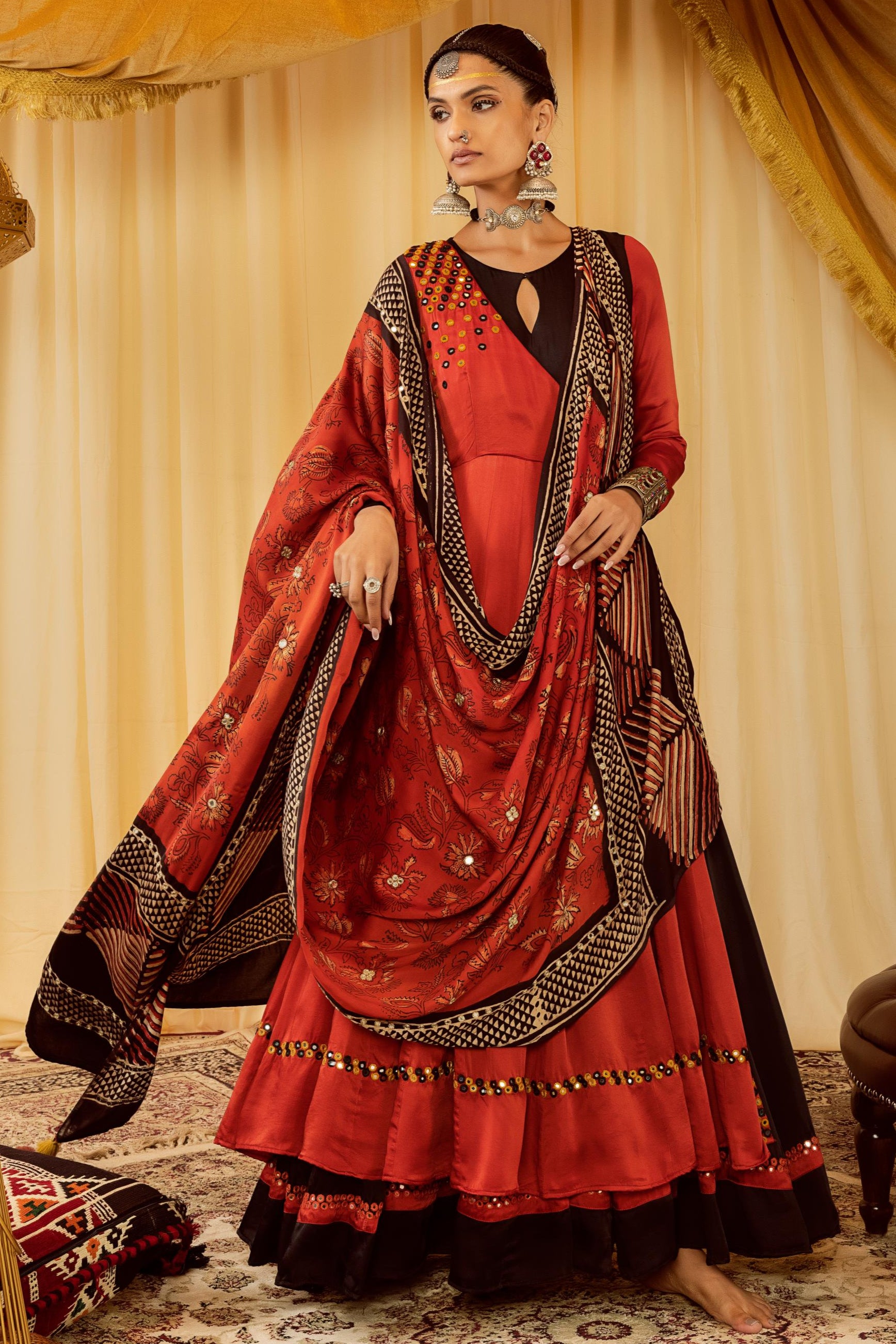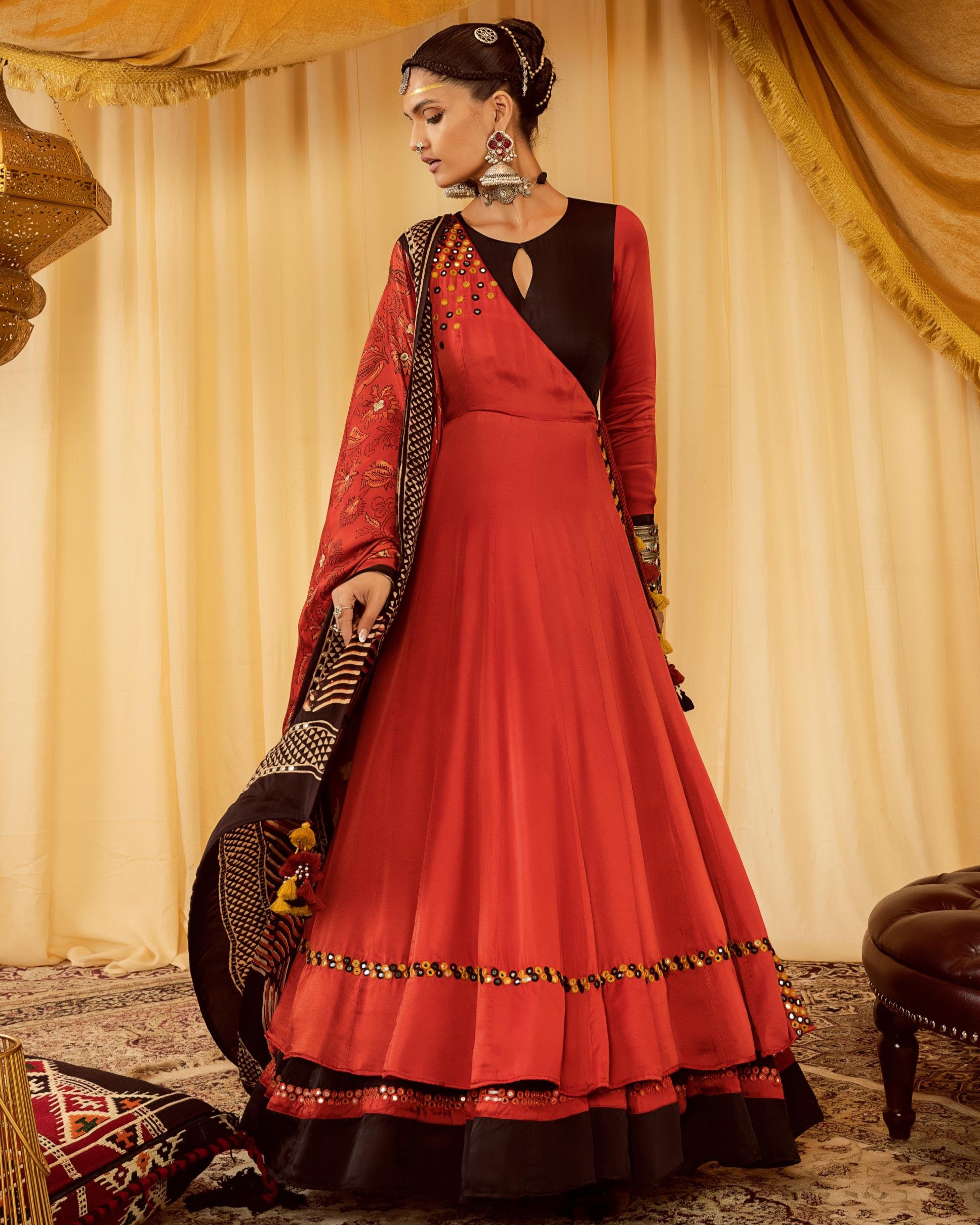 This elegant two-tiered Angrakha set is designed with a striking contrast tier and intricate mirror work embellishing the hem and length. Paired with a beautifully block-printed dupatta and a classic black churidaar, this ensemble is a perfect blend of tradition and contemporary charm, making it an ideal choice for festive celebrations.