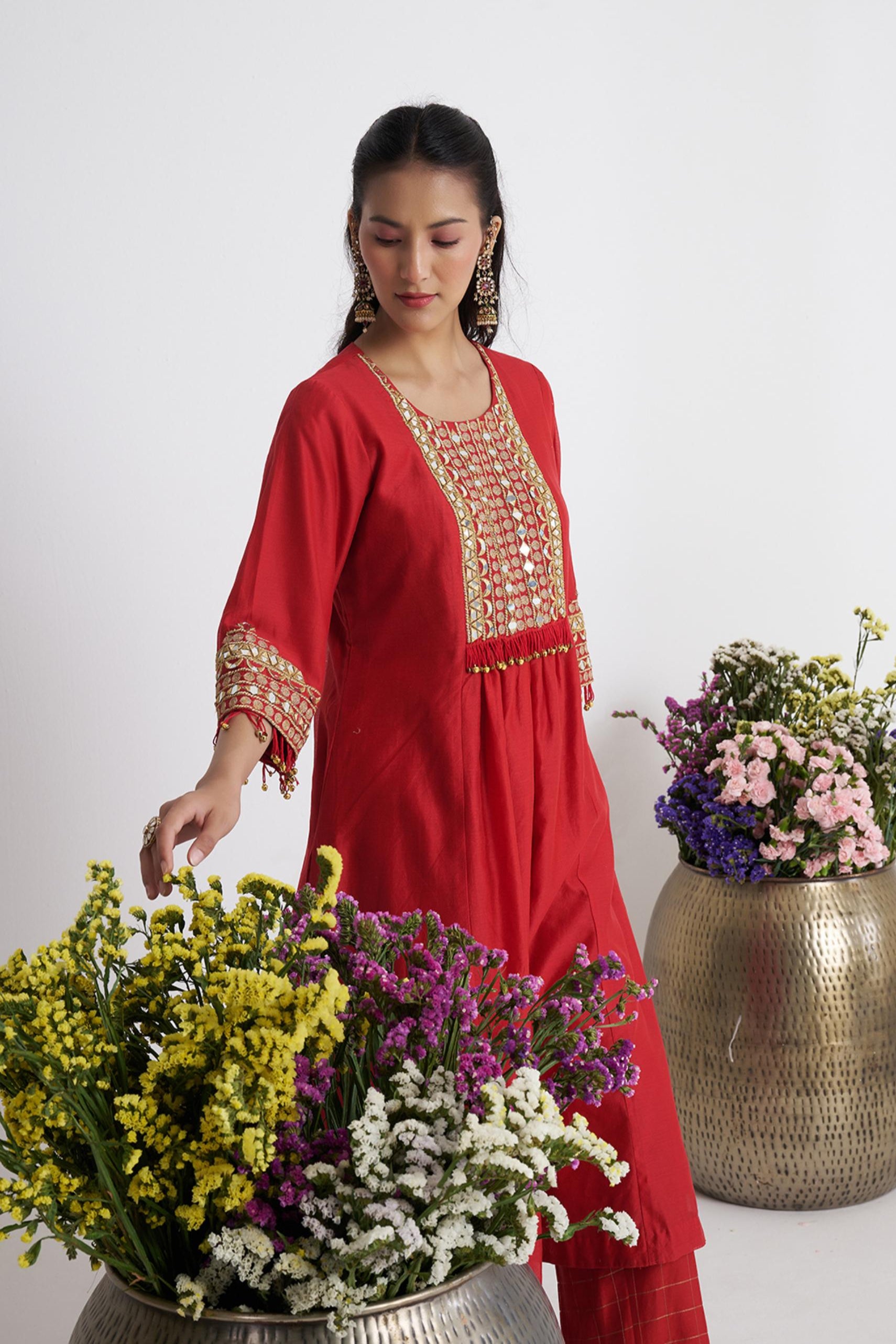 Flowing with movement and rich in detail, the Red Lehraata Resham Kurta Set beautifully captures the poetry of tradition. Featuring graceful wave-like patterns (lehraata) delicately embroidered in resham threadwork, this striking red ensemble embodies elegance and fluidity. The kurta’s refined detailing is balanced by tailored bottoms and a matching dupatta, making it ideal for festive occasions, wedding events, or cultural gatherings. The Red Lehraata Resham Kurta Set is for those who appreciate subtle artistry and timeless design with a modern flair.