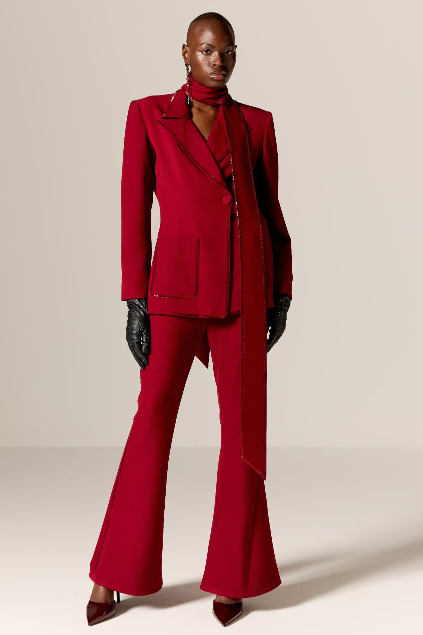 The Red Luna Eminence Co-ord Set commands attention with bold color and strong tailoring. A fitted blazer paired with matching trousers creates a fierce, confident silhouette. Perfect for fashion-forward formal events. Its clean lines are balanced by rich, dramatic energy. A power look for statement moments.