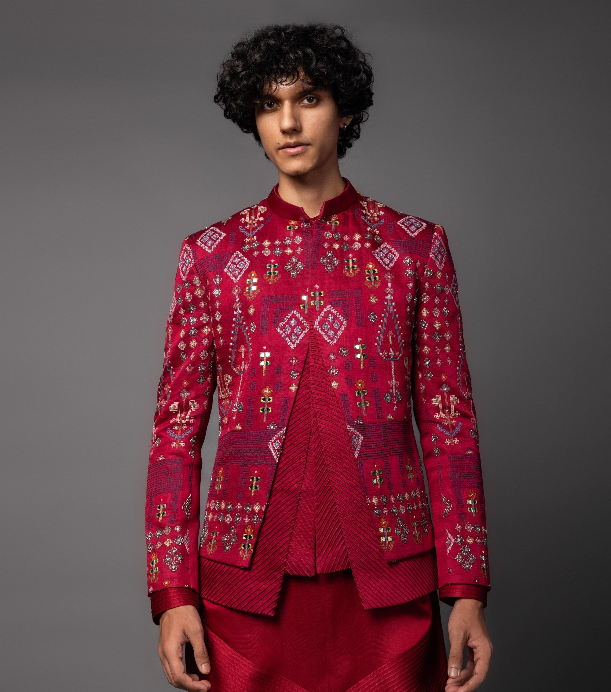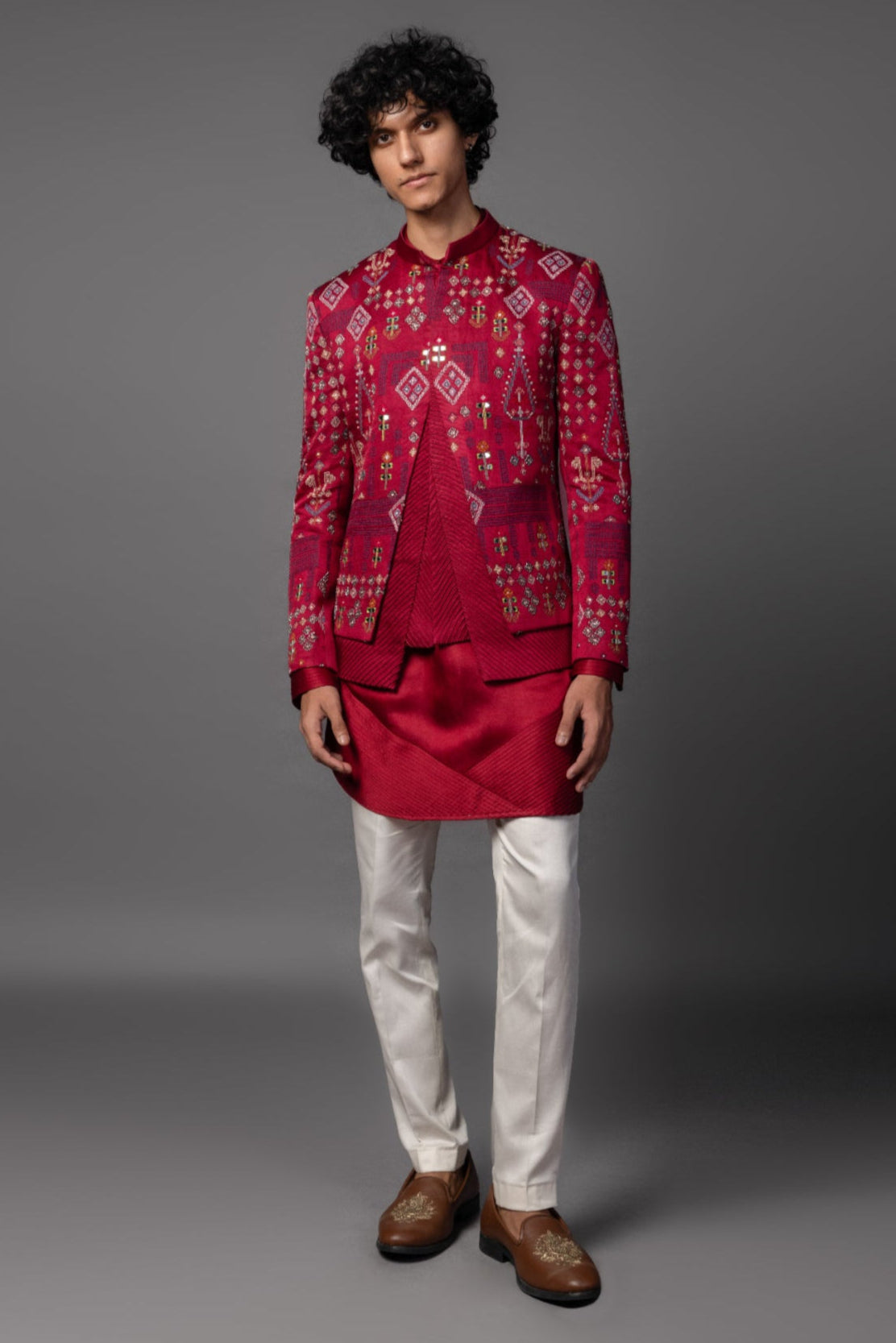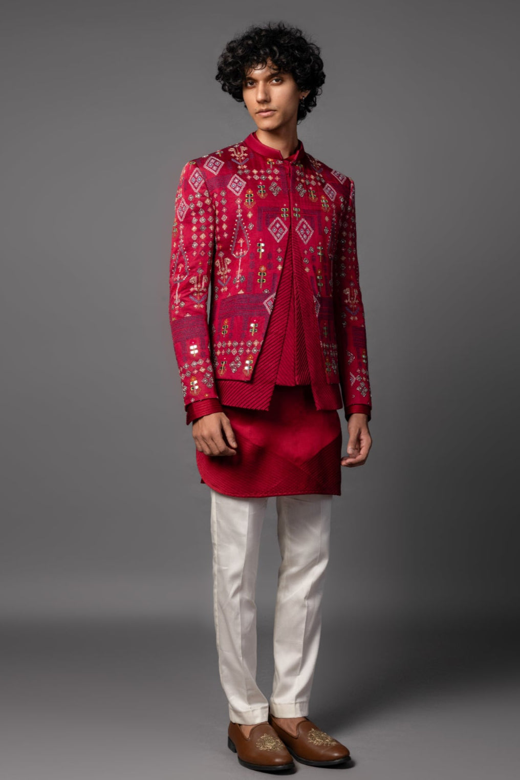 Make a bold and sophisticated statement with our Red Marwar-Jacket with Kurta and Pajama, a stunning ensemble that effortlessly blends regal tradition with contemporary flair. The striking red color of the Marwar jacket symbolizes strength and elegance, while its intricate design and craftsmanship reflect the royal heritage of Rajasthan. Paired with a classic kurta and pajama, this set is perfect for weddings, receptions, or other formal events. Whether you're the groom or a distinguished guest, this outfit ensures you stand out with its timeless appeal and modern style.