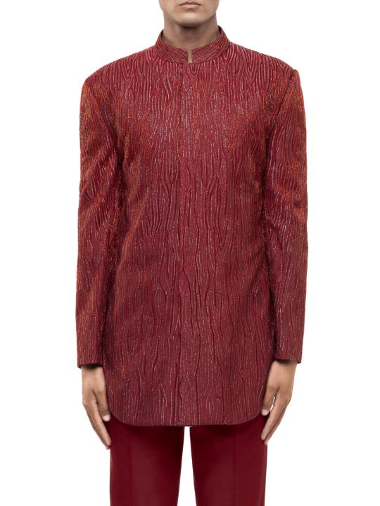 Vibrant and regal, this Red Silk Metallic Threads Embroidered Sherwani Set features intricate metallic thread embroidery that adds shimmering elegance. Crafted from luxurious silk, it showcases a stand collar, concealed placket, and refined Mother of Pearl buttons. The round hem and regular fit create a distinguished silhouette, perfect for weddings and grand celebrations where bold style meets tradition.