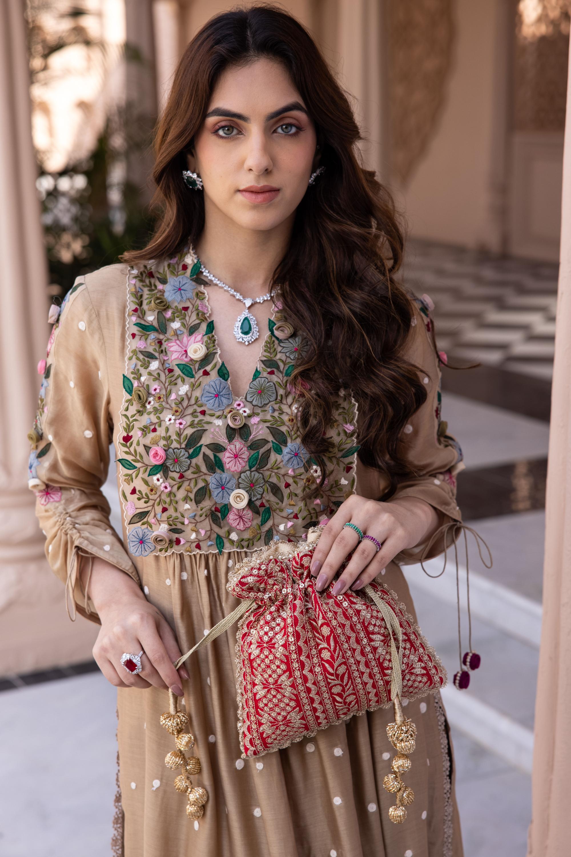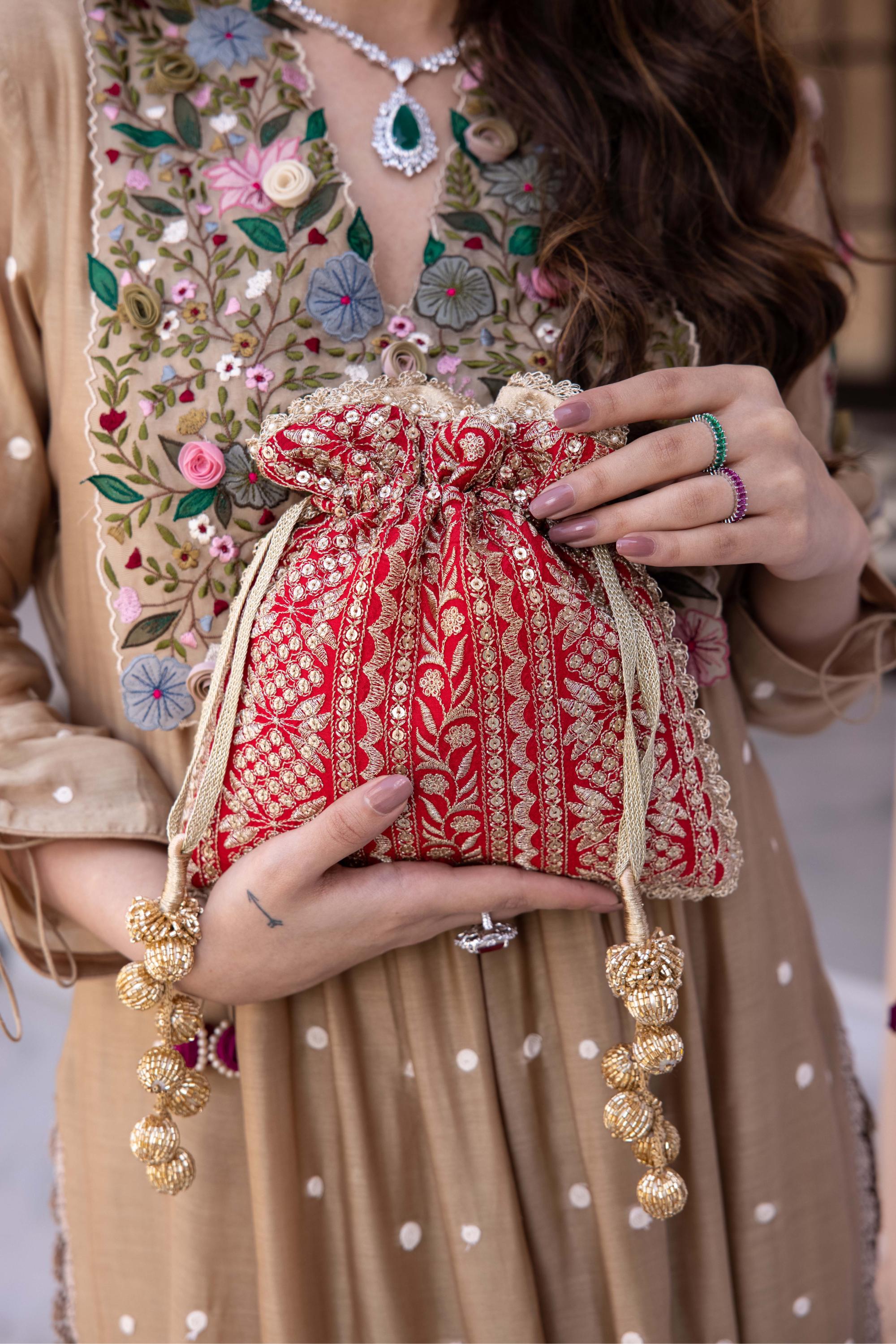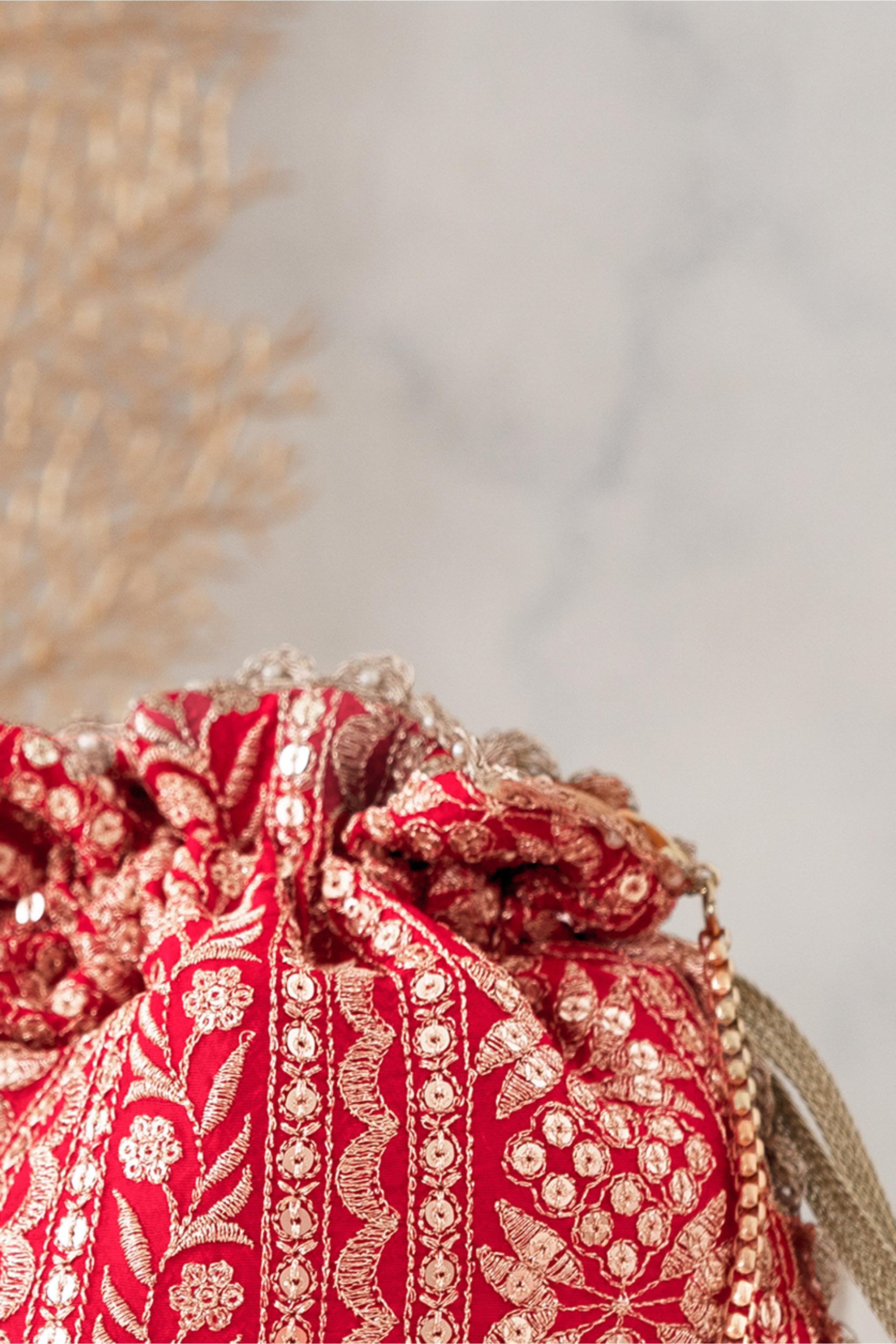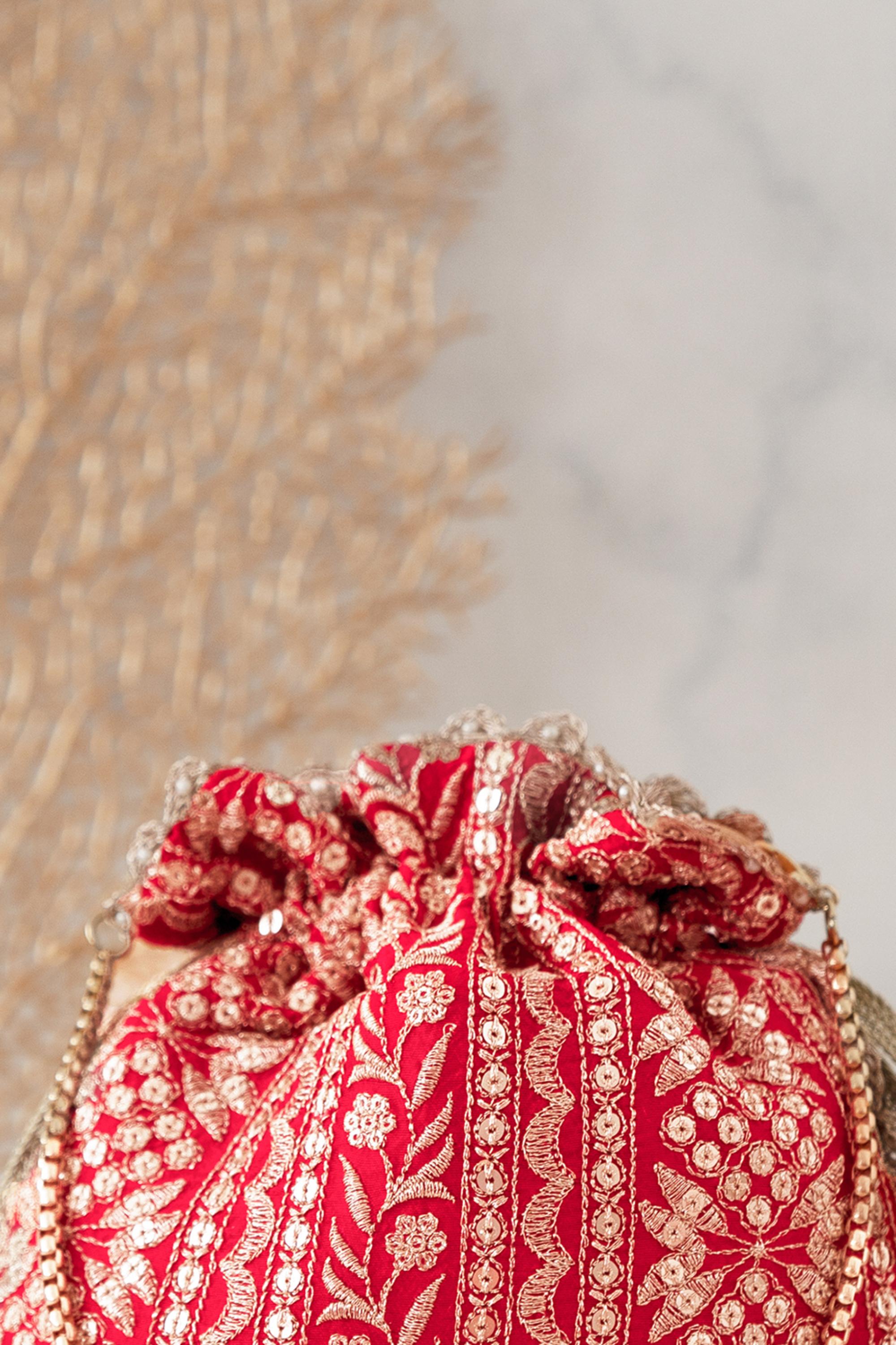 The Red Mirai Potli is a timeless accessory that radiates festive elegance. Crafted in a rich red hue with intricate detailing, this potli is perfect for weddings, traditional ceremonies, and special occasions. The classic drawstring closure and spacious interior combine functionality with charm. A bold and beautiful piece, it's ideal for those who appreciate heritage craftsmanship and vibrant style.
