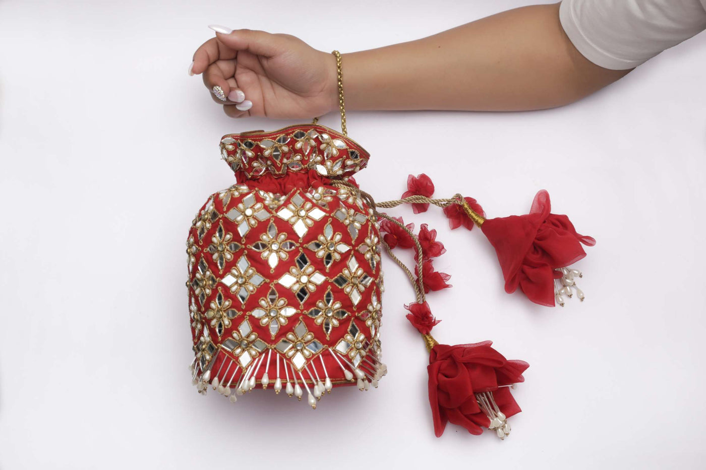 This stunning potli clutch features an intricate jaali pattern formed by delicately arranged mirror and pearl work. Enhanced with exquisite embroidery, it incorporates Kundan and dori detailing, creating a rich and elegant design. The signature handcrafted flower tassels, a unique USP of the brand, add a finishing touch perfect for weddings, festive celebrations, and grand occasions.