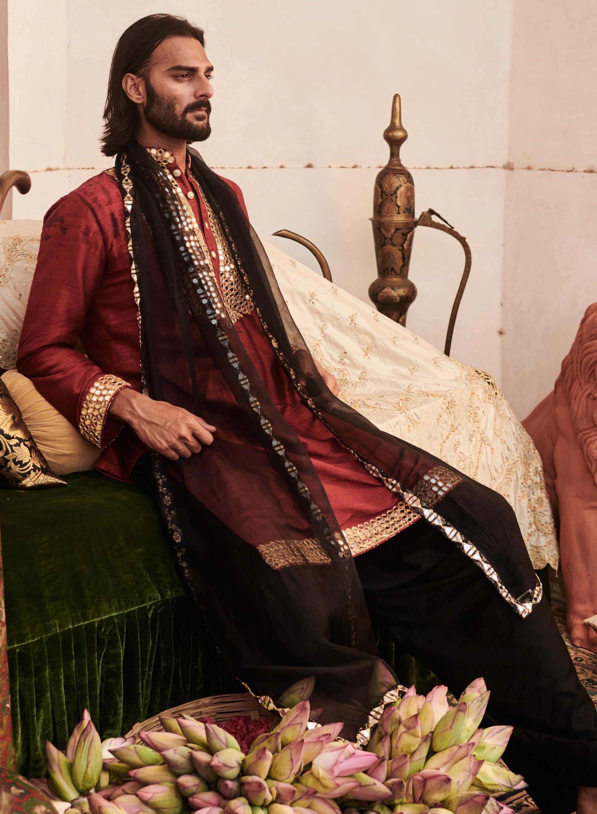 This striking red raw silk kurta features intricate mirror work on the neckline and full sleeves, adding a touch of elegance. Paired with a black cotton salwar for comfort, the look is completed with a delicate organza stole for a graceful pop of texture. Perfect for festive occasions, this ensemble blends tradition with modern charm.