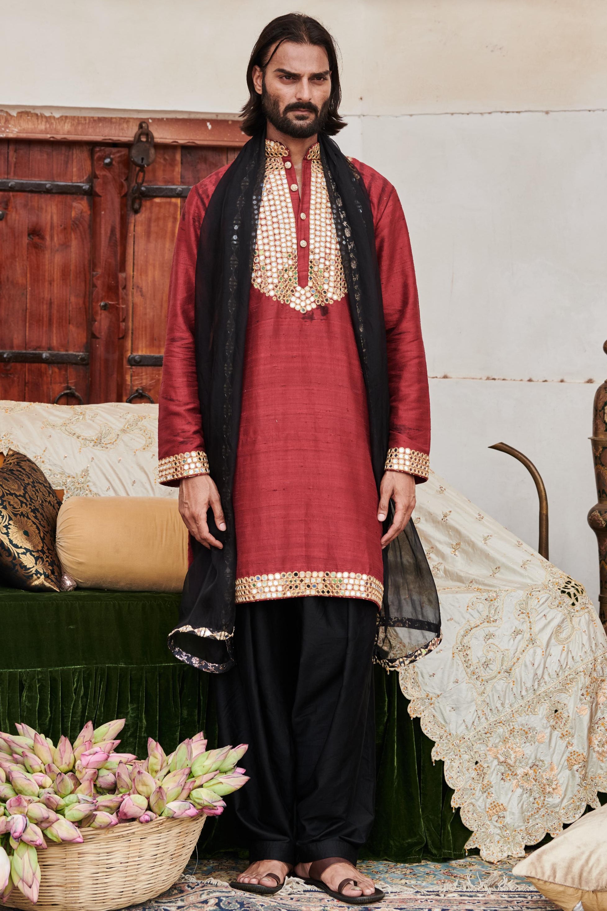 This striking red raw silk kurta features intricate mirror work on the neckline and full sleeves adding a touch of elegance. Paired with a black cotton salwar for comfort the look is completed with a delicate organza stole for a graceful pop of texture. Perfect for festive occasions this ensemble blends tradition with modern charm.