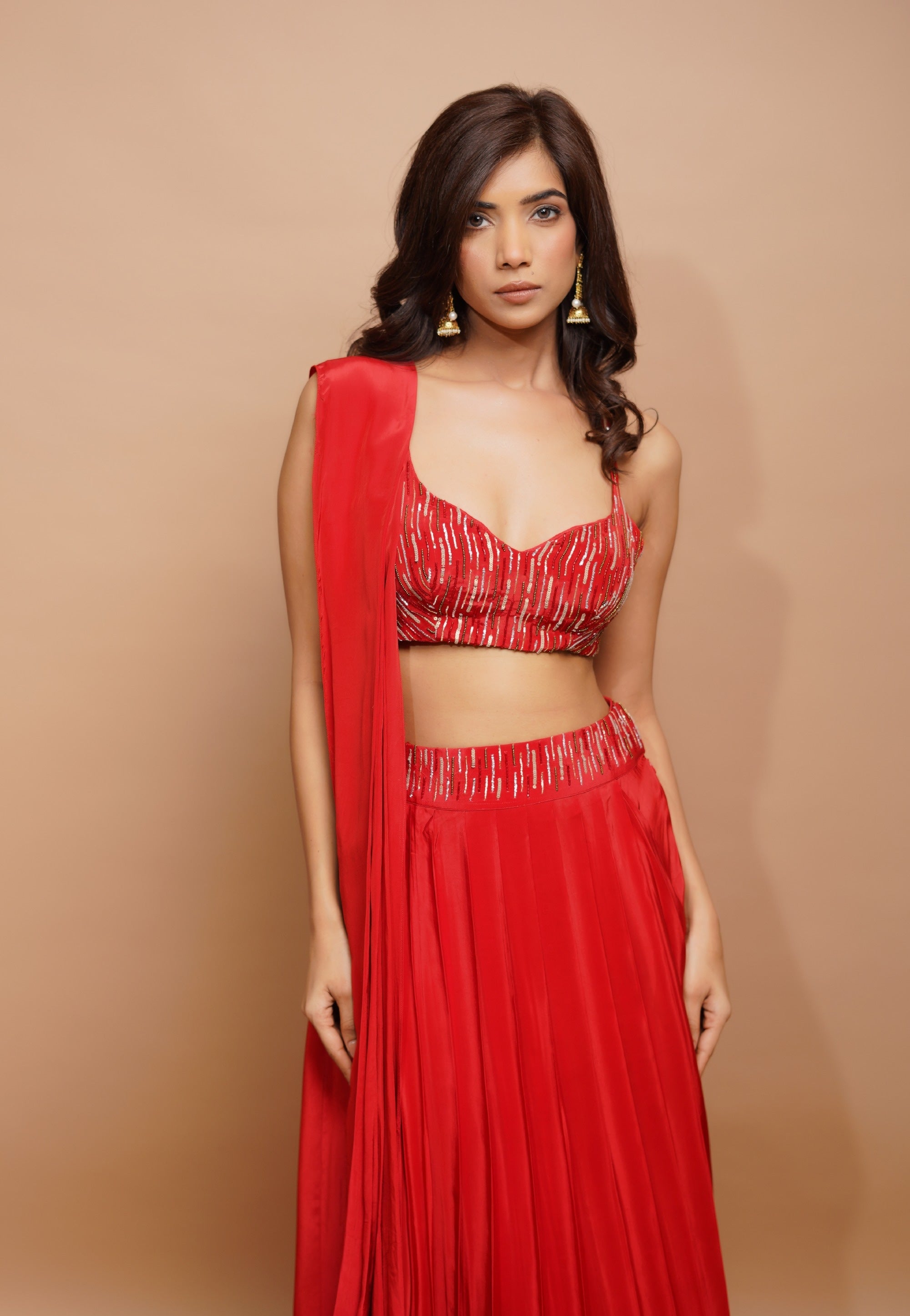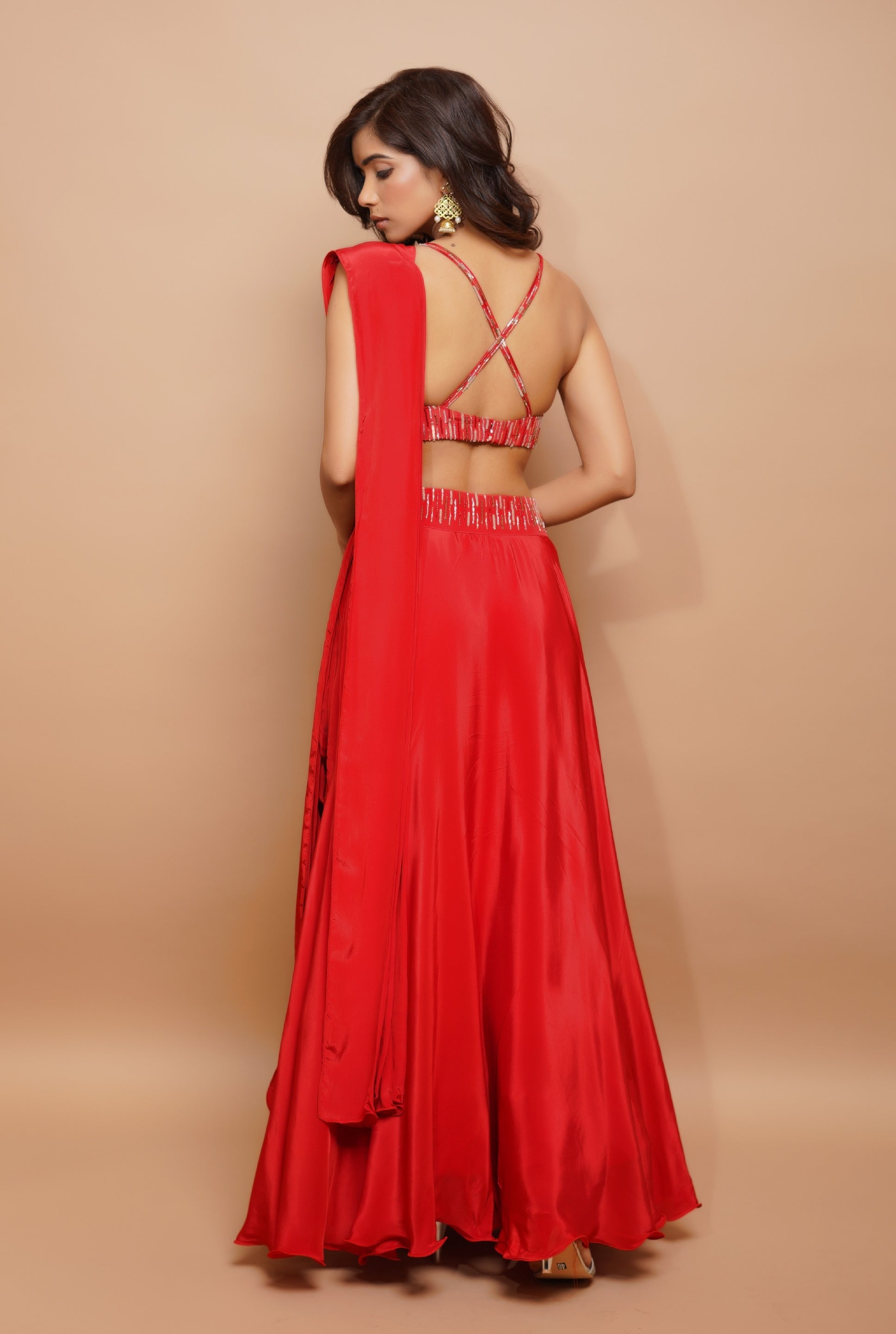 Discover elegance with this stunning set featuring a padded bustier exquisitely detailed with intricate handwork of sequins, cutdana, zardosi, and moti. The high-waist lehenga boasts a beautifully handworked belt that mirrors the detailed embellishments of the bustier, creating a cohesive and sophisticated look. Completing the ensemble is a plain dupatta, seamlessly attached to the lehenga, enhancing the overall grace of the outfit. Ideal for a grand occasion, this set combines classic craftsmanship with contemporary flair.