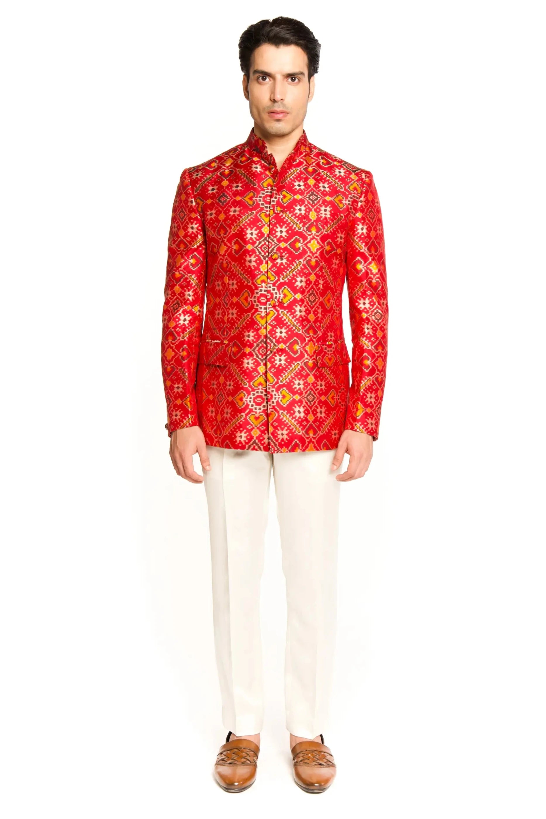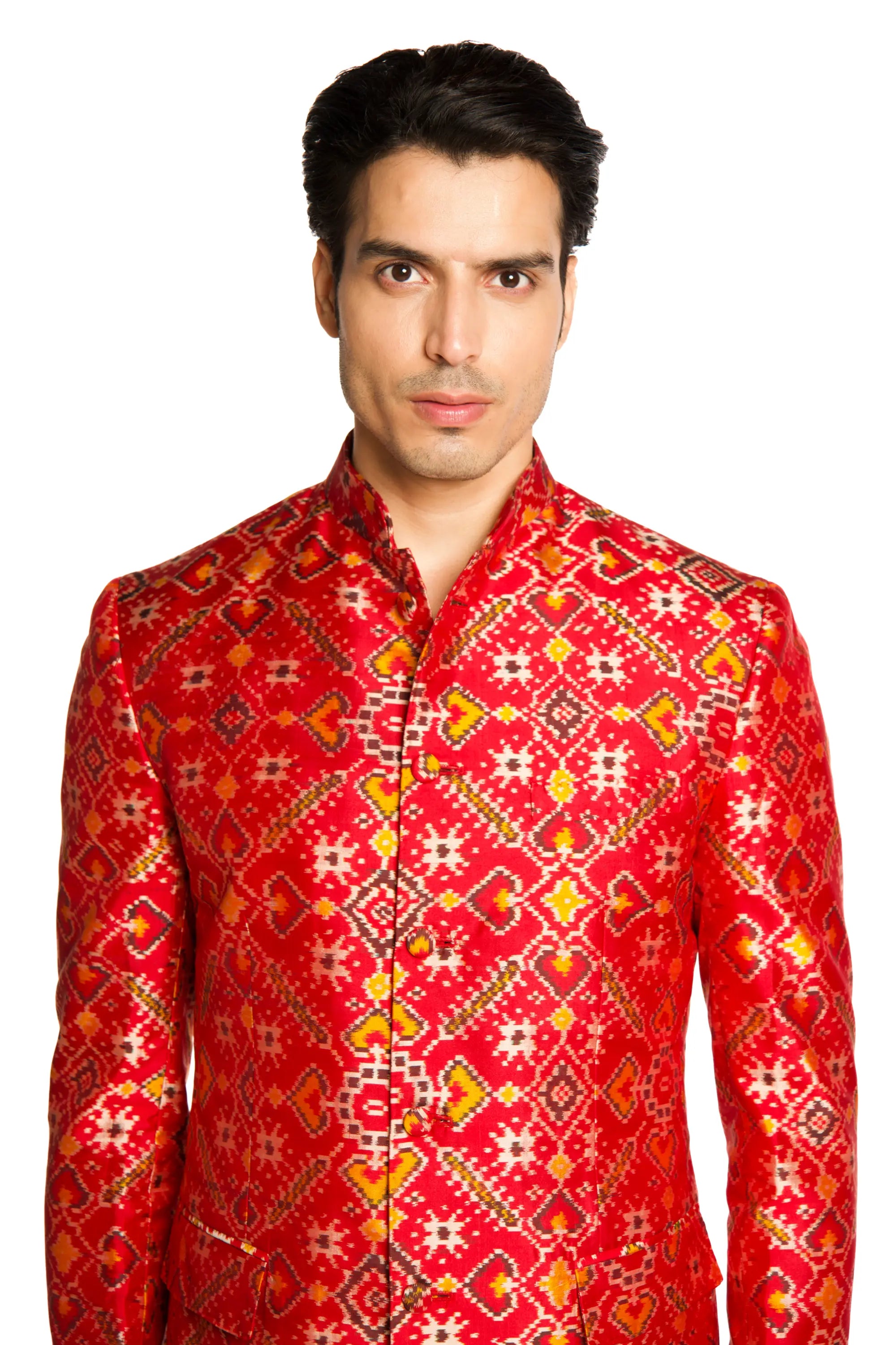 Make an unforgettable impression with the Red Patola Bandgala Suit, a stunning fusion of traditional artistry and contemporary design. The vibrant red fabric features intricate Patola patterns, renowned for their rich colors and timeless motifs. The classic bandgala silhouette elevates the overall design, combining the elegance of traditional Indian attire with modern sophistication.