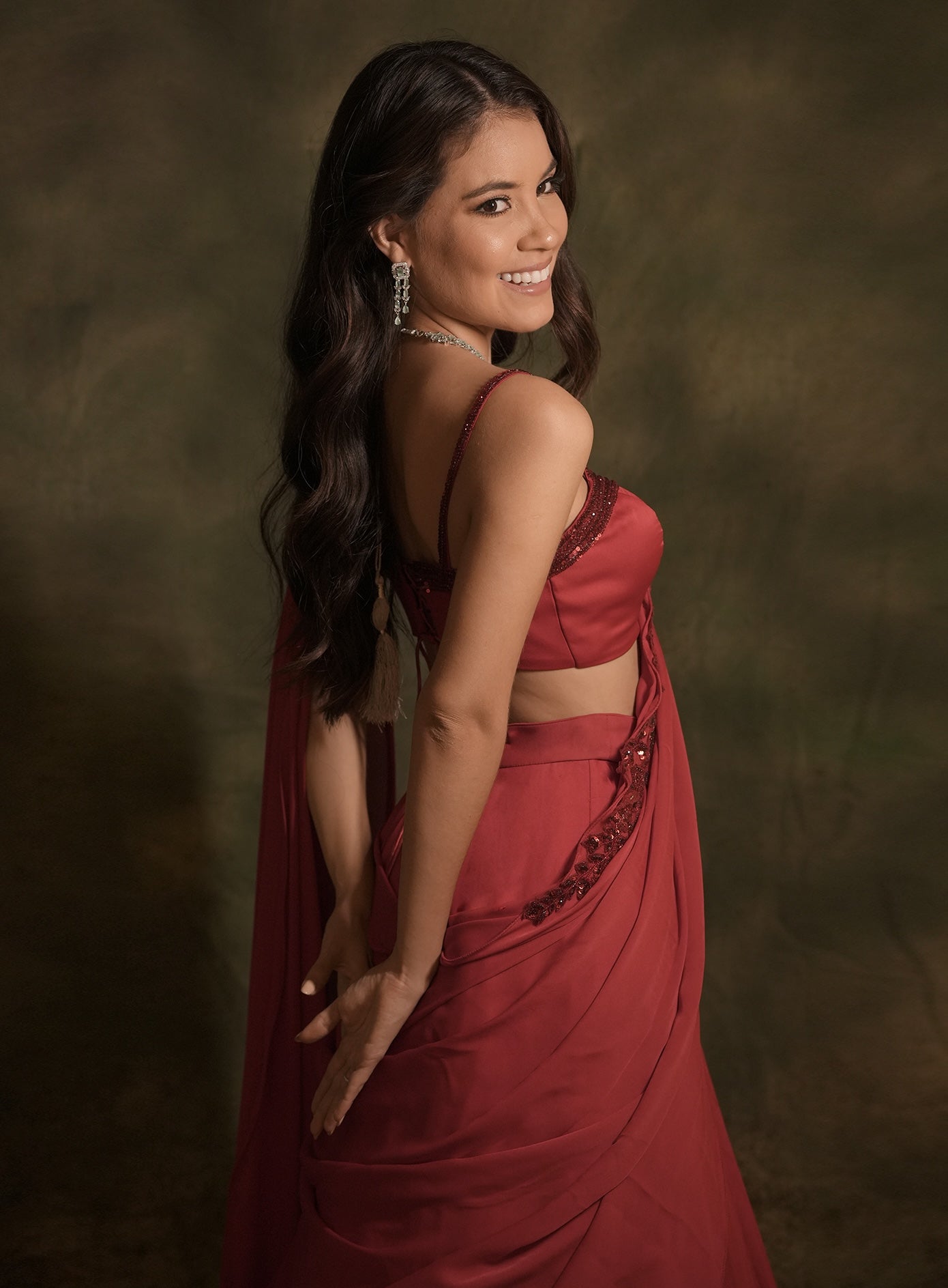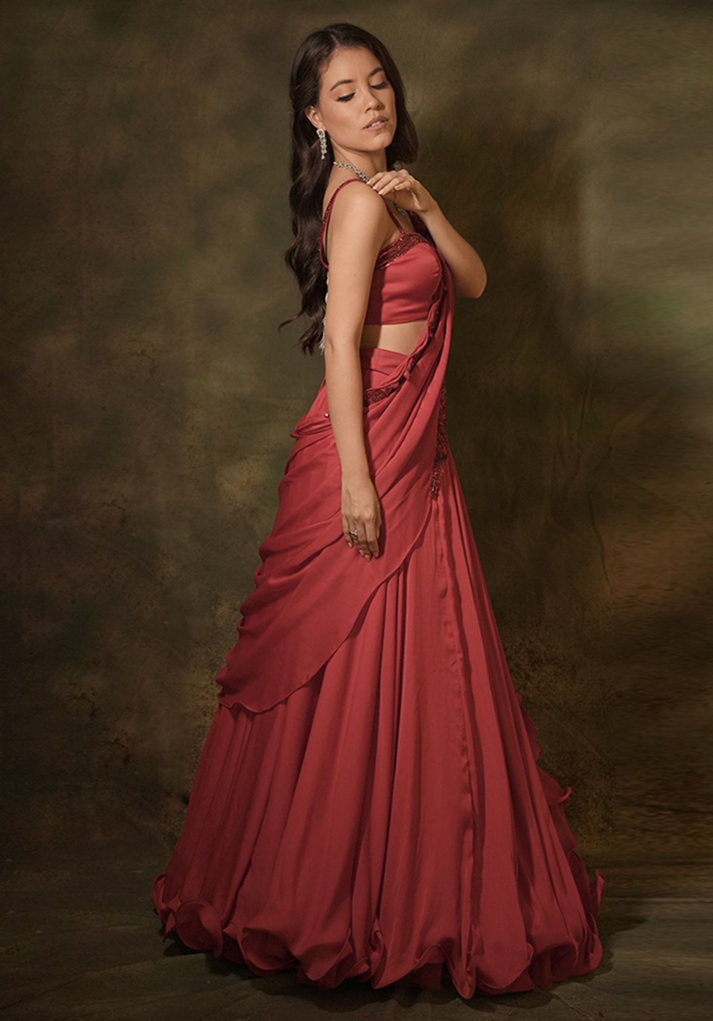 Immerse yourself in elegance with this exquisite outfit, where shimmering floral embroidery meets contemporary ruffles. The drape features delicate floral brooches embroidered at both the waistline and shoulder, adding a touch of sophistication. The pre-stitched skirt saree is paired with a perfectly coordinated blouse, creating a harmonious and polished look. Ideal for any special occasion, this ensemble seamlessly blends intricate detailing with modern design to ensure you stand out with grace and style.
